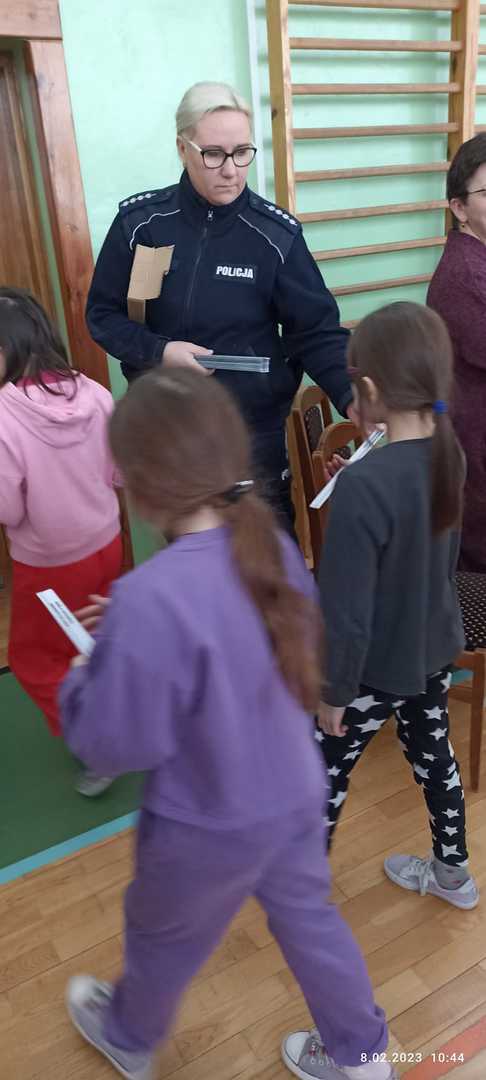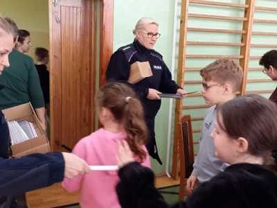 Pamiętajmy, że umiar i zdrowy rozsądek pozwolą nam cieszyć się zimową aurą. Na koniec spotkania każdy uczeń otrzymał opaskę odblaskową.