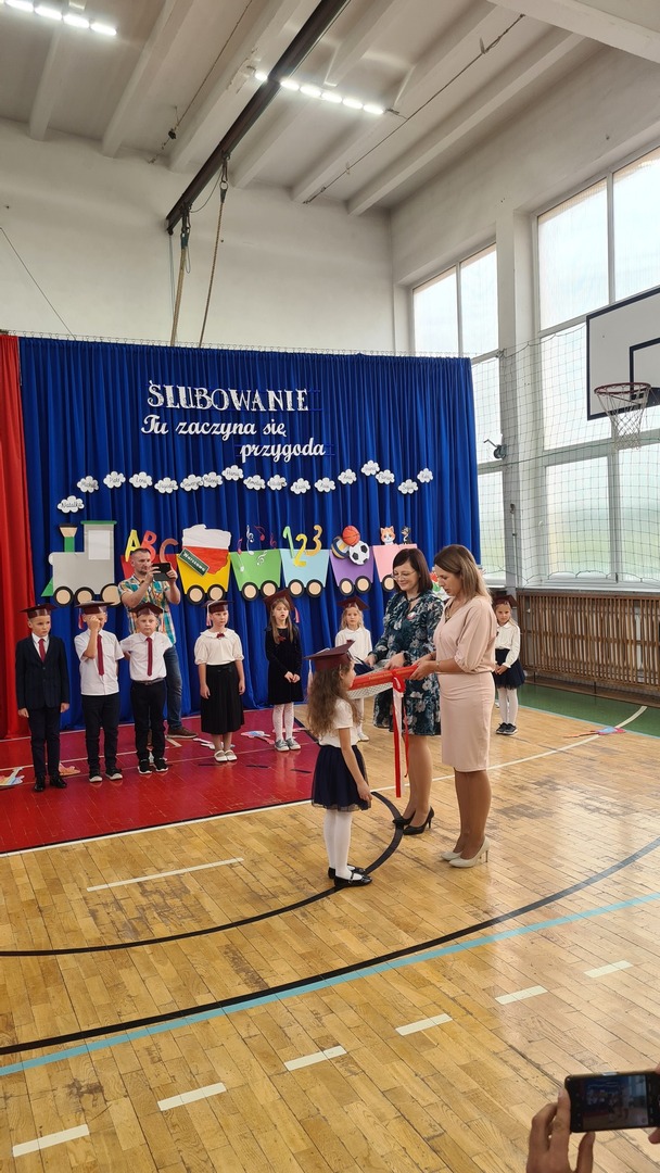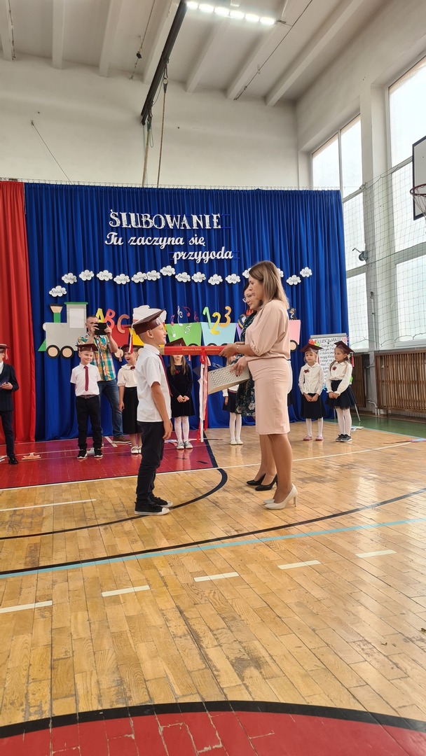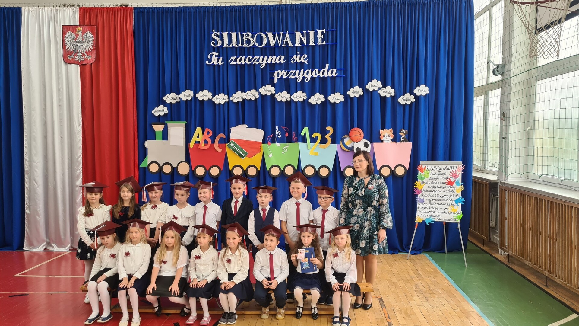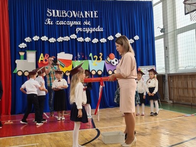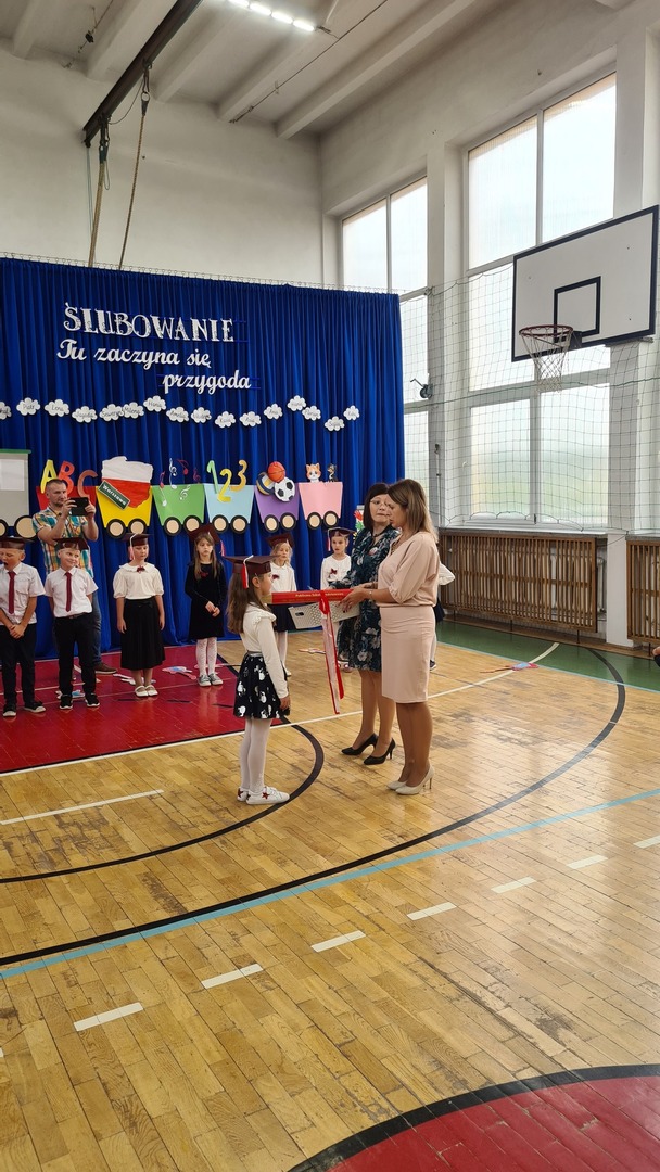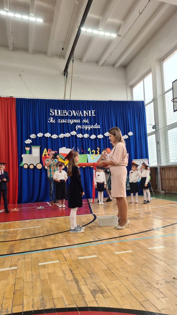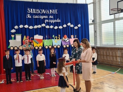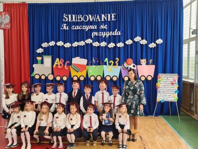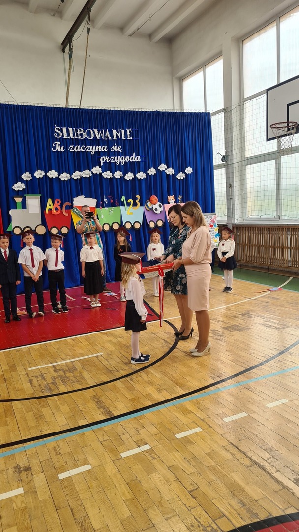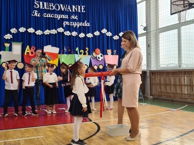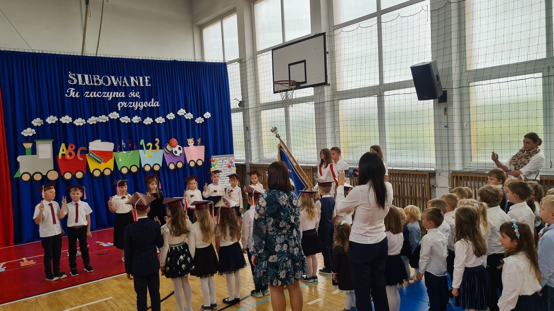 13 października 2023 roku 17 pierwszoklasistów w podniosłej atmosferze przed pocztem sztandarowym złożyło ślubowanie. Obiecali być wzorowymi uczniami, dbać o swoje zachowanie i poświęcać się nauce, by sprawiać radość nauczycielom i rodzicom. To ważny moment w życiu każdego ucznia, który symbolizuje ich zaangażowanie w proces edukacji. Pani dyrektor Agata Kępka symbolicznie pasowała ich na uczniów.