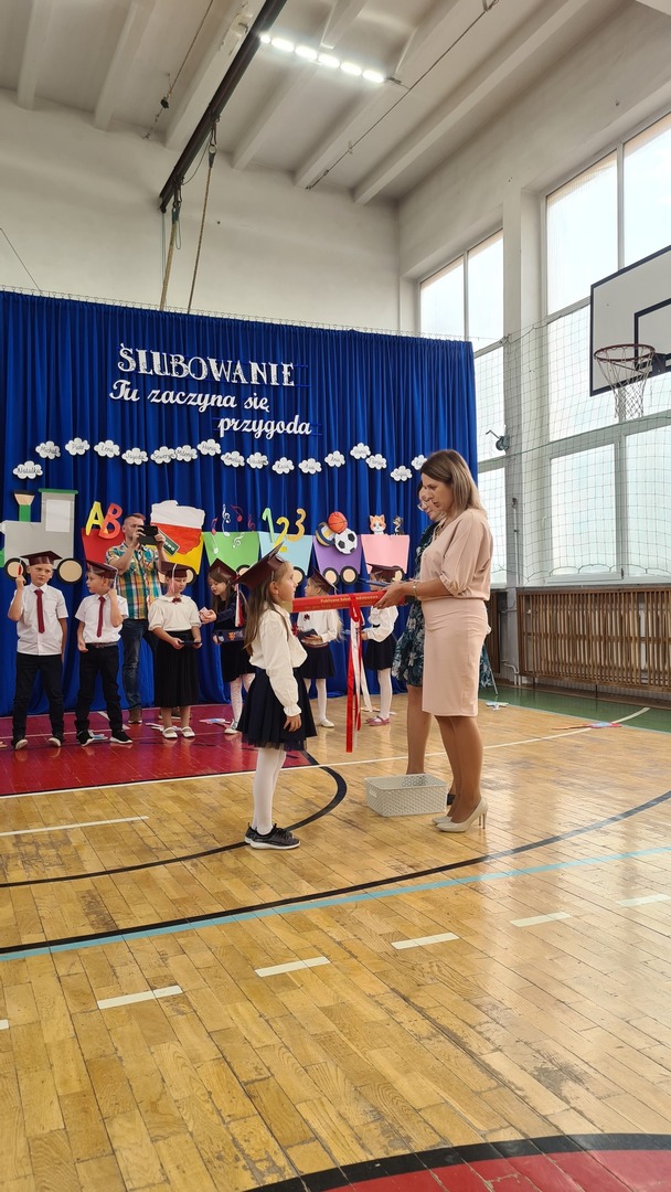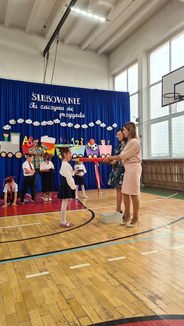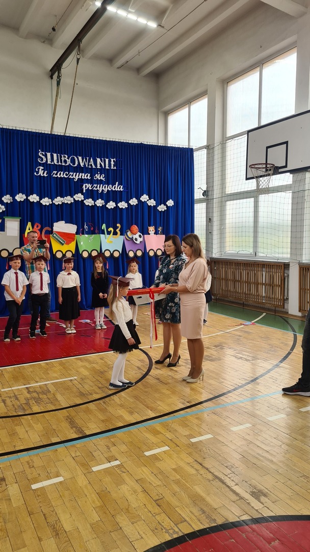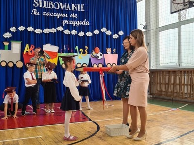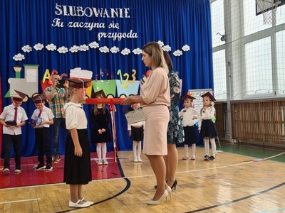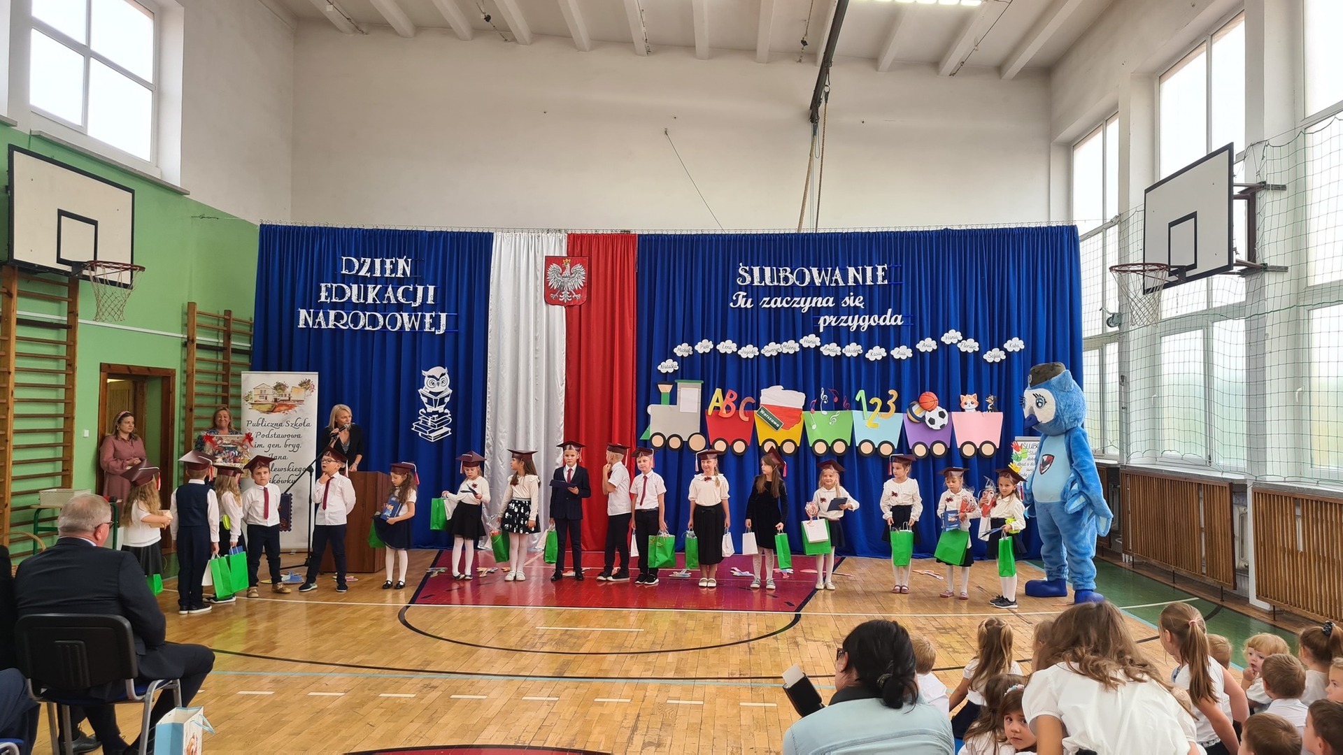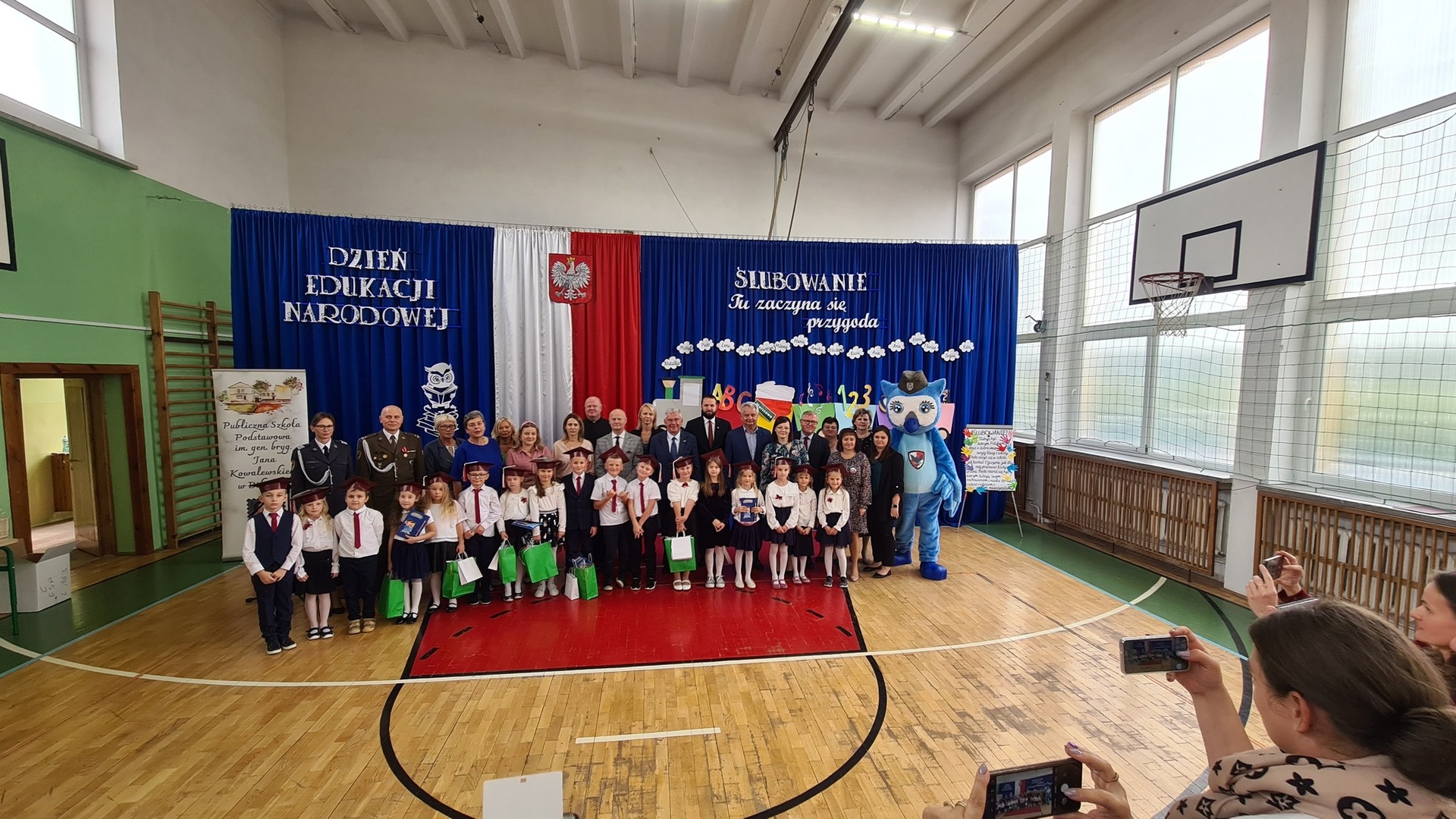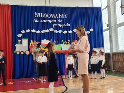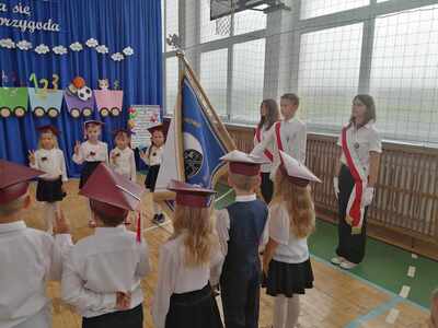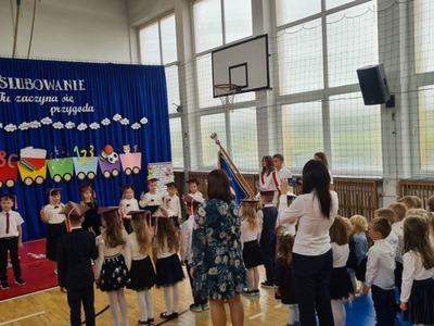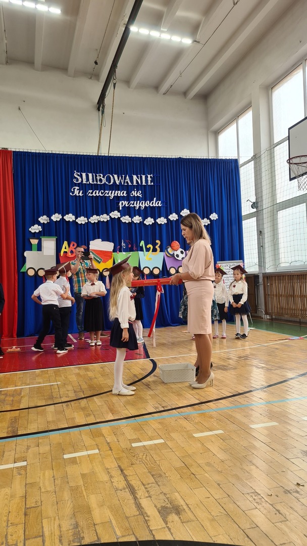 13 października 2023 roku 17 pierwszoklasistów w podniosłej atmosferze przed pocztem sztandarowym złożyło ślubowanie. Obiecali być wzorowymi uczniami, dbać o swoje zachowanie i poświęcać się nauce, by sprawiać radość nauczycielom i rodzicom. To ważny moment w życiu każdego ucznia, który symbolizuje ich zaangażowanie w proces edukacji. Pani dyrektor Agata Kępka symbolicznie pasowała ich na uczniów.