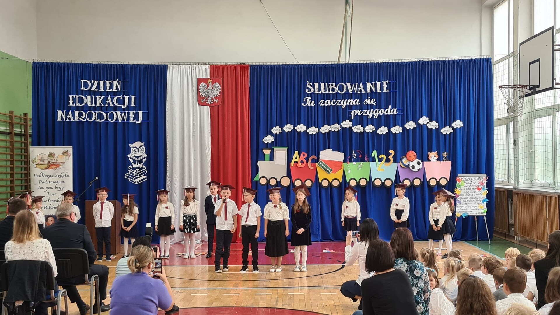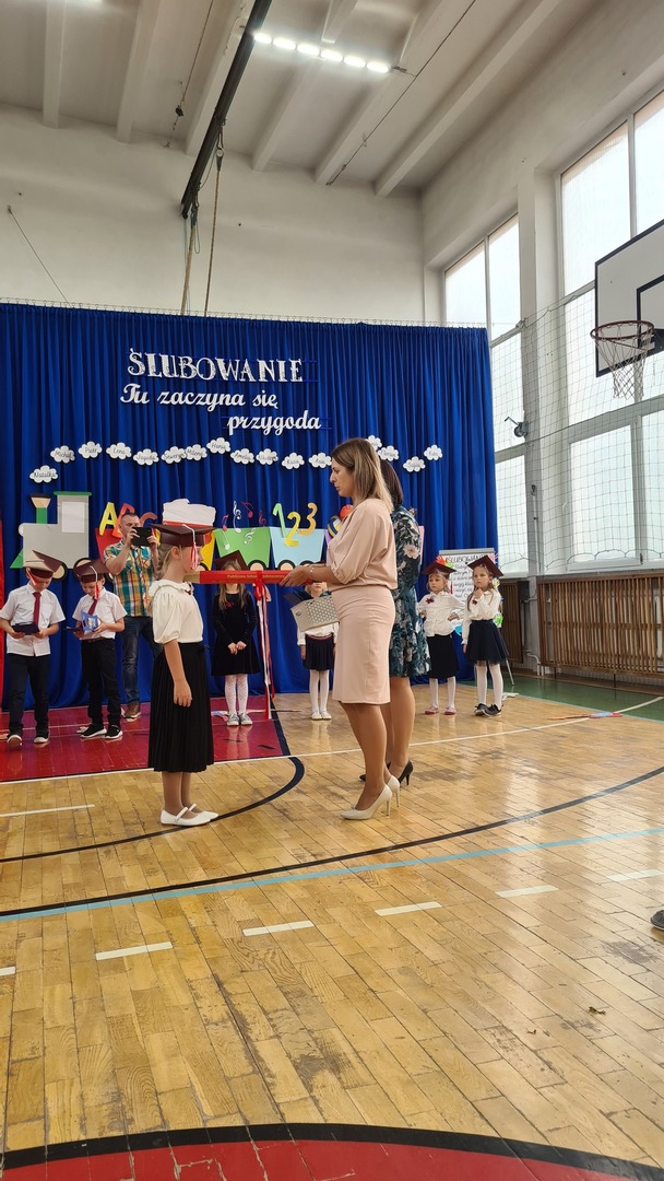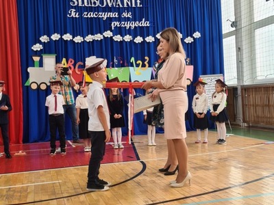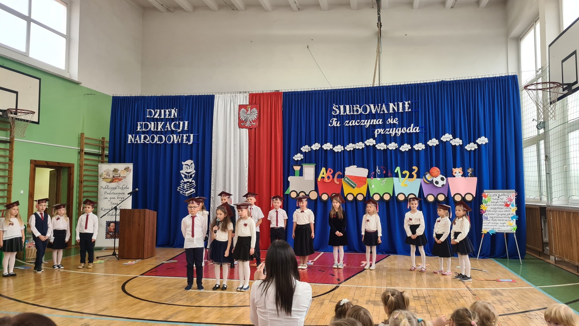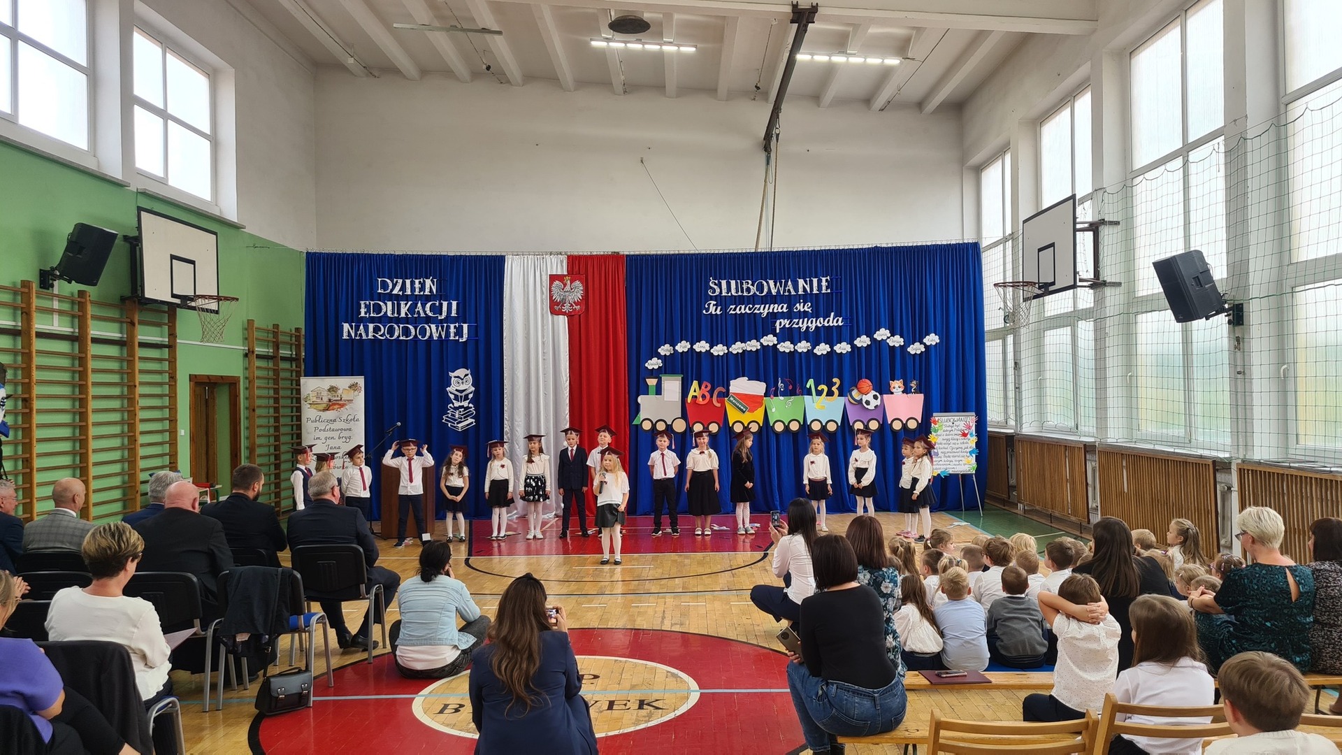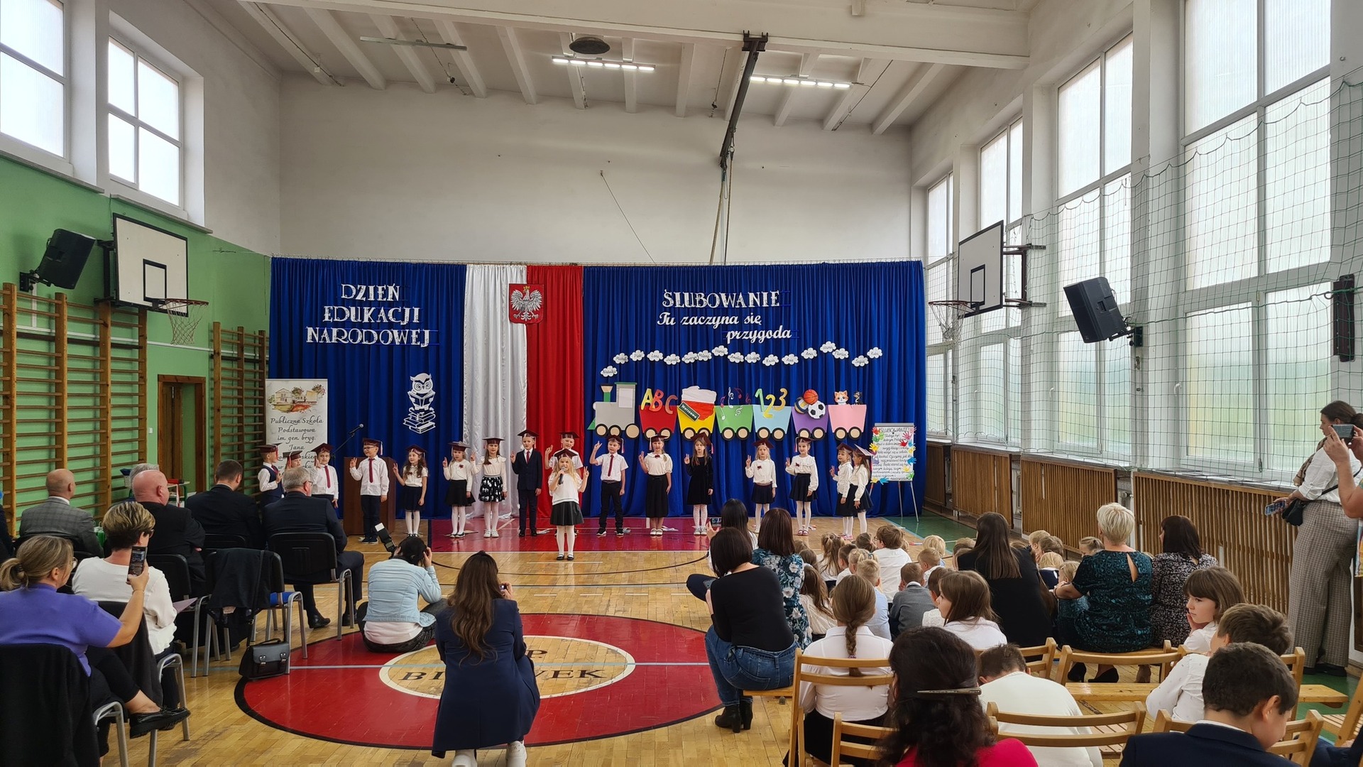 13 października 2023 roku 17 pierwszoklasistów w podniosłej atmosferze przed pocztem sztandarowym złożyło ślubowanie. Obiecali być wzorowymi uczniami, dbać o swoje zachowanie i poświęcać się nauce, by sprawiać radość nauczycielom i rodzicom. To ważny moment w życiu każdego ucznia, który symbolizuje ich zaangażowanie w proces edukacji. Pani dyrektor Agata Kępka symbolicznie pasowała ich na uczniów.