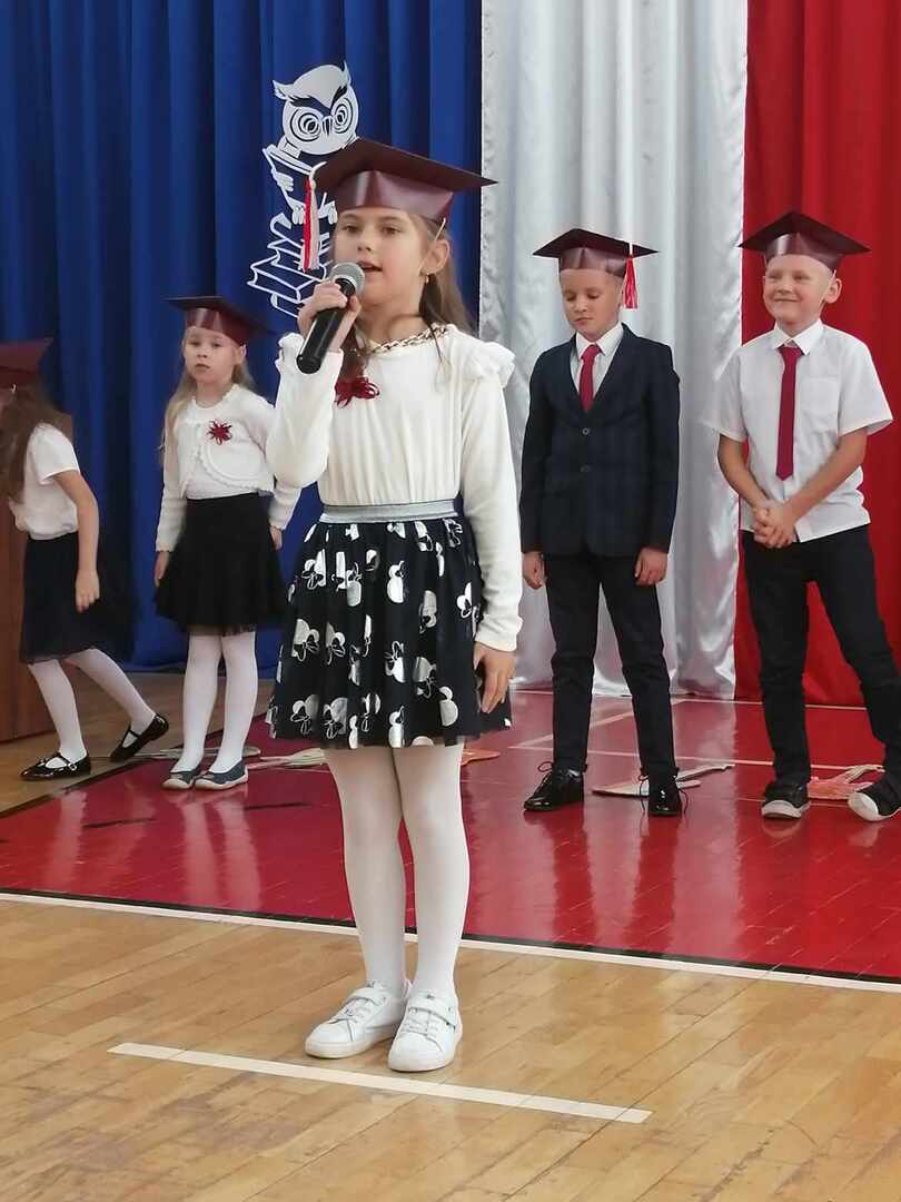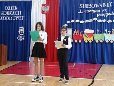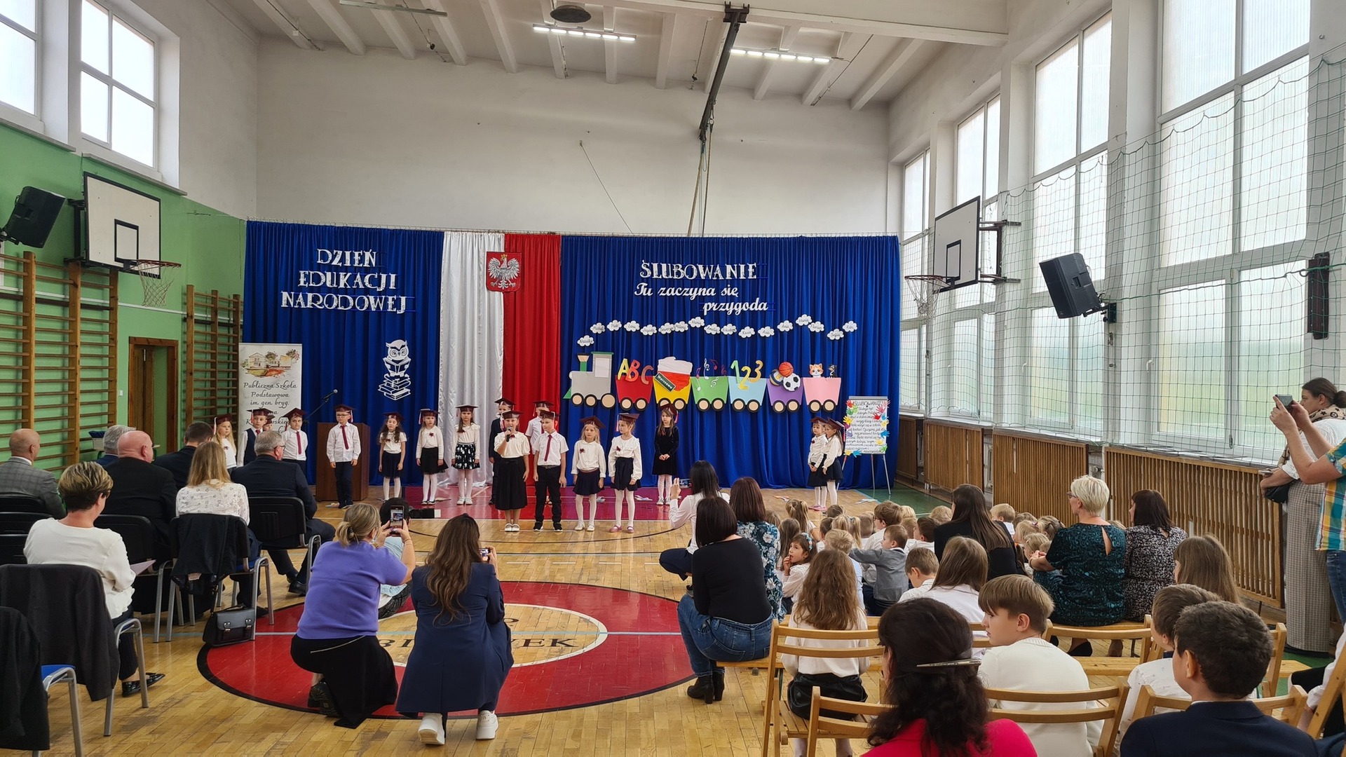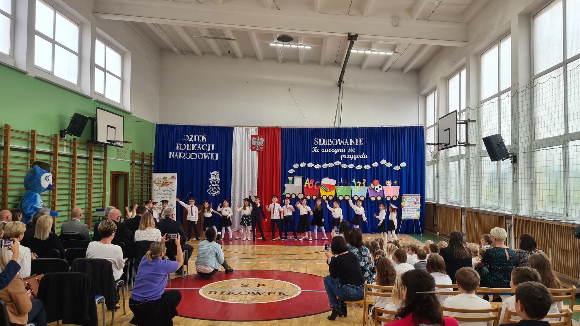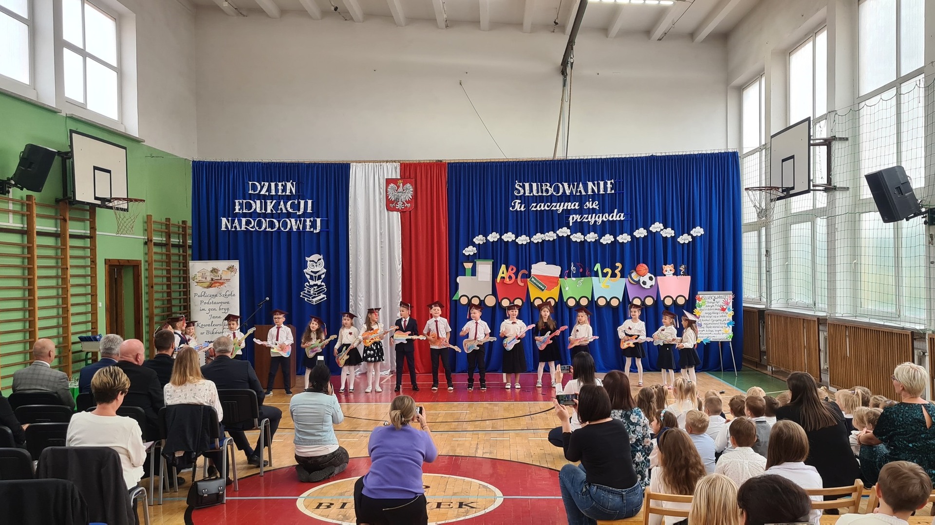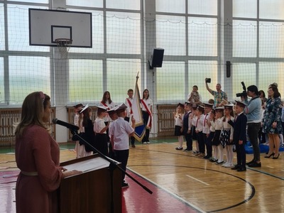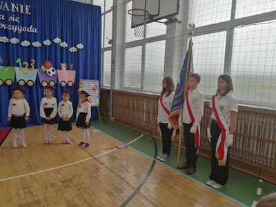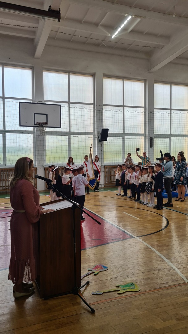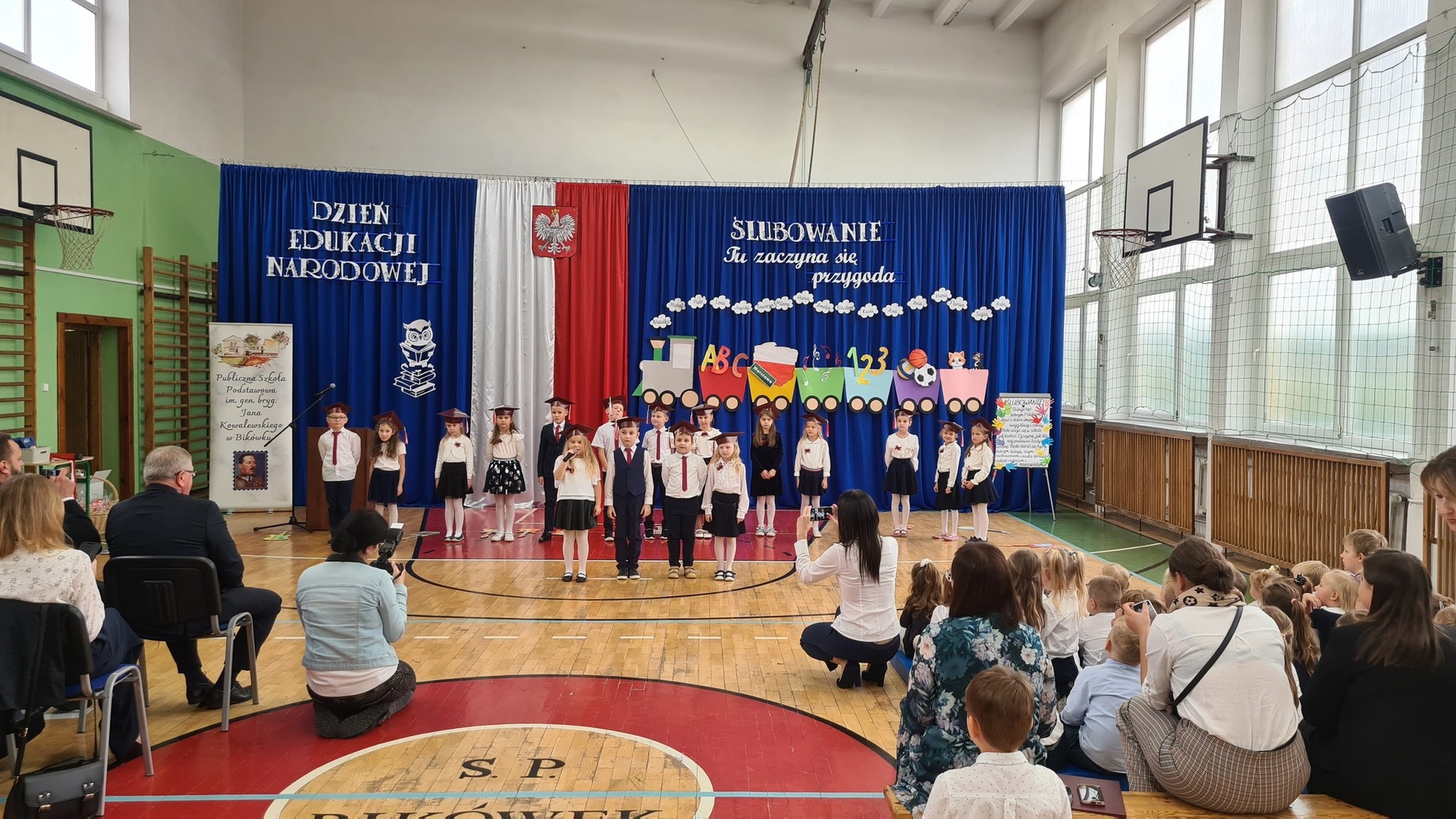 13 października 2023 roku 17 pierwszoklasistów w podniosłej atmosferze przed pocztem sztandarowym złożyło ślubowanie. Obiecali być wzorowymi uczniami, dbać o swoje zachowanie i poświęcać się nauce, by sprawiać radość nauczycielom i rodzicom. To ważny moment w życiu każdego ucznia, który symbolizuje ich zaangażowanie w proces edukacji. Pani dyrektor Agata Kępka symbolicznie pasowała ich na uczniów.
