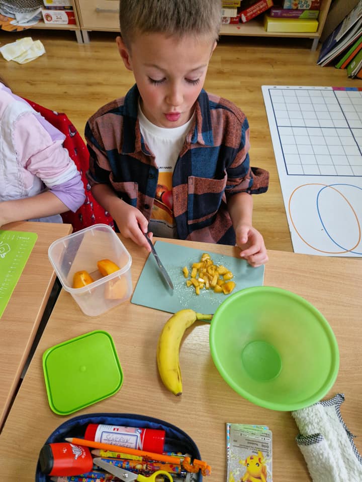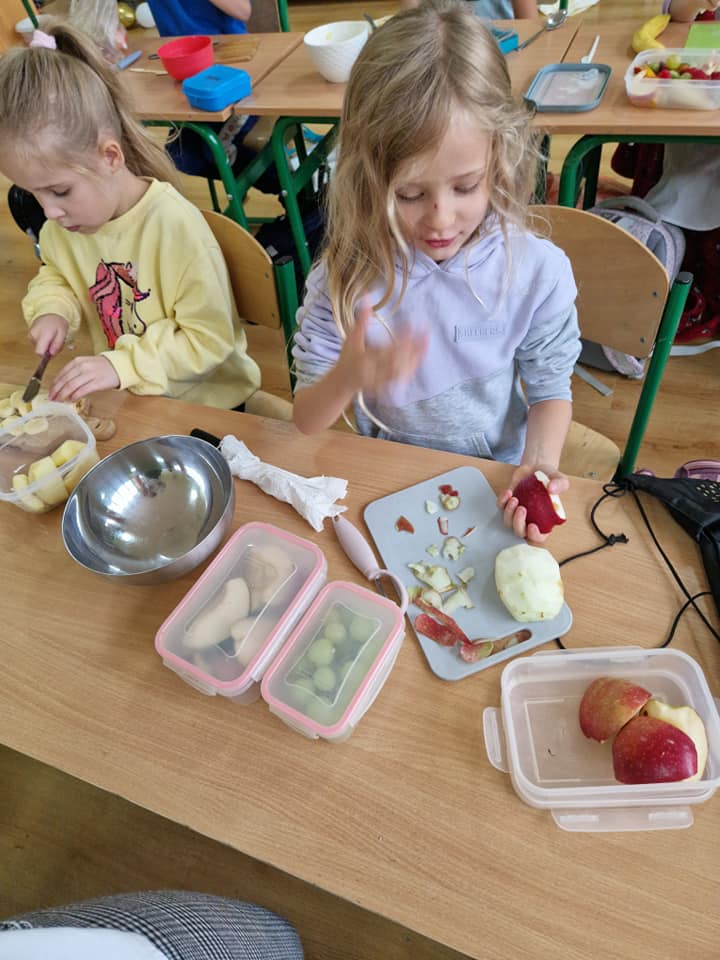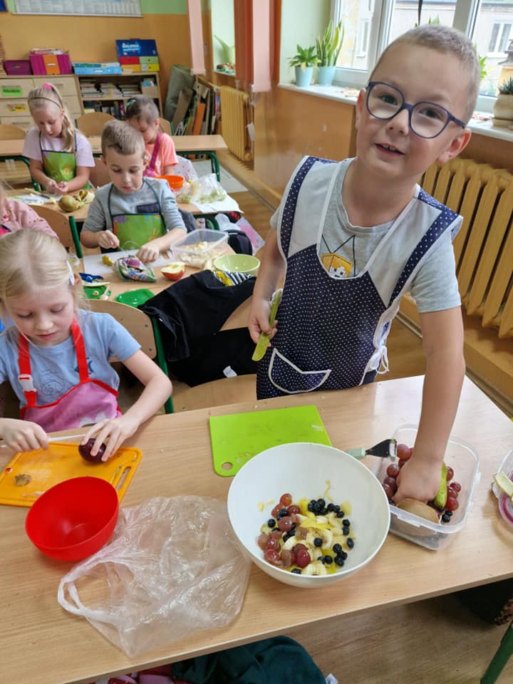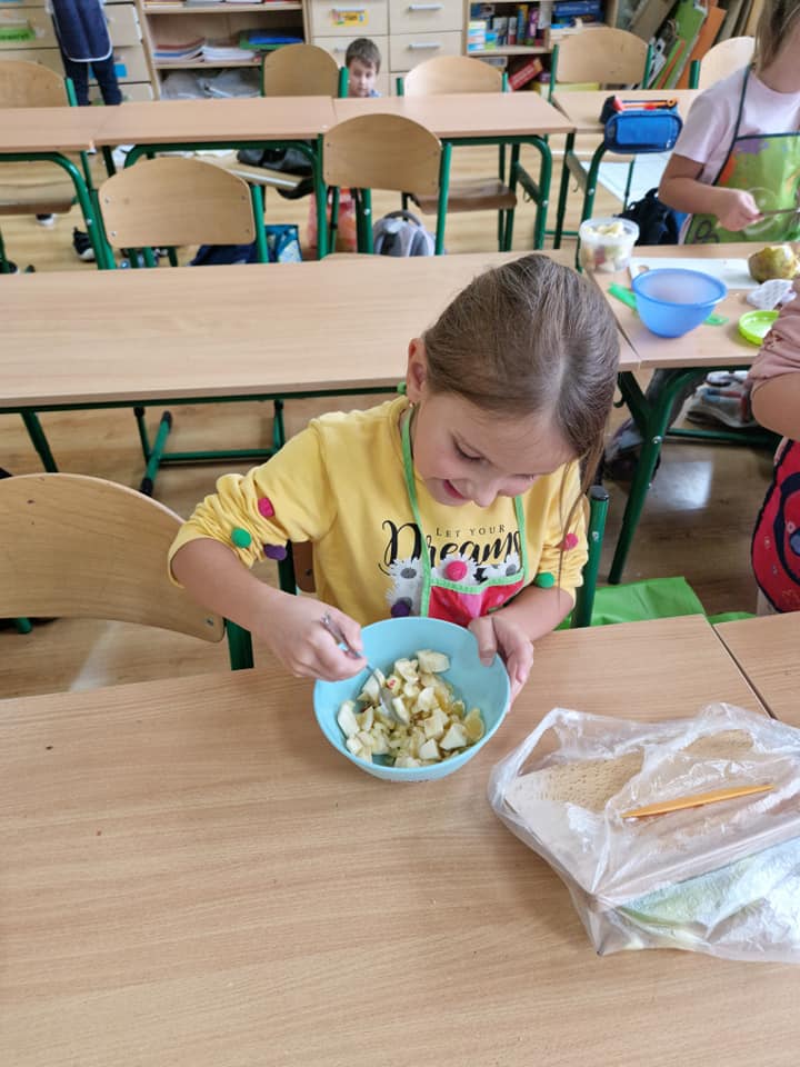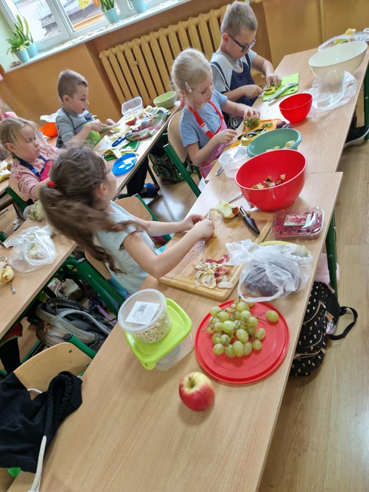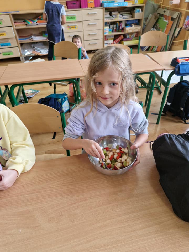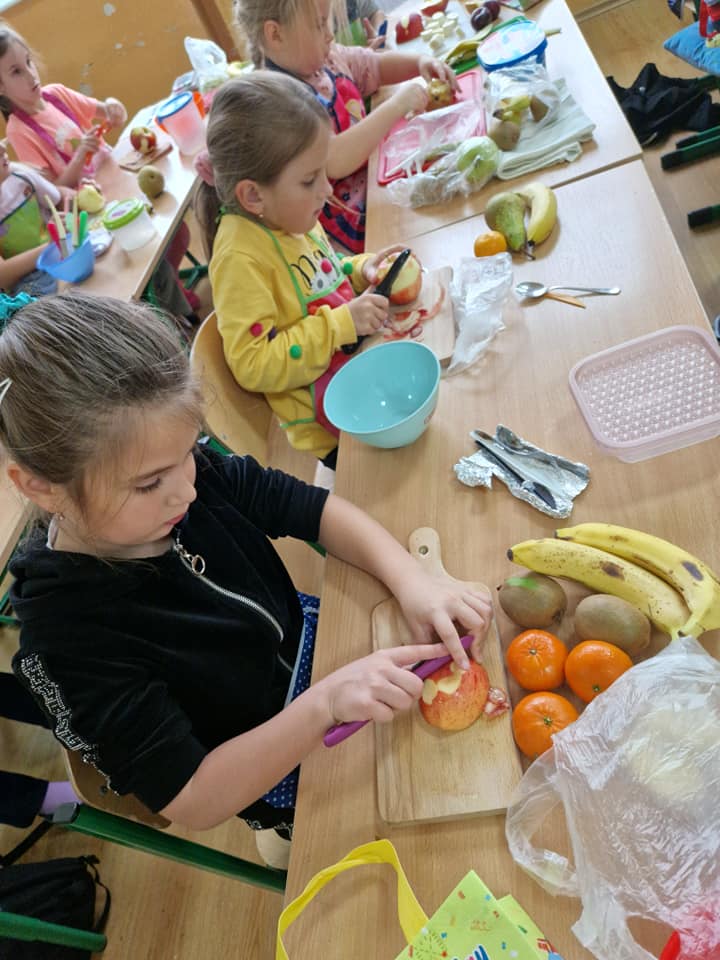 20 października pierwszaki na zajęciach własnoręcznie przygotowały pyszną, witaminową sałatkę. Na stole zagościły różne owoce: jabłka, gruszki, banany, śliwki, winogrono, pomarańcze, kiwi, maliny. Wszyscy mieli soczyste minki na widok tak smakowitych owoców i każdy ochoczo zabrał się do pracy. Dzieci samodzielnie kroiły i przyrządzały sałatkę owocową przestrzegając zasad bezpieczeństwa przy posługiwaniu się nożem.