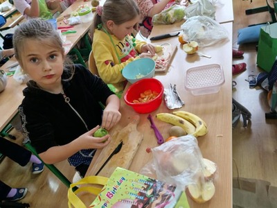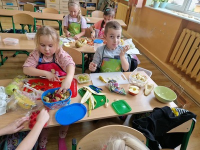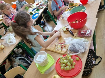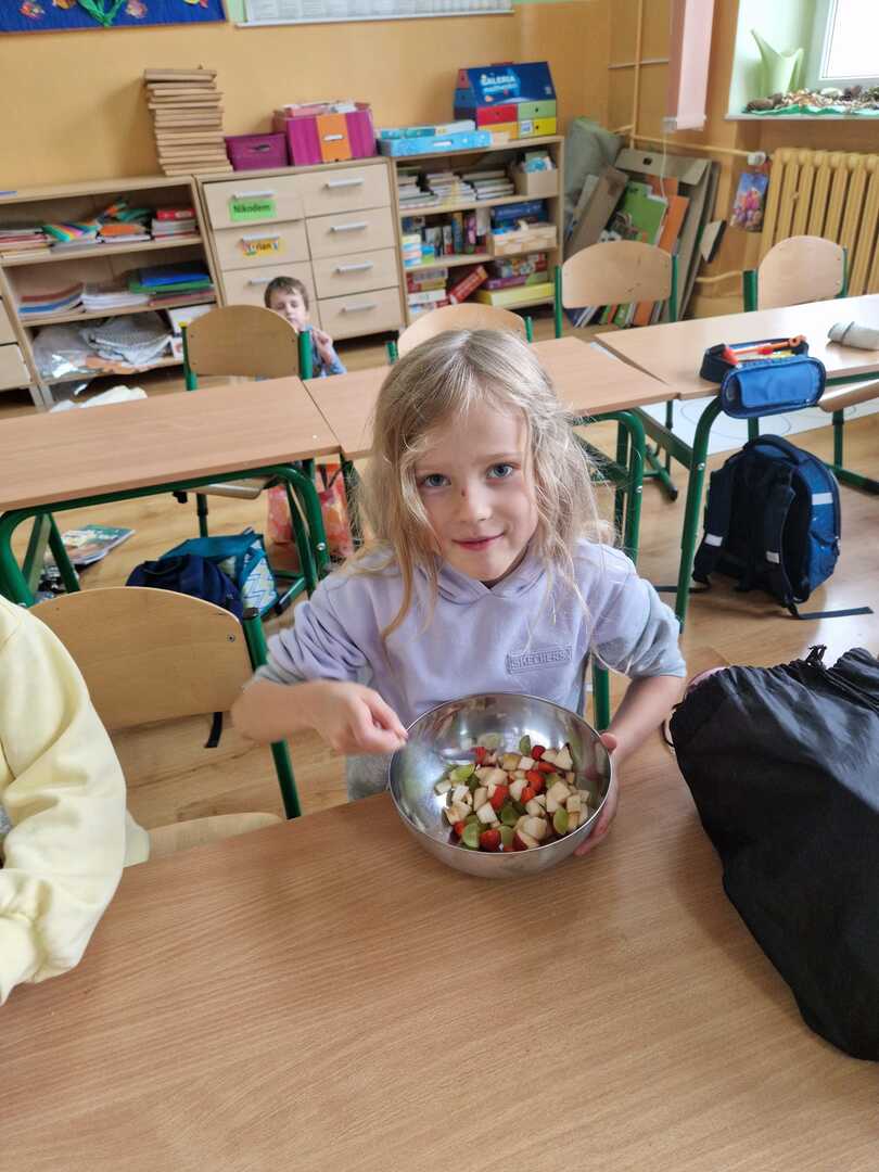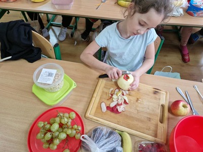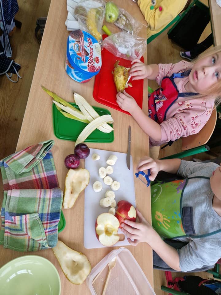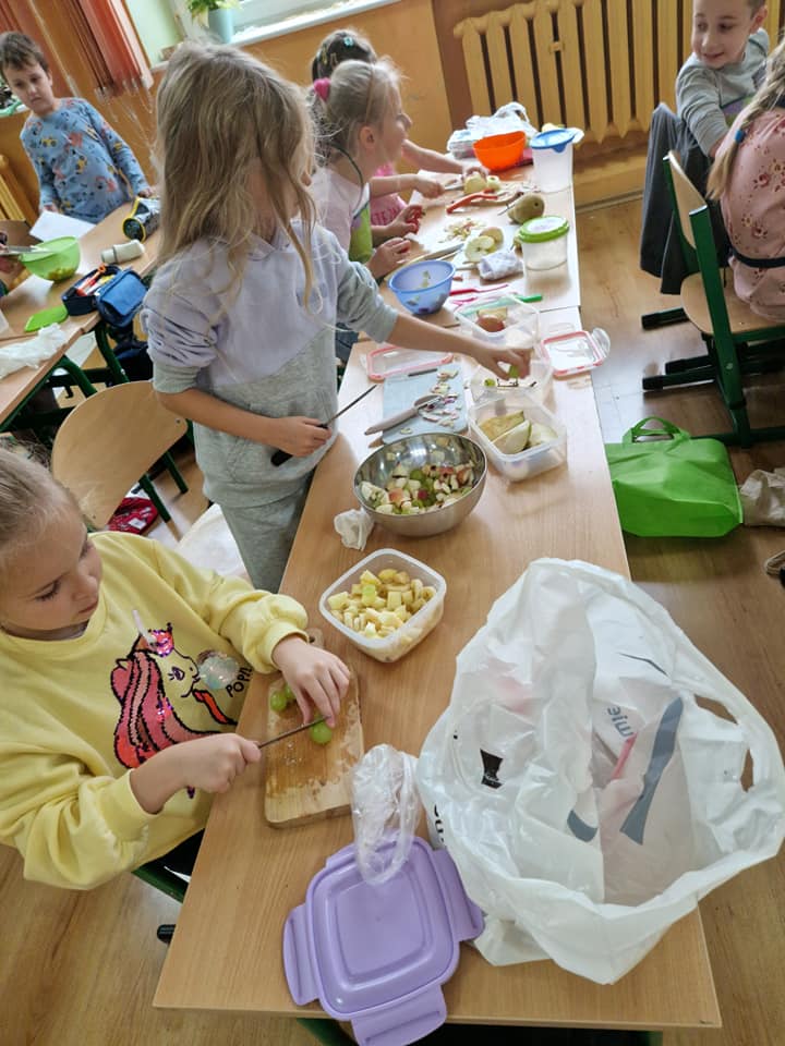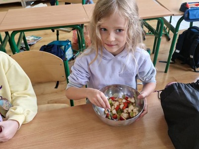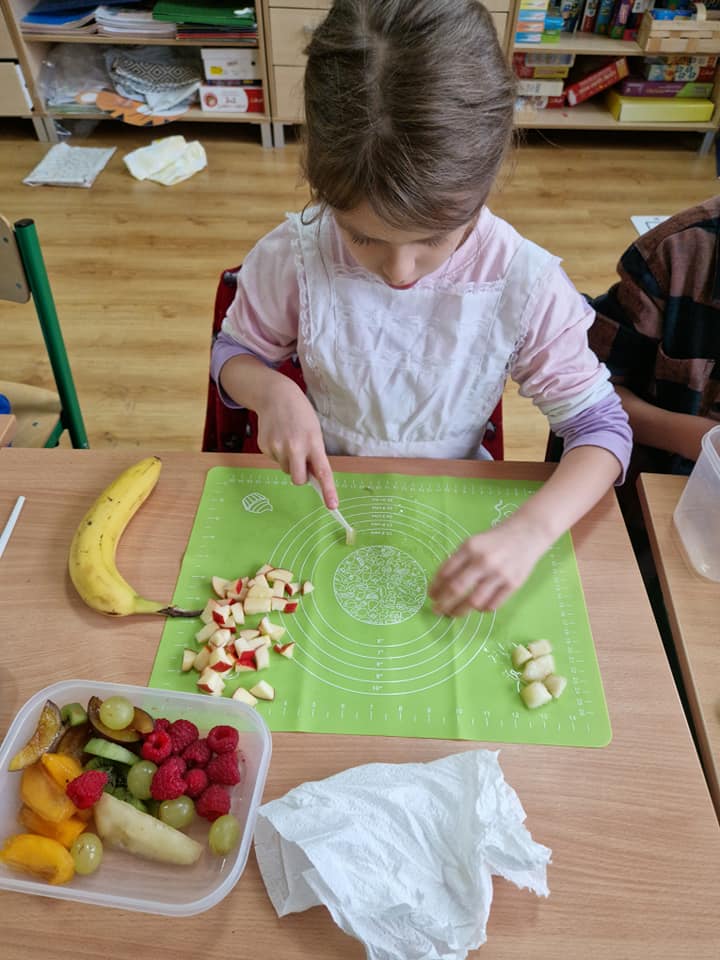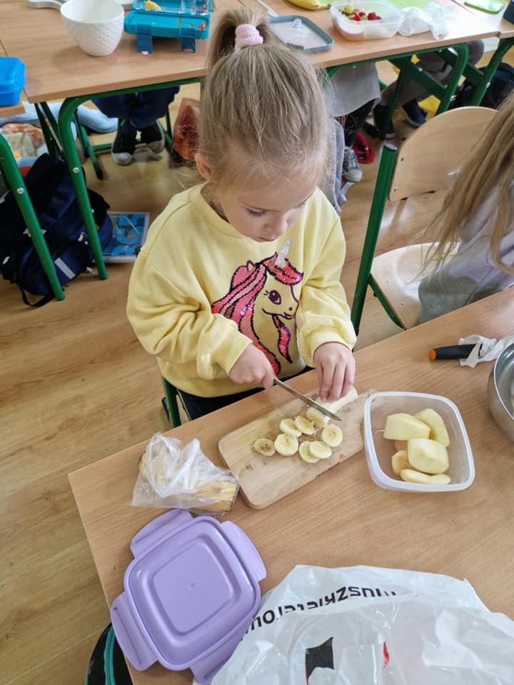 20 października pierwszaki na zajęciach własnoręcznie przygotowały pyszną, witaminową sałatkę. Na stole zagościły różne owoce: jabłka, gruszki, banany, śliwki, winogrono, pomarańcze, kiwi, maliny. Wszyscy mieli soczyste minki na widok tak smakowitych owoców i każdy ochoczo zabrał się do pracy. Dzieci samodzielnie kroiły i przyrządzały sałatkę owocową przestrzegając zasad bezpieczeństwa przy posługiwaniu się nożem.