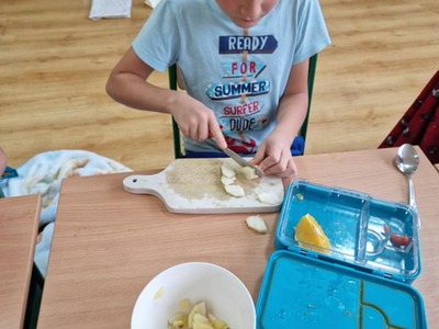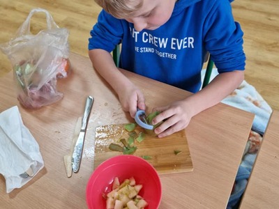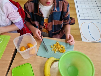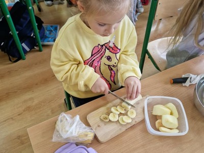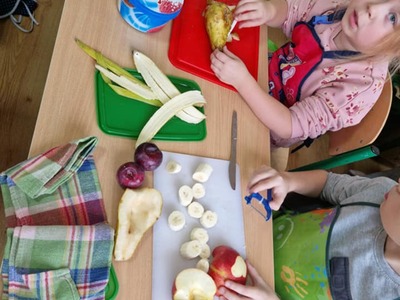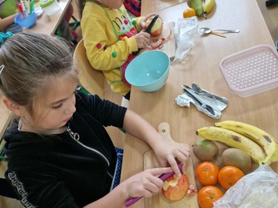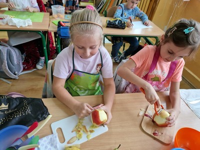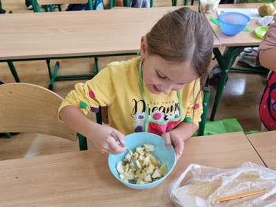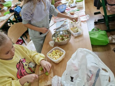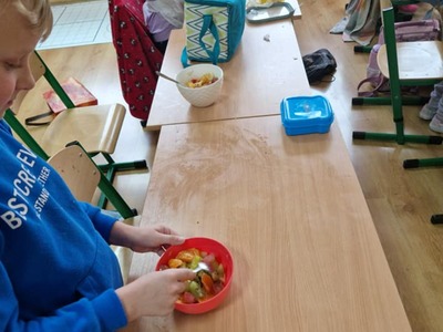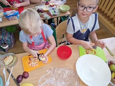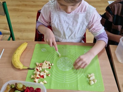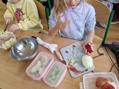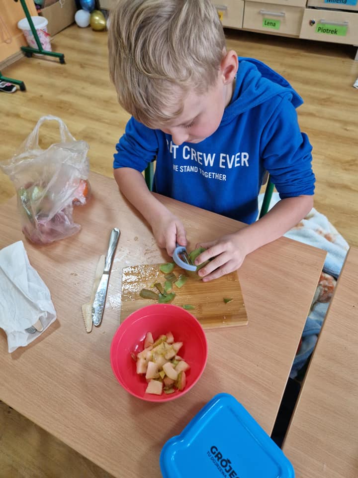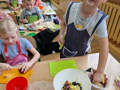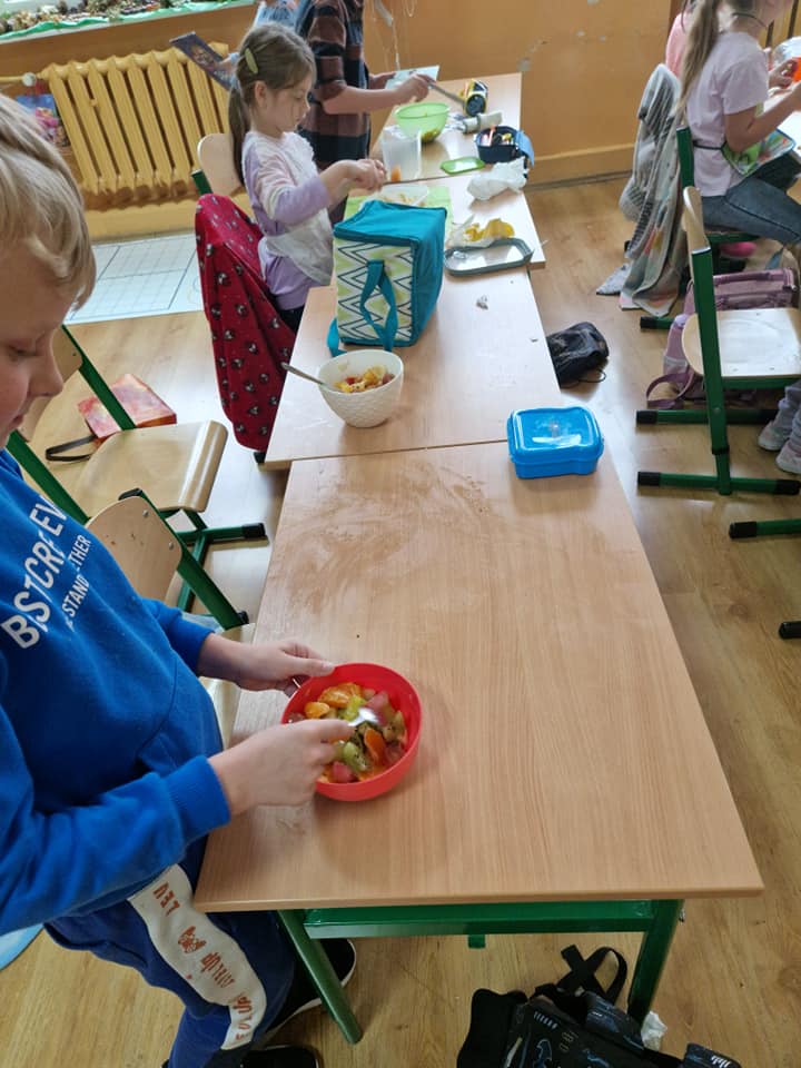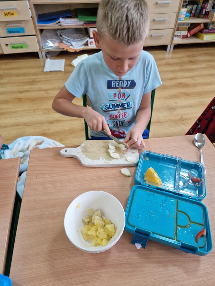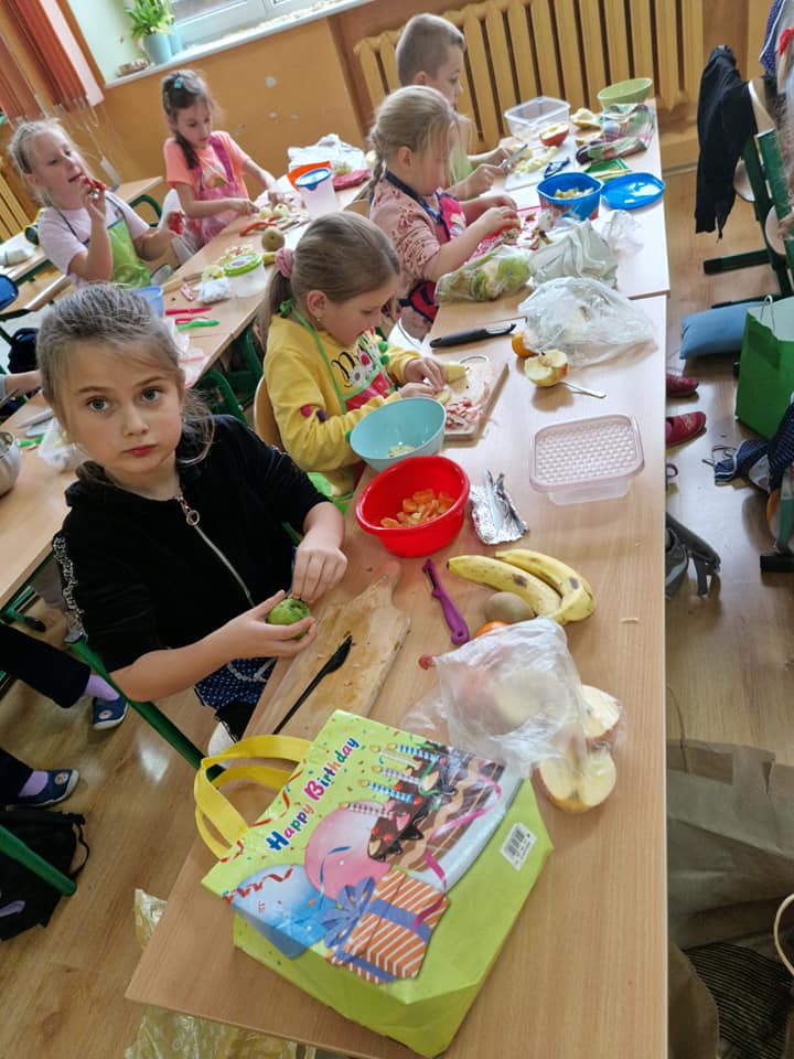 20 października pierwszaki na zajęciach własnoręcznie przygotowały pyszną, witaminową sałatkę. Na stole zagościły różne owoce: jabłka, gruszki, banany, śliwki, winogrono, pomarańcze, kiwi, maliny. Wszyscy mieli soczyste minki na widok tak smakowitych owoców i każdy ochoczo zabrał się do pracy. Dzieci samodzielnie kroiły i przyrządzały sałatkę owocową przestrzegając zasad bezpieczeństwa przy posługiwaniu się nożem.