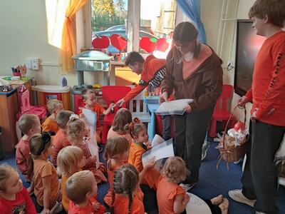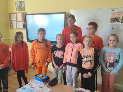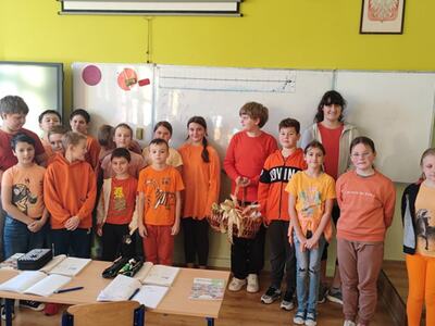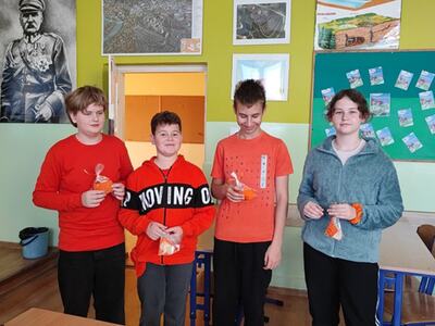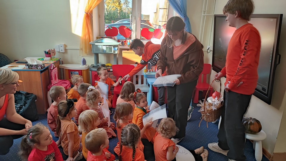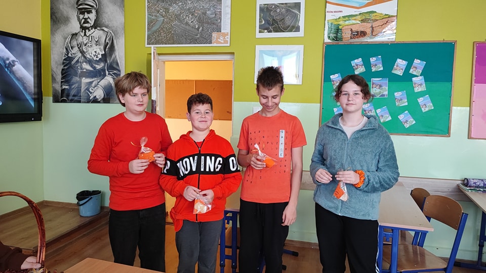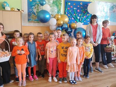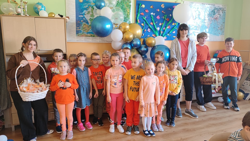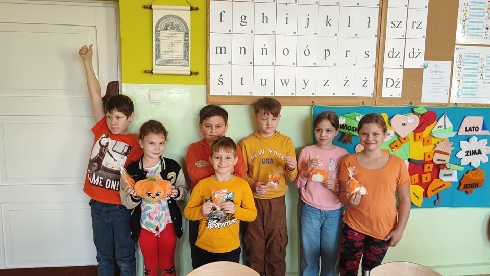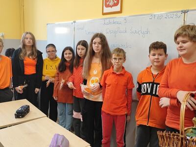 W ramach podziękowań za włączenie się do zabawy, członkowie Samorządu Uczniowskiego przygotowali dla wszystkich odzianych na pomarańczowo słodkie niespodzianki. Smerfy i Krasnale również przyłączyły się do naszej akcji i oprócz słodkich podarunków otrzymali dyniowe kolorowanki, natomiast starsi uczniowie dostali "kartki niepytki."
