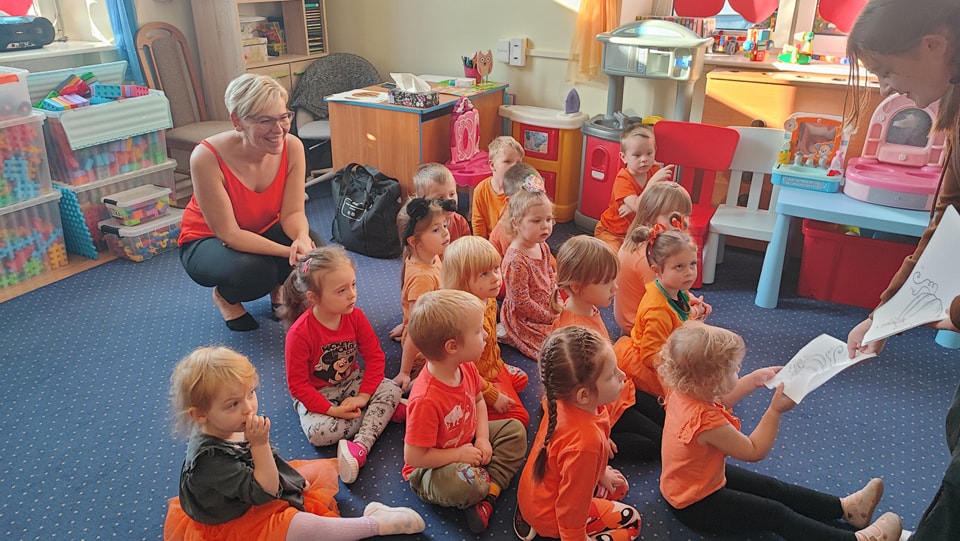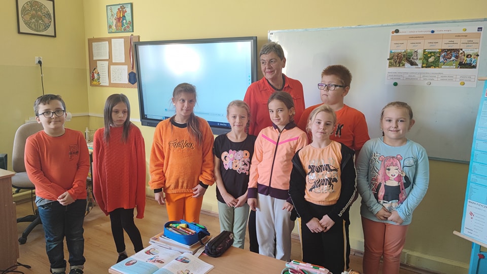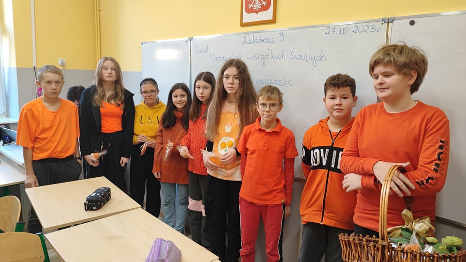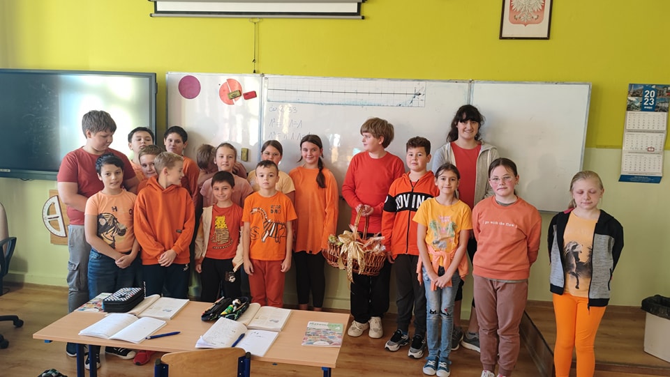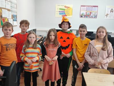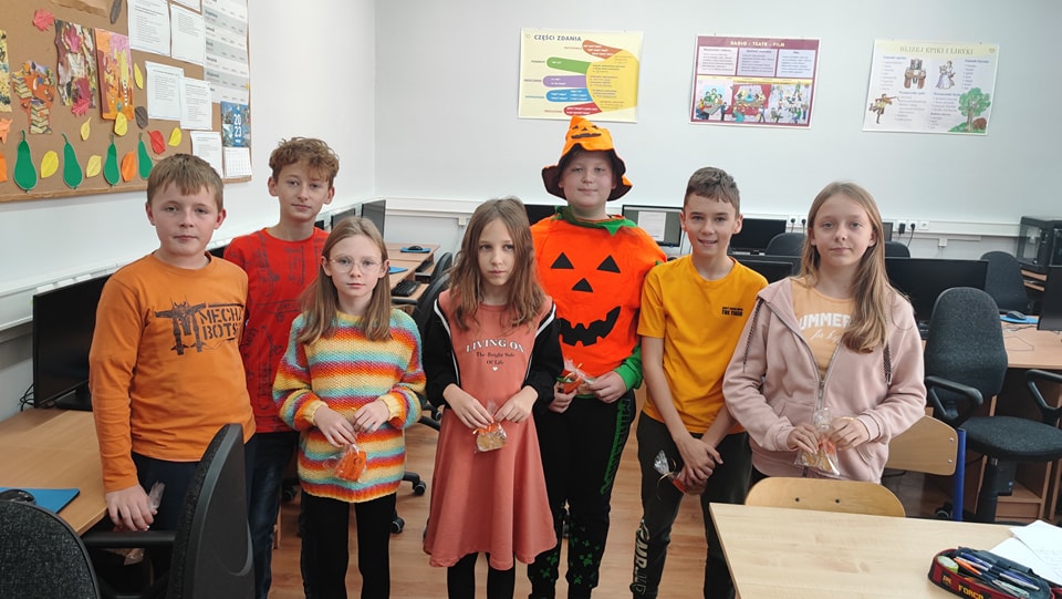Zarówno uczniowie jak i nauczyciele przybyli dziś ubrani w różne odcienie pomarańczowego. W końcu świętowaliśmy Dzień Dyni, więc jej kolory były oczekiwane.