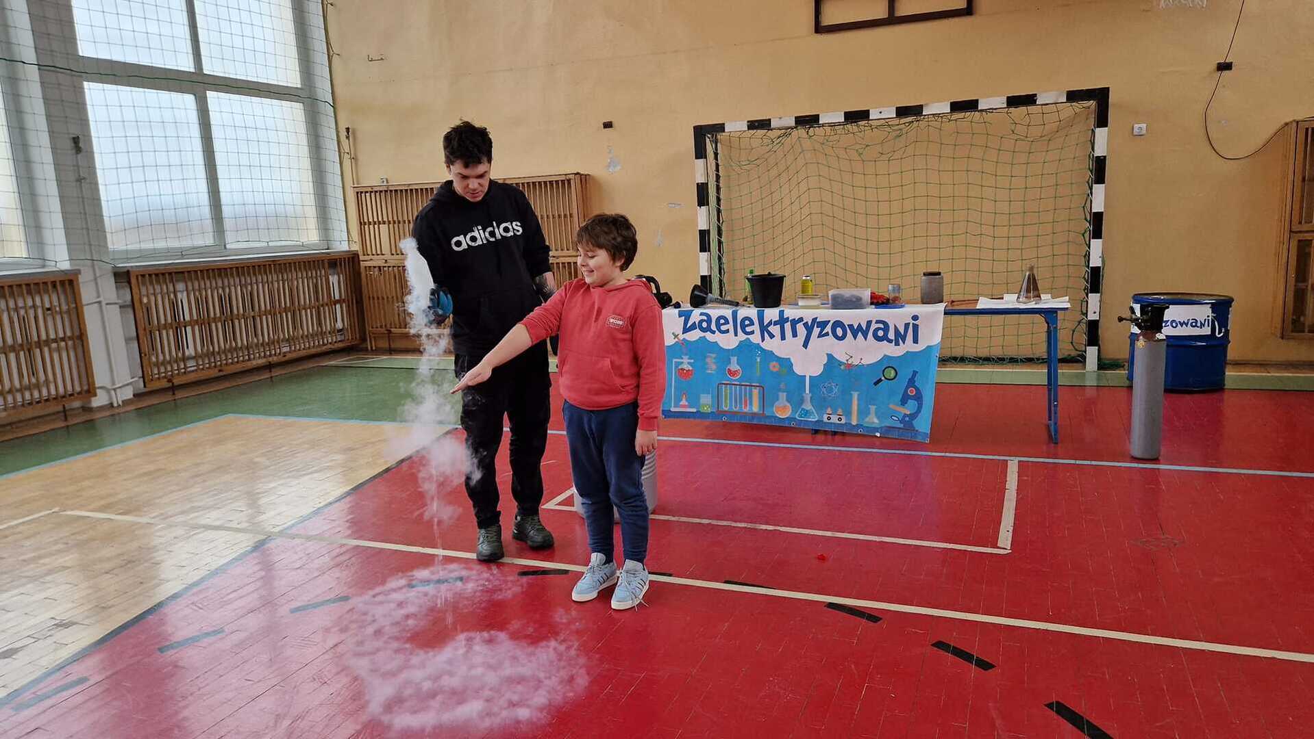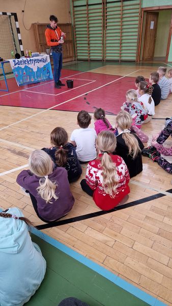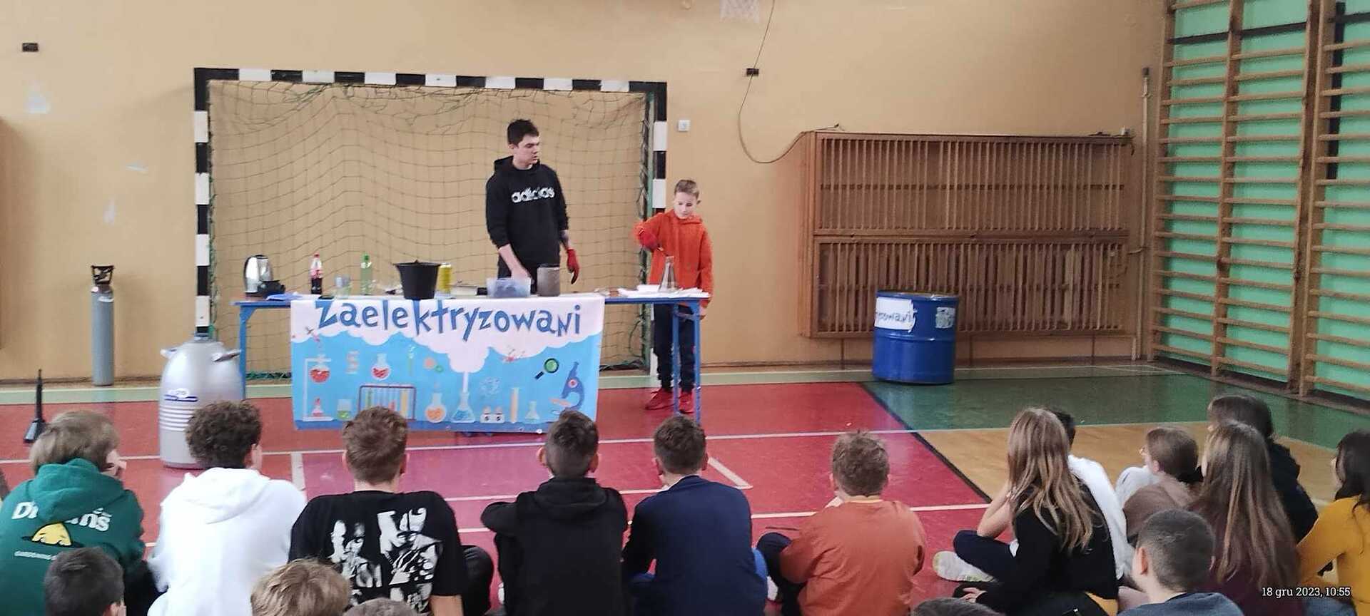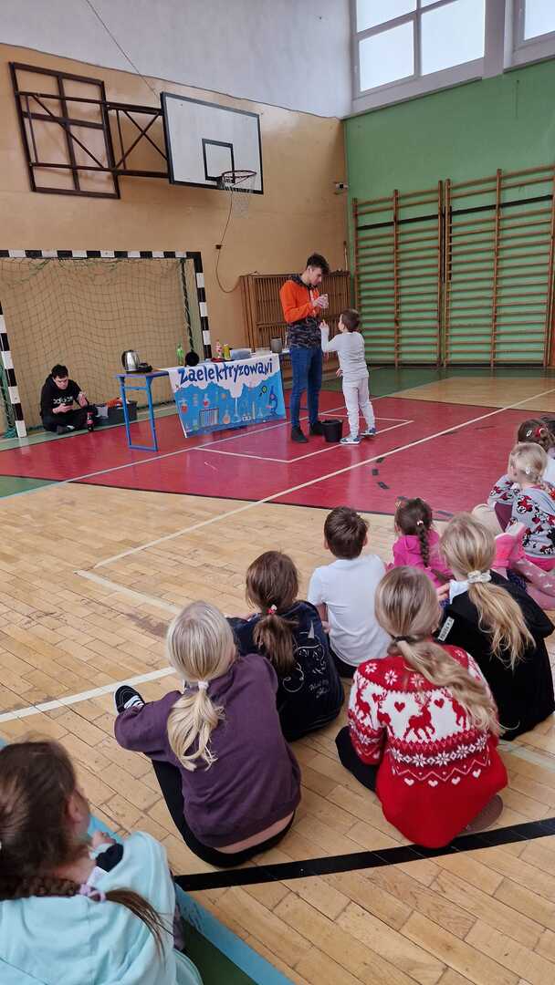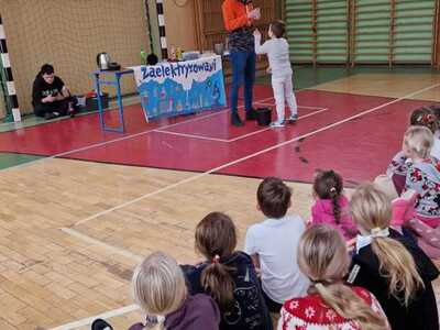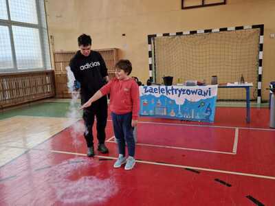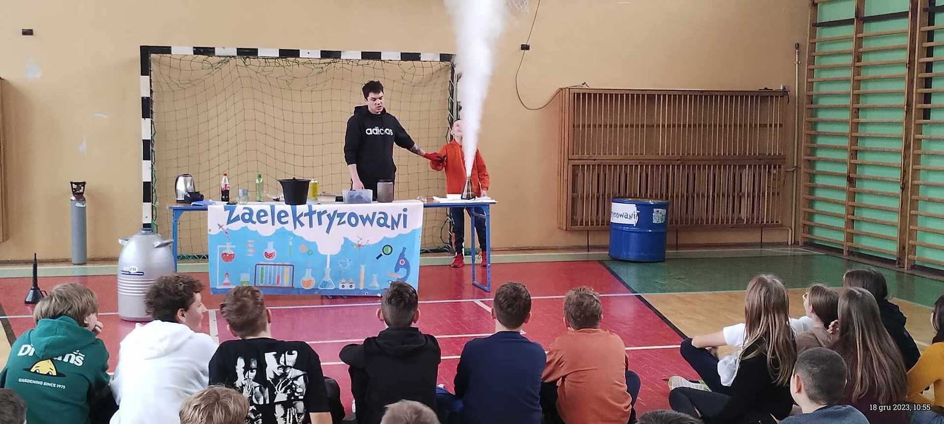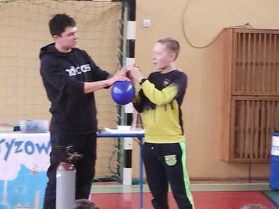 Dziś naszą szkołę odwiedziła grupa "Zaelektryzowani", która zaprosiła uczniów na niecodzienną lekcję pt. "Zasady fizyczne czy kwasy chemiczne". Prowadzący przybliżył dzieciom wiedzę z zakresu chemii i fizyki w bardzo prosty i atrakcyjny sposób, zaprezentował wiele ciekawych doświadczeń z wodorem, helem, azotem, parą wodną. Uczniowie mieli możliwość aktywnego uczestnictwa w pokazach i doświadczenia na własnej skórze zjawisk przyrodniczych. Podczas pokazu wszyscy świetnie się bawili