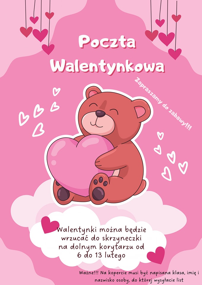 Samorząd Uczniowski serdecznie zaprasza do walentynkowej zabawy. Jeśli twoje serce bije szybciej na czyjś widok albo po prostu chcesz pokazać, że kogoś lubisz, nie wahaj się i skorzystaj z okazji. Nasi walentynkowi listonosze czekają, aby dostarczyć twój list!