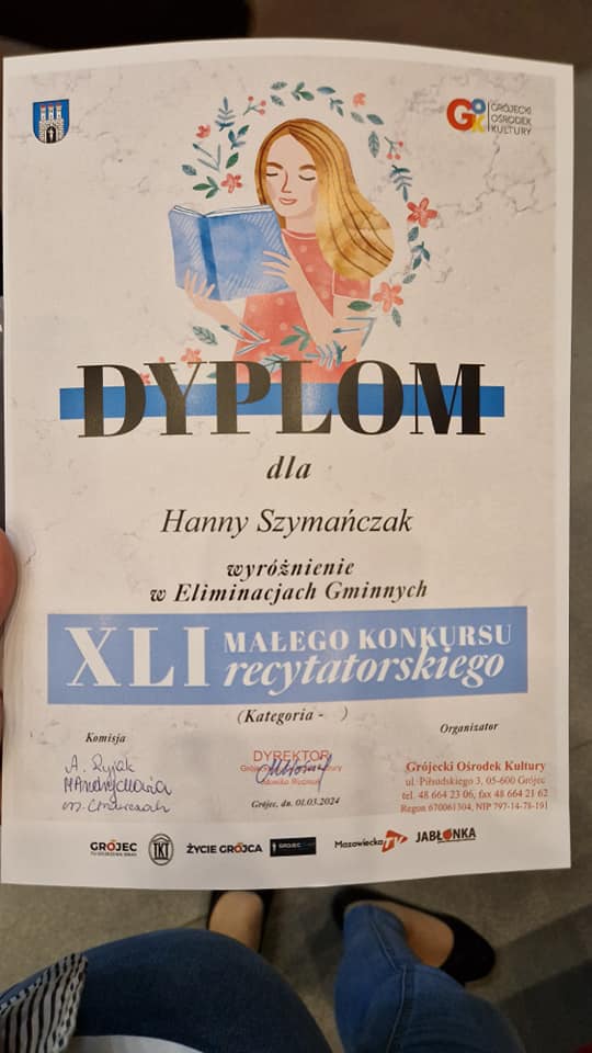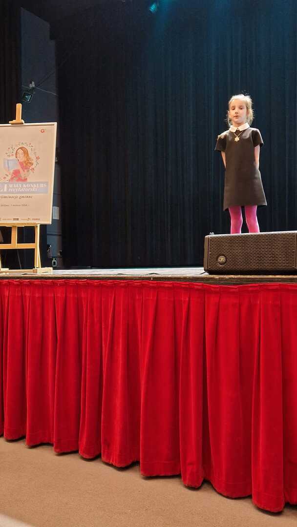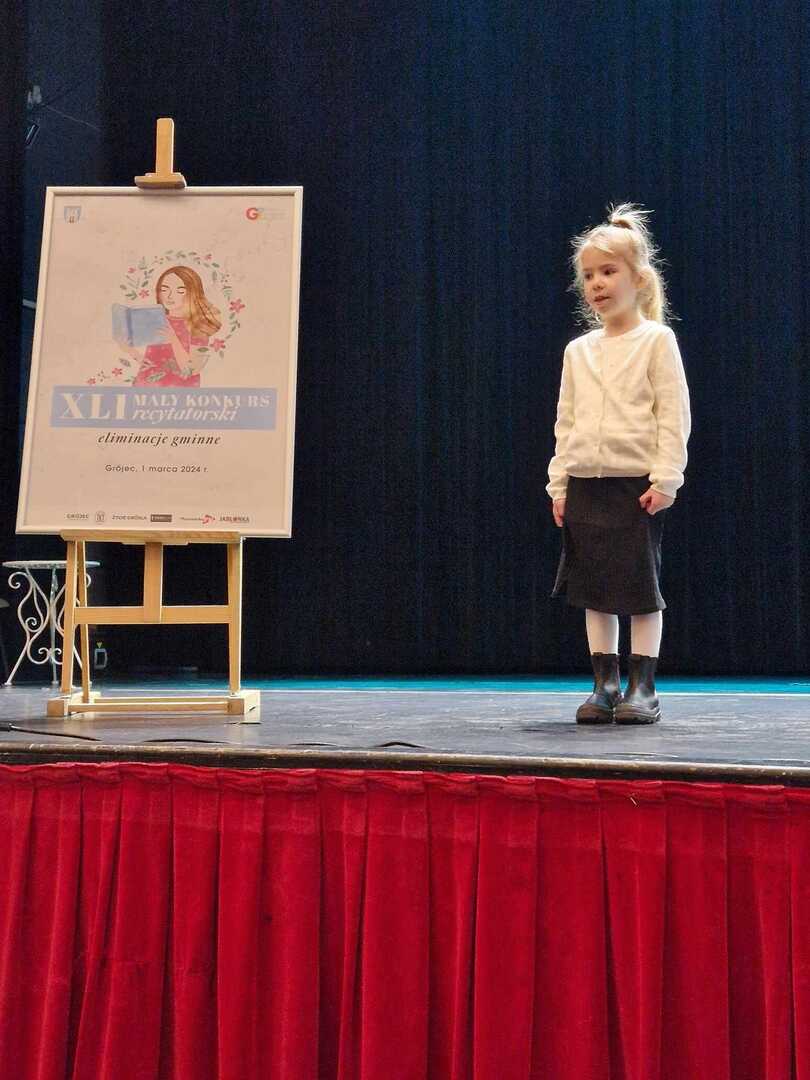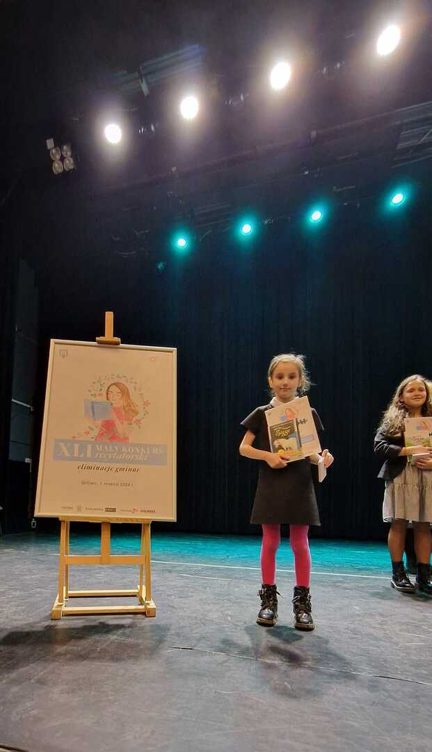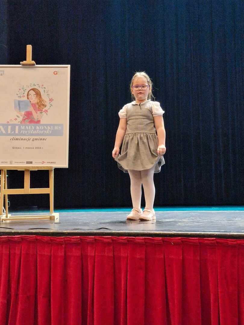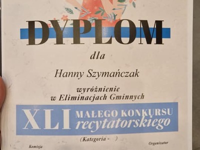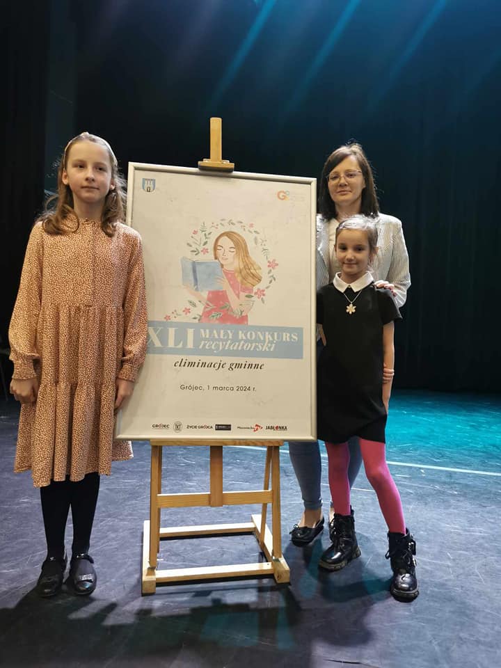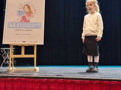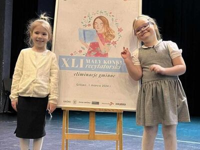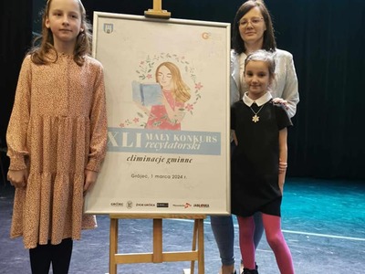 Dnia 1 marca cztery uczennice Amelia Binkiewicz i Amelia Adamczyk z oddziału przedszkolnego "Krasnale", Hanna Szymańczak z kl. I oraz Emilia Tomczyk z kl. IV reprezentowały naszą szkołę podczas Eliminacji Gminnych XLI Małego Konkursu Recytatorskiego. Emilia recytowała wiersz "Spóźniony słowik" J. Tuwima, Amelia Binkiewicz - "Wiosenne porządki" J. Brzechwy, Amelia Adamczyk - "Skarga" A. Frączek otrzymały dyplom za udział.