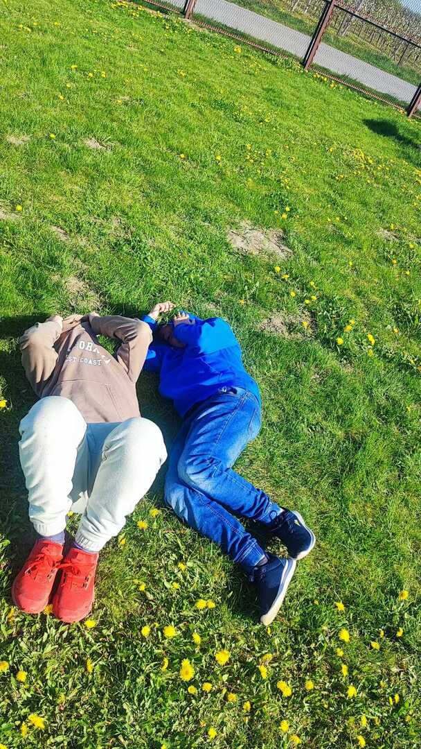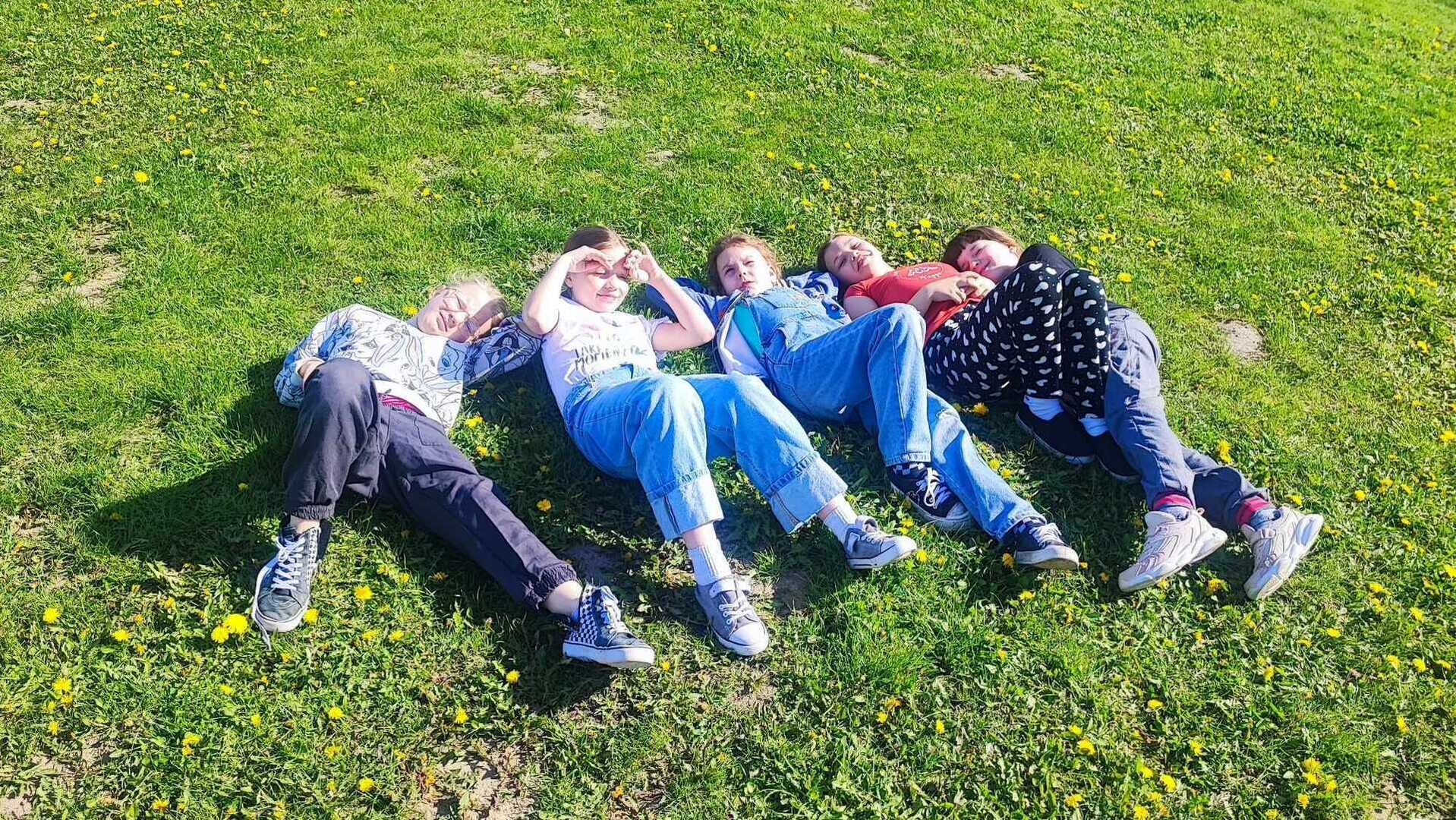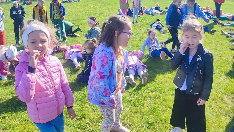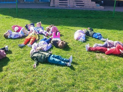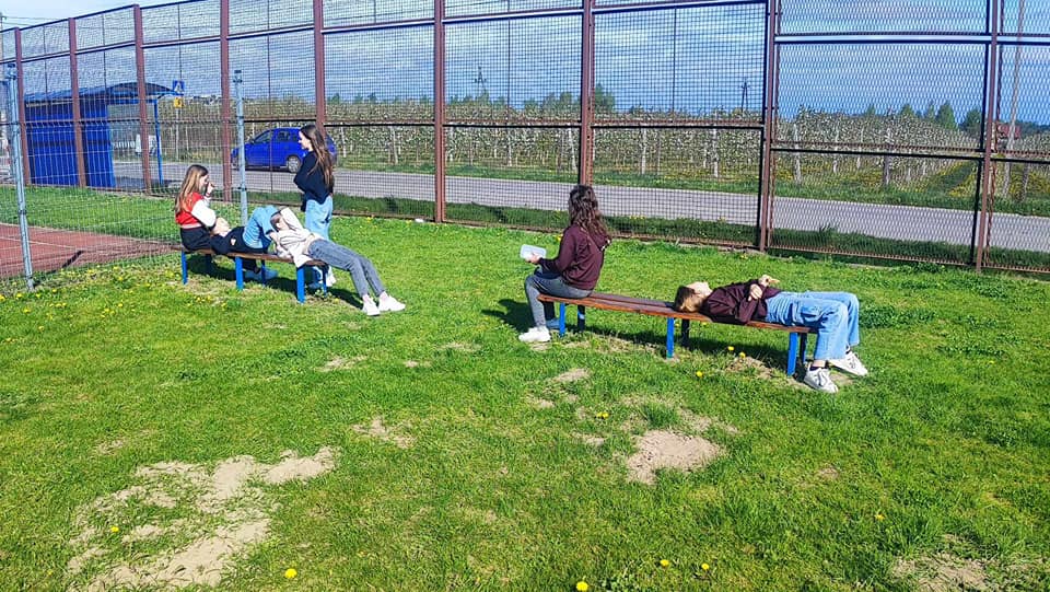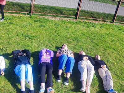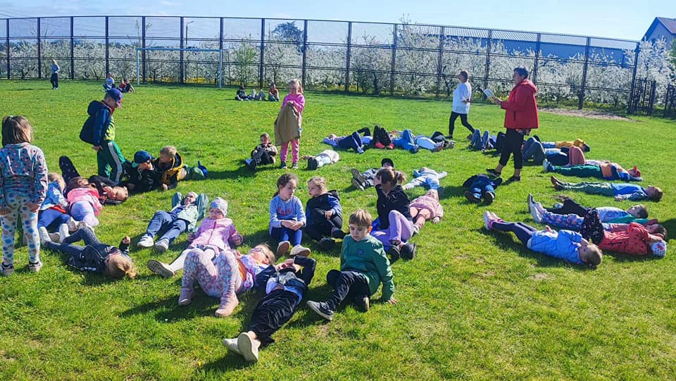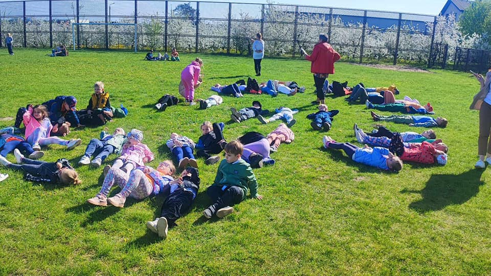 Podczas przerwy śniadaniowej wszyscy uczniowie wyszli na boisko, gdzie wspólnie podziwialiśmy błękit nad nami oraz wypatrywaliśmy chmur na wyjątkowo przejrzystym niebie