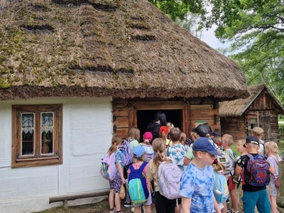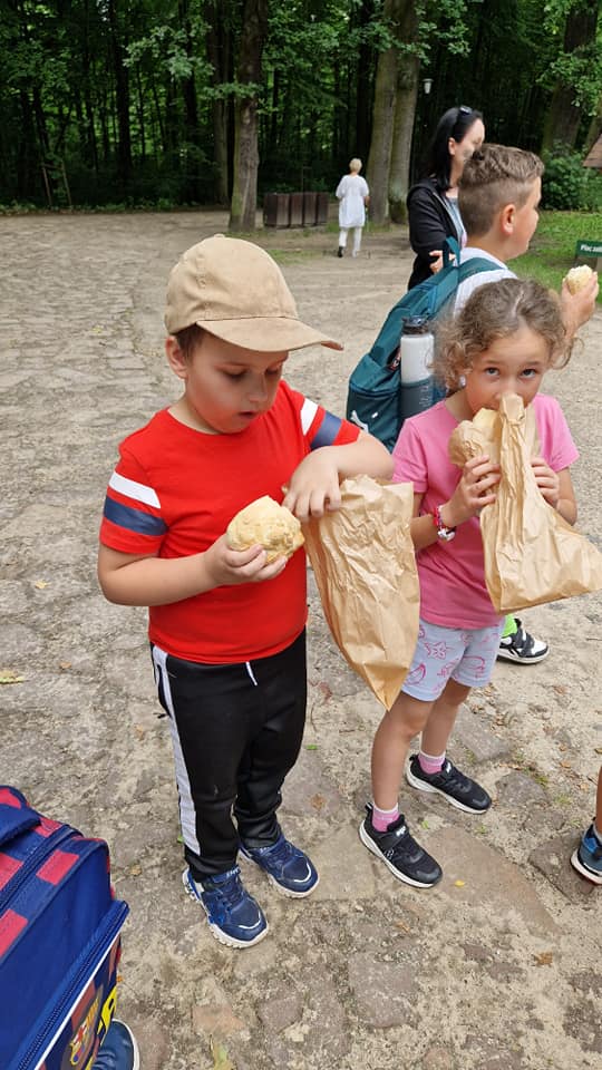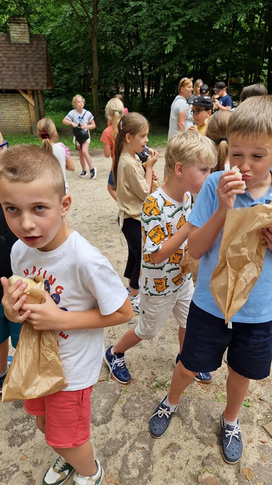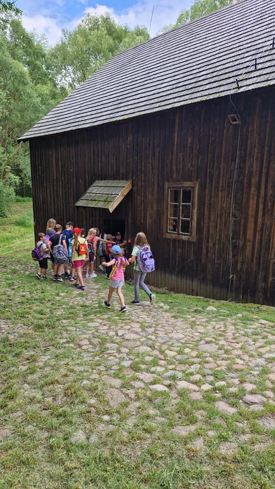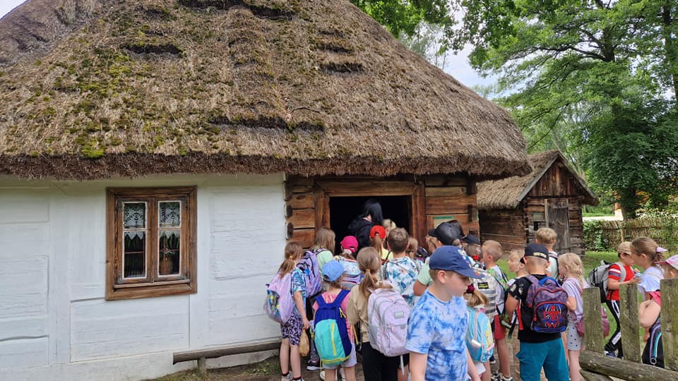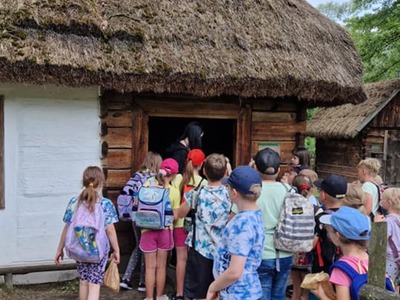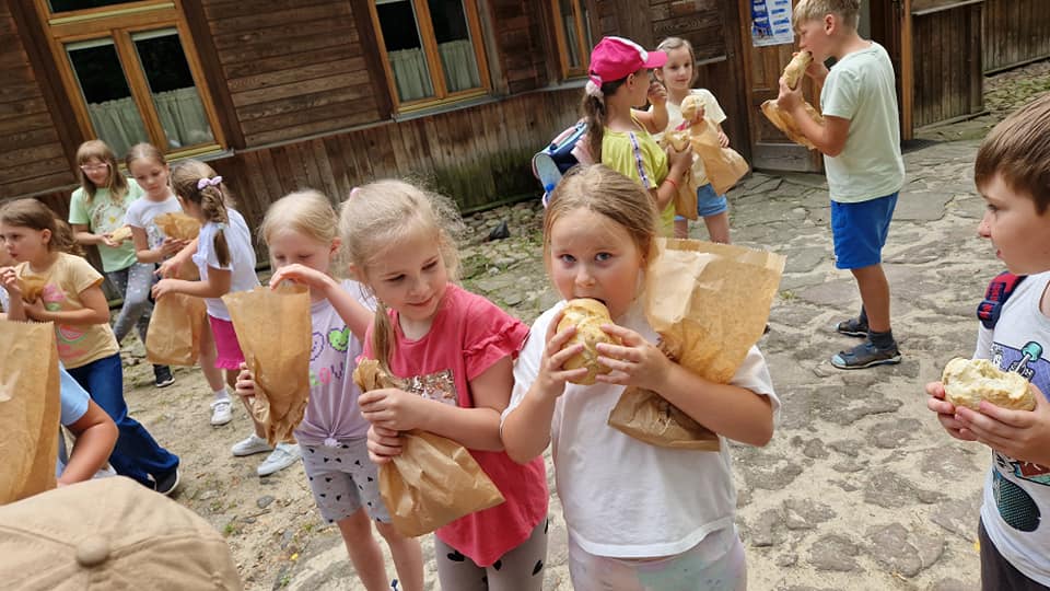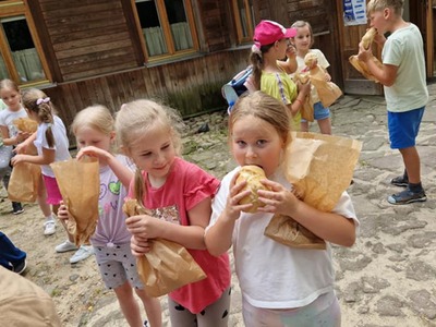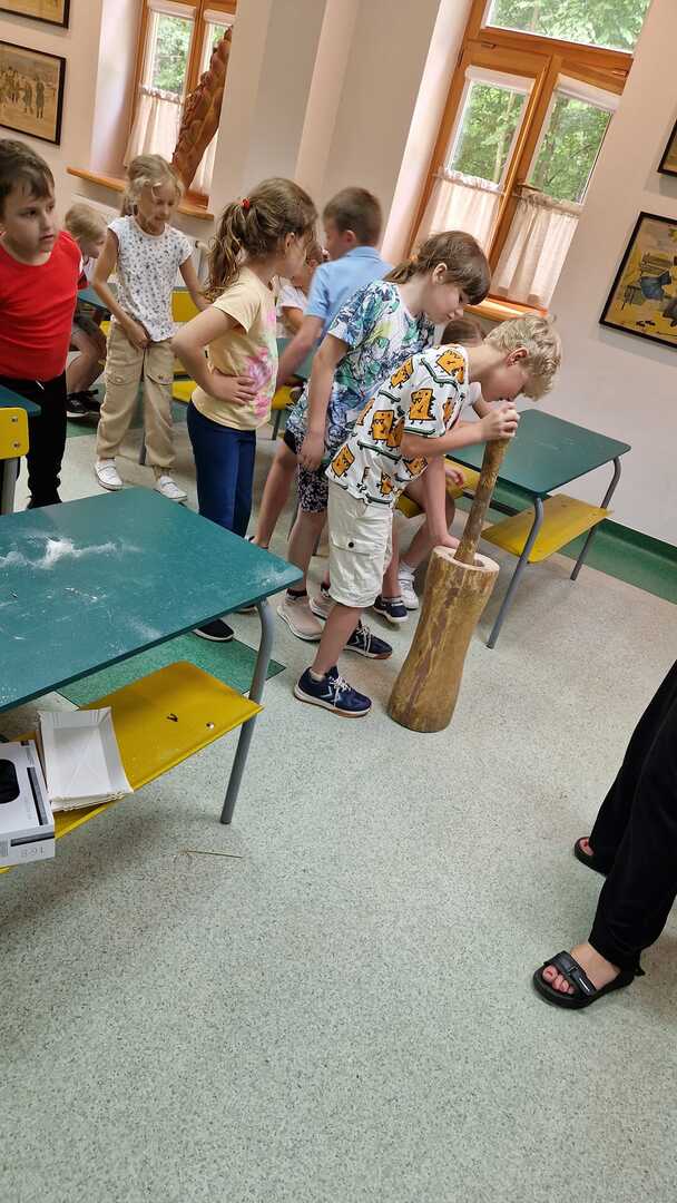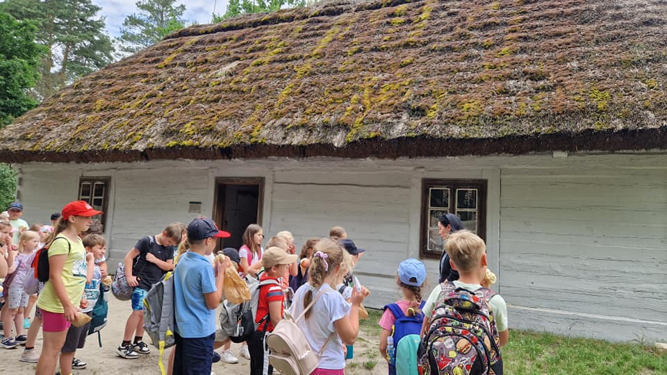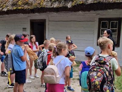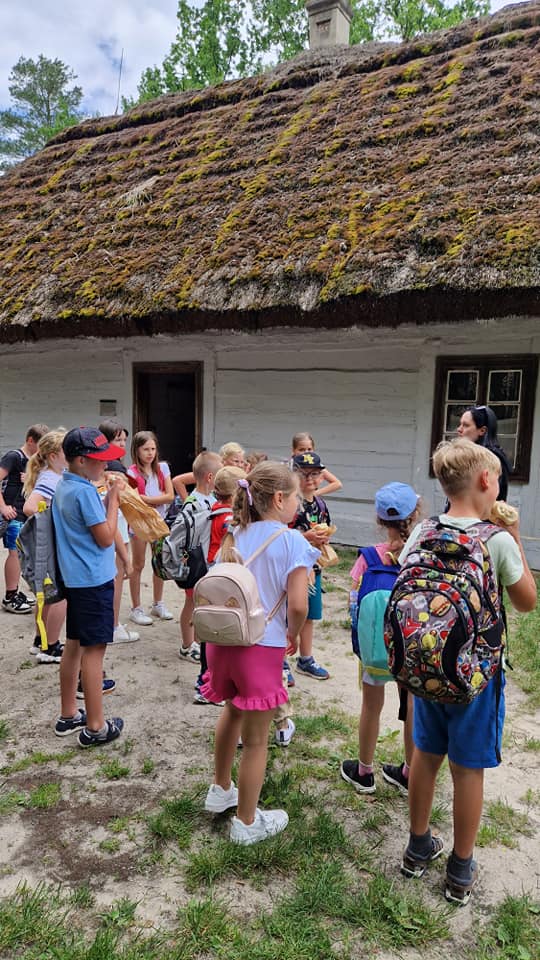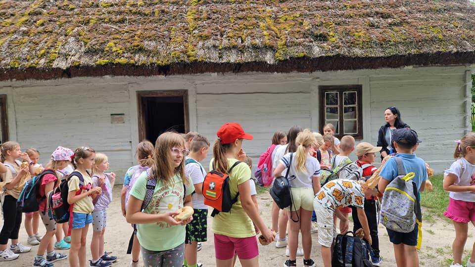 Warsztaty pieczenia chleba rozpoczęły się od krótkiego wprowadzenia na temat historii chleba oraz tradycji piekarniczych. Następnie uczestnicy mieli okazję przygotować swoje własne bułeczki. Dzieci dowiedziały się również, jak powstaje mąka i samodzielnie ją robiły. Było to niesamowite doświadczenie. Na koniec każdy otrzymał pyszne, ciepłe, pachnące pieczywo. Następnym punktem było zwiedzanie skansenu z przewodnikiem. Uczniowie z zainteresowaniem oglądali dawne budynki, słuchali informacji o życiu w dawnych czasach. To był aktywny, pełen atrakcji dzień.
