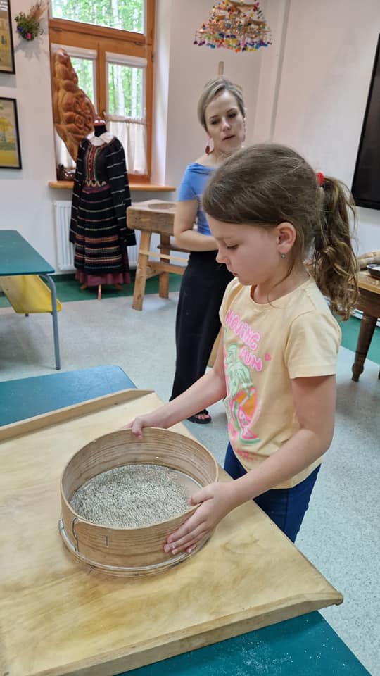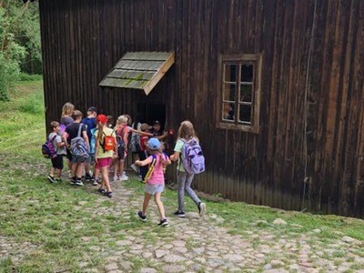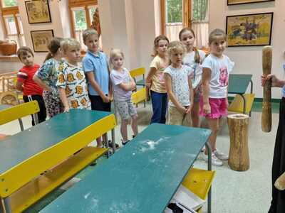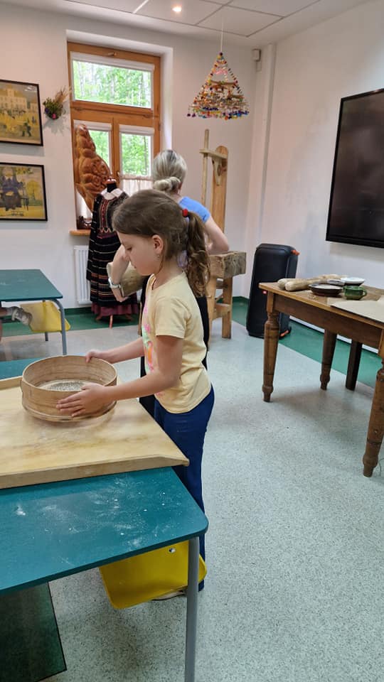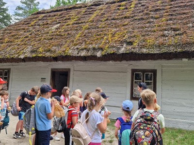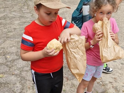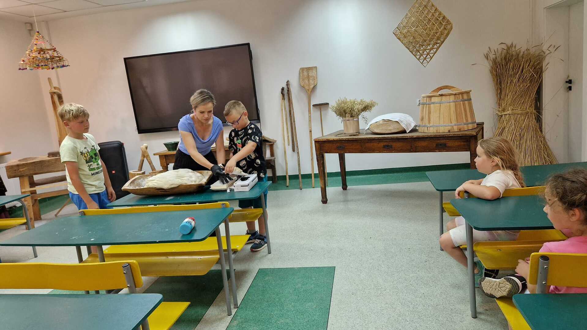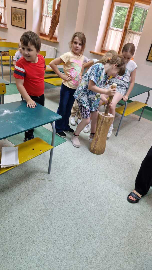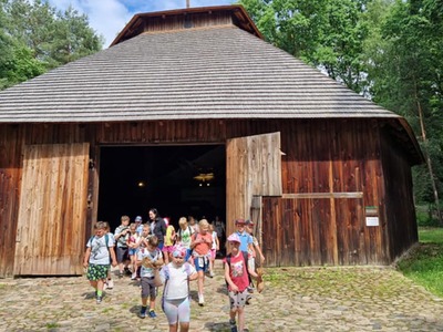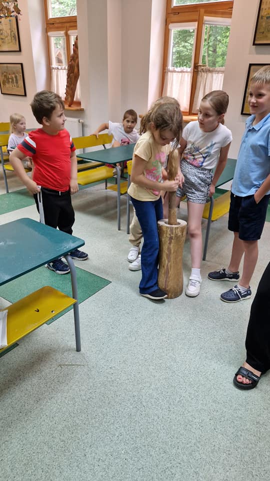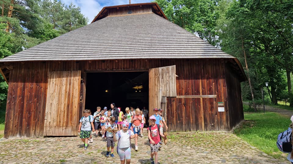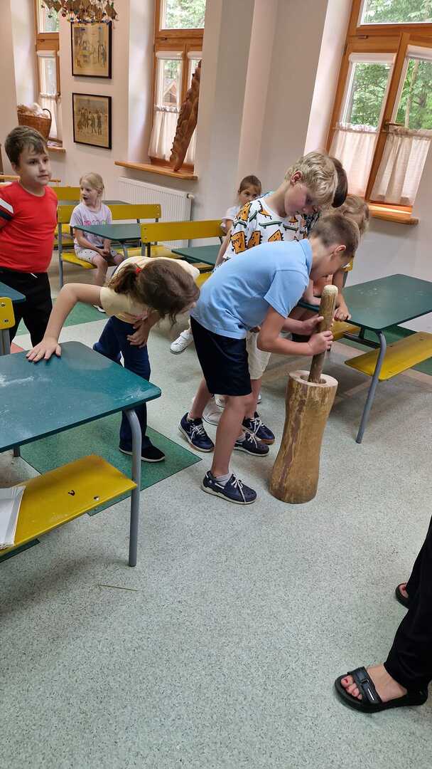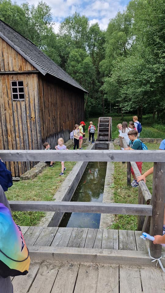 Warsztaty pieczenia chleba rozpoczęły się od krótkiego wprowadzenia na temat historii chleba oraz tradycji piekarniczych. Następnie uczestnicy mieli okazję przygotować swoje własne bułeczki. Dzieci dowiedziały się również, jak powstaje mąka i samodzielnie ją robiły. Było to niesamowite doświadczenie. Na koniec każdy otrzymał pyszne, ciepłe, pachnące pieczywo. Następnym punktem było zwiedzanie skansenu z przewodnikiem. Uczniowie z zainteresowaniem oglądali dawne budynki, słuchali informacji o życiu w dawnych czasach. To był aktywny, pełen atrakcji dzień.