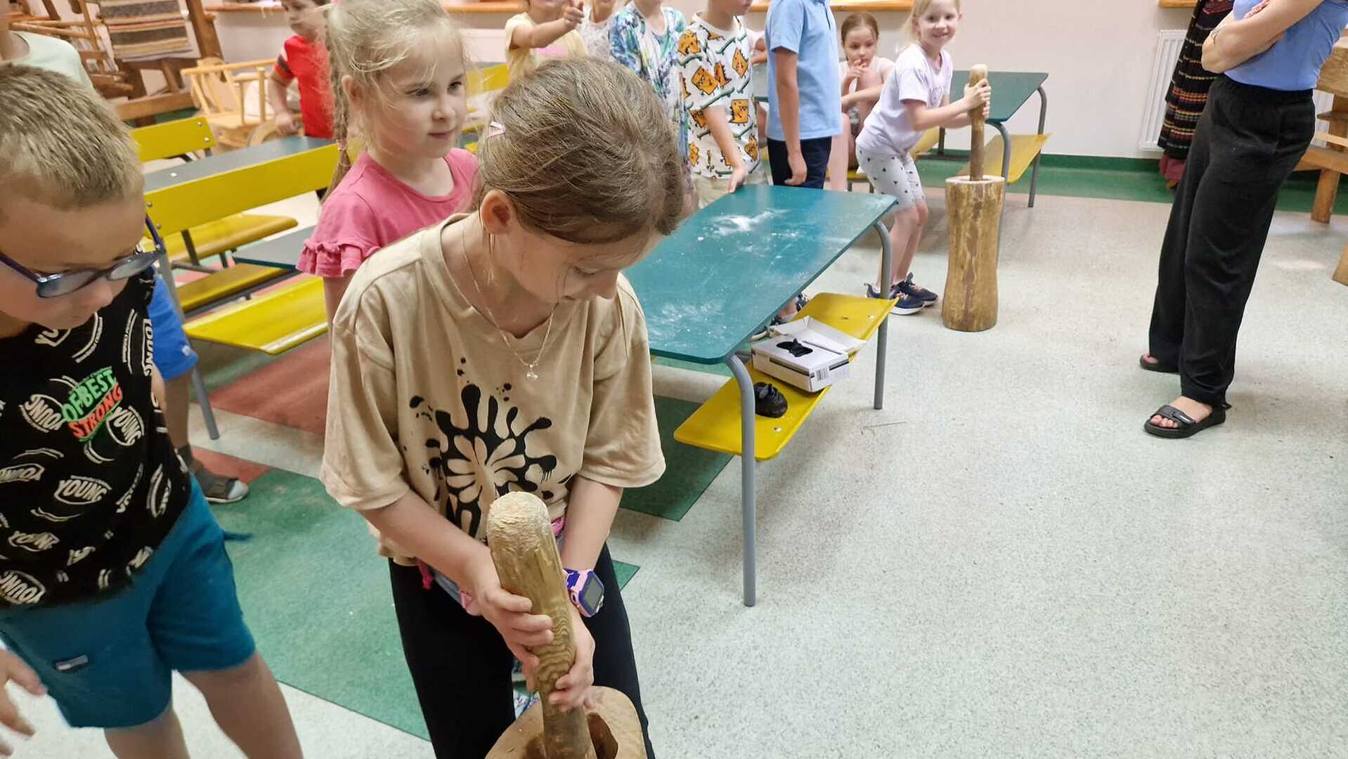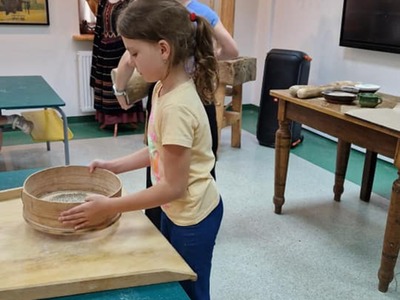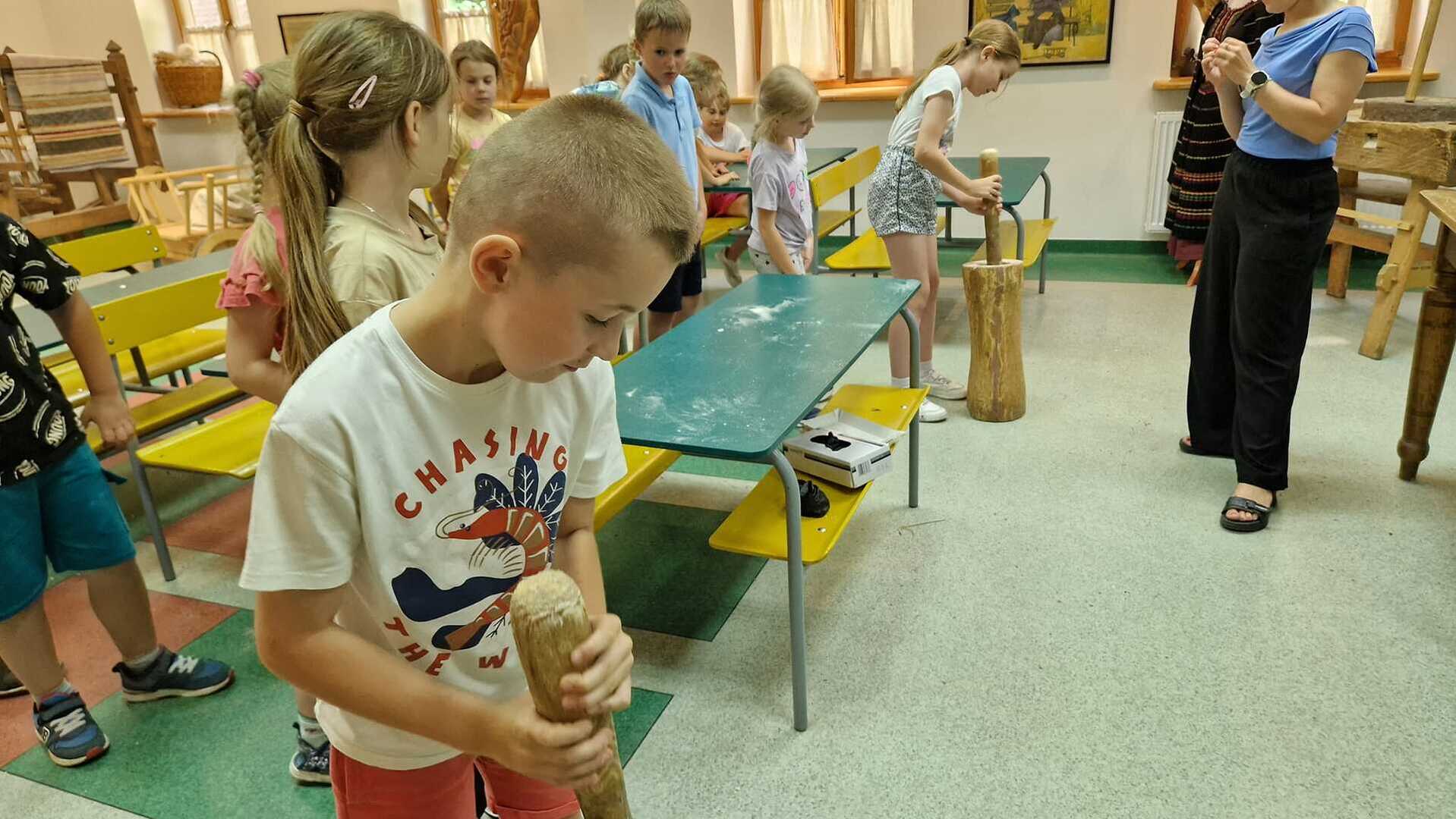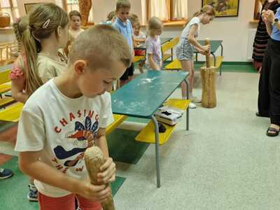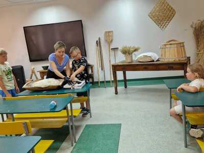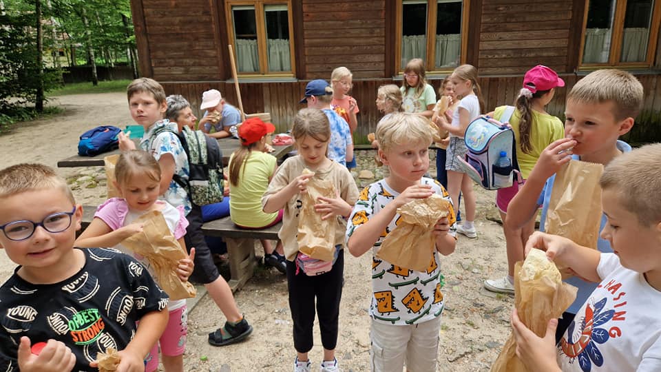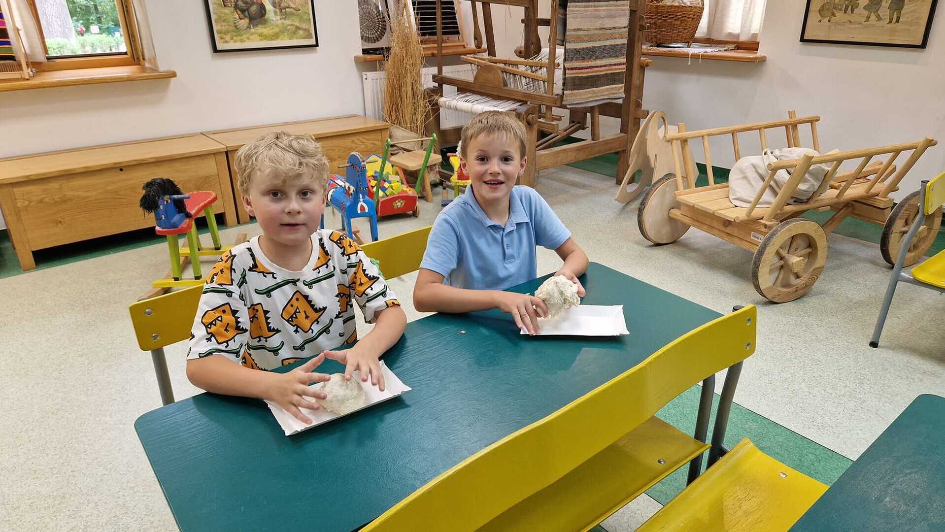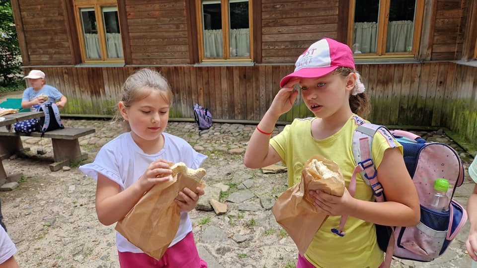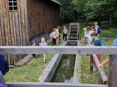 Warsztaty pieczenia chleba rozpoczęły się od krótkiego wprowadzenia na temat historii chleba oraz tradycji piekarniczych. Następnie uczestnicy mieli okazję przygotować swoje własne bułeczki. Dzieci dowiedziały się również, jak powstaje mąka i samodzielnie ją robiły. Było to niesamowite doświadczenie. Na koniec każdy otrzymał pyszne, ciepłe, pachnące pieczywo. Następnym punktem było zwiedzanie skansenu z przewodnikiem. Uczniowie z zainteresowaniem oglądali dawne budynki, słuchali informacji o życiu w dawnych czasach. To był aktywny, pełen atrakcji dzień.