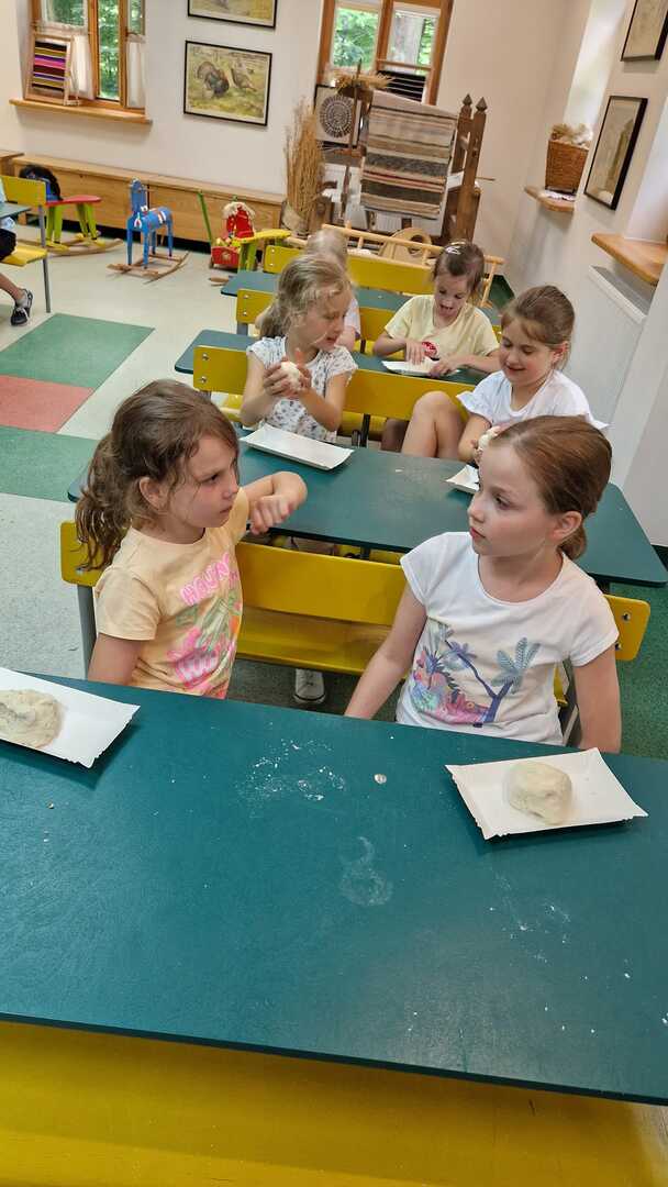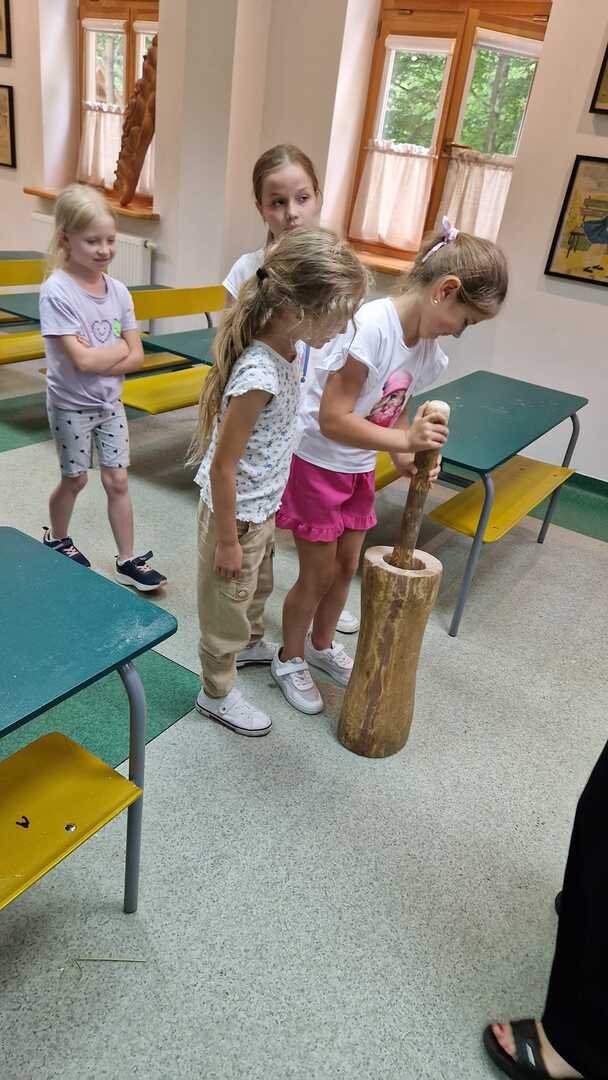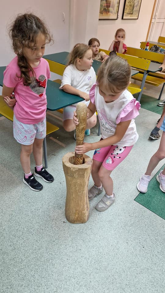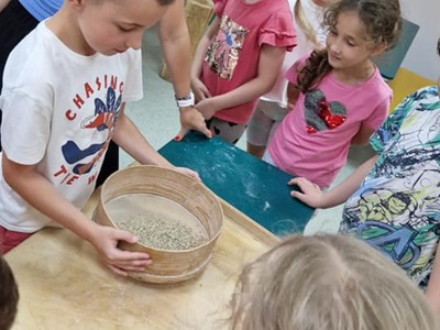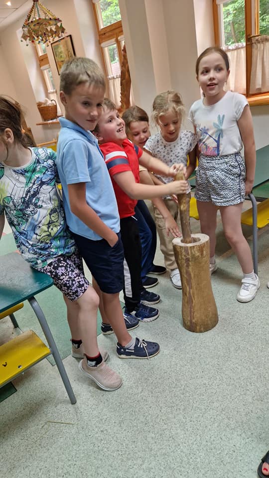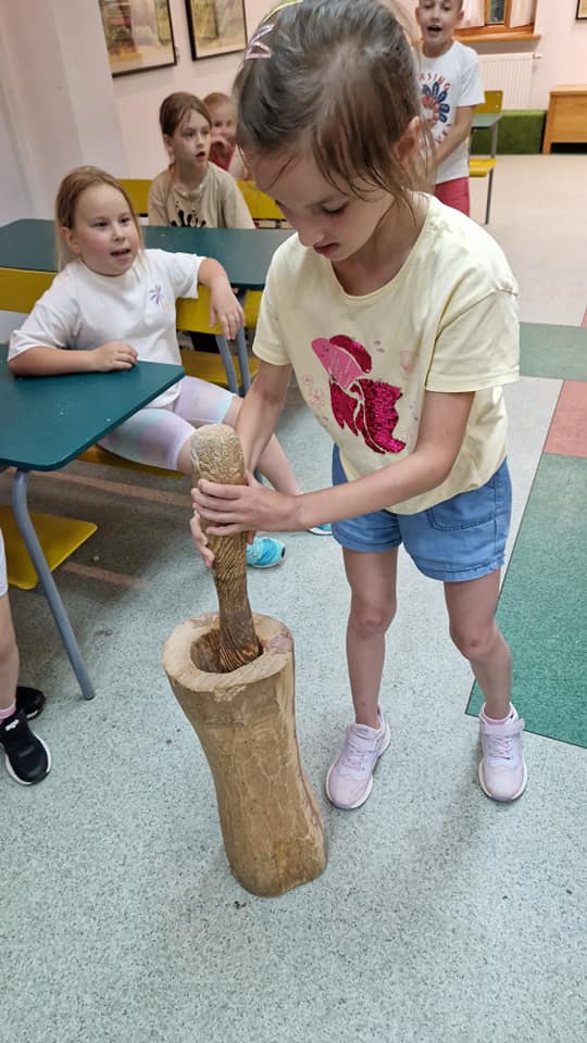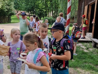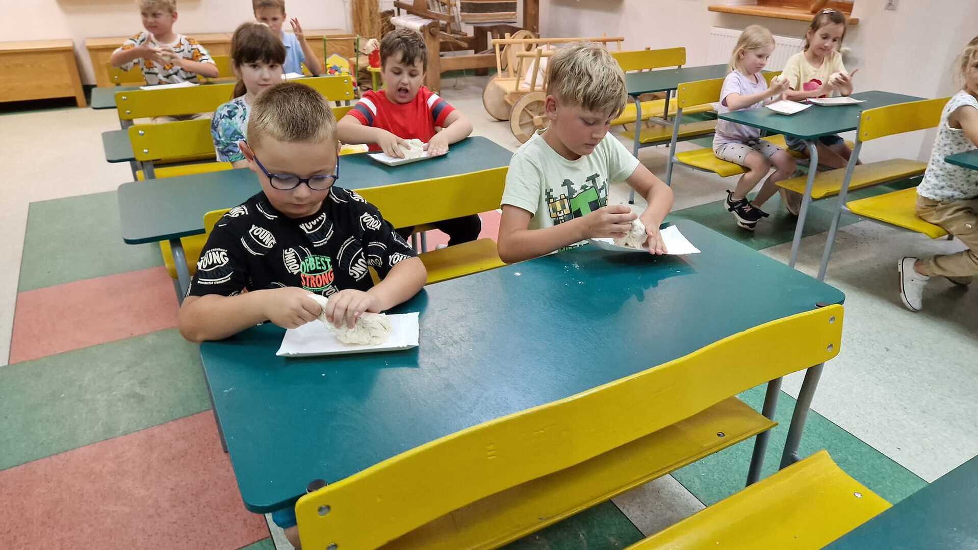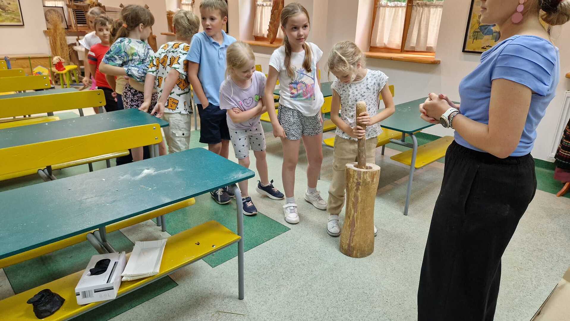 Warsztaty pieczenia chleba rozpoczęły się od krótkiego wprowadzenia na temat historii chleba oraz tradycji piekarniczych. Następnie uczestnicy mieli okazję przygotować swoje własne bułeczki. Dzieci dowiedziały się również, jak powstaje mąka i samodzielnie ją robiły. Było to niesamowite doświadczenie. Na koniec każdy otrzymał pyszne, ciepłe, pachnące pieczywo. Następnym punktem było zwiedzanie skansenu z przewodnikiem. Uczniowie z zainteresowaniem oglądali dawne budynki, słuchali informacji o życiu w dawnych czasach. To był aktywny, pełen atrakcji dzień.