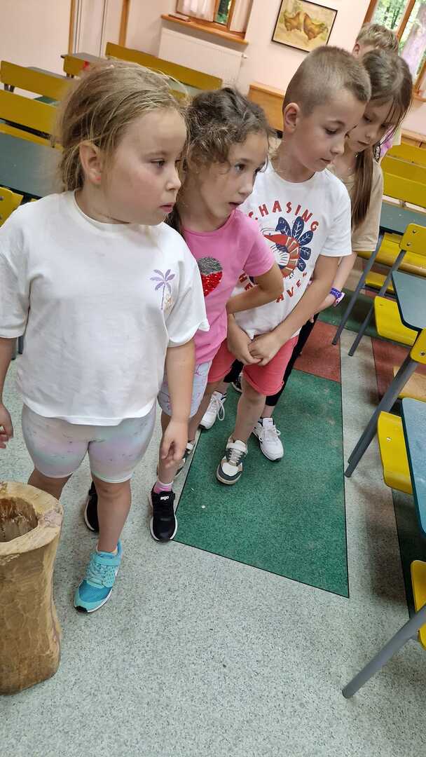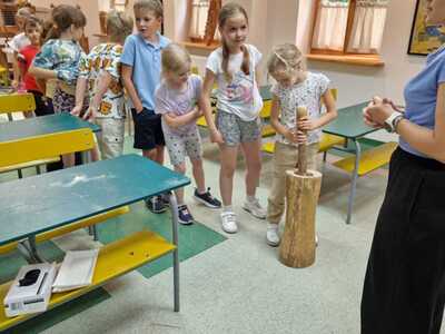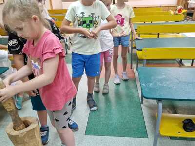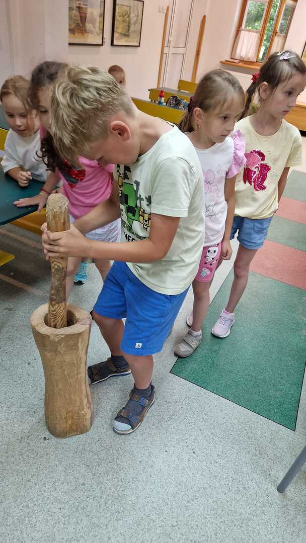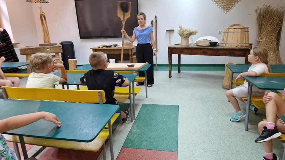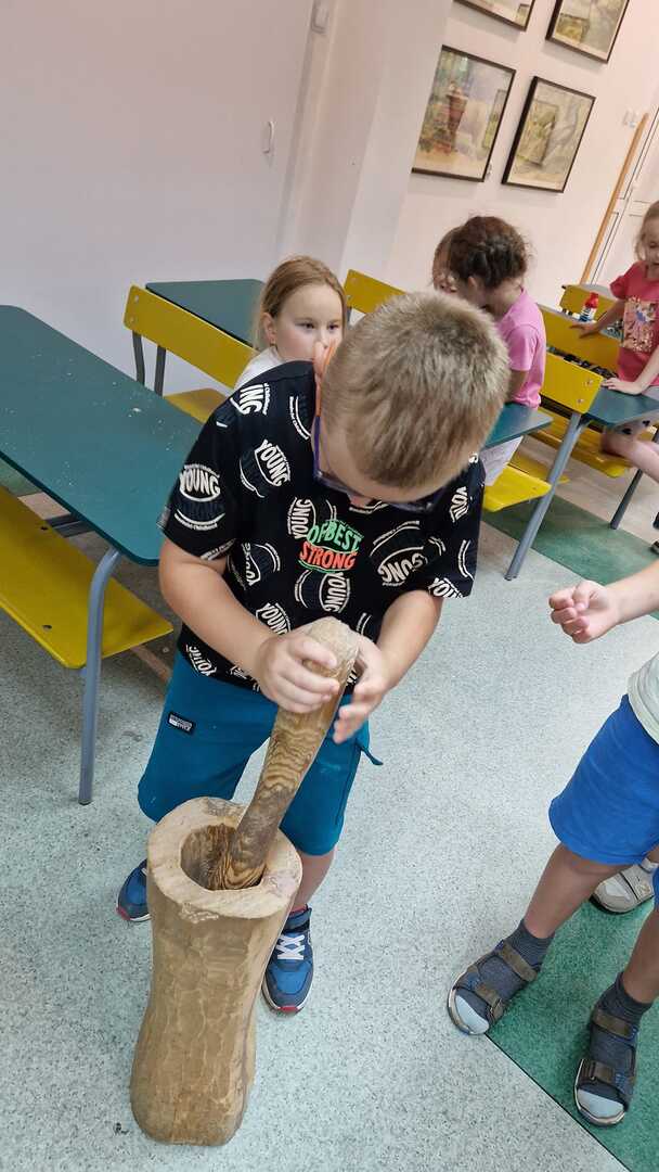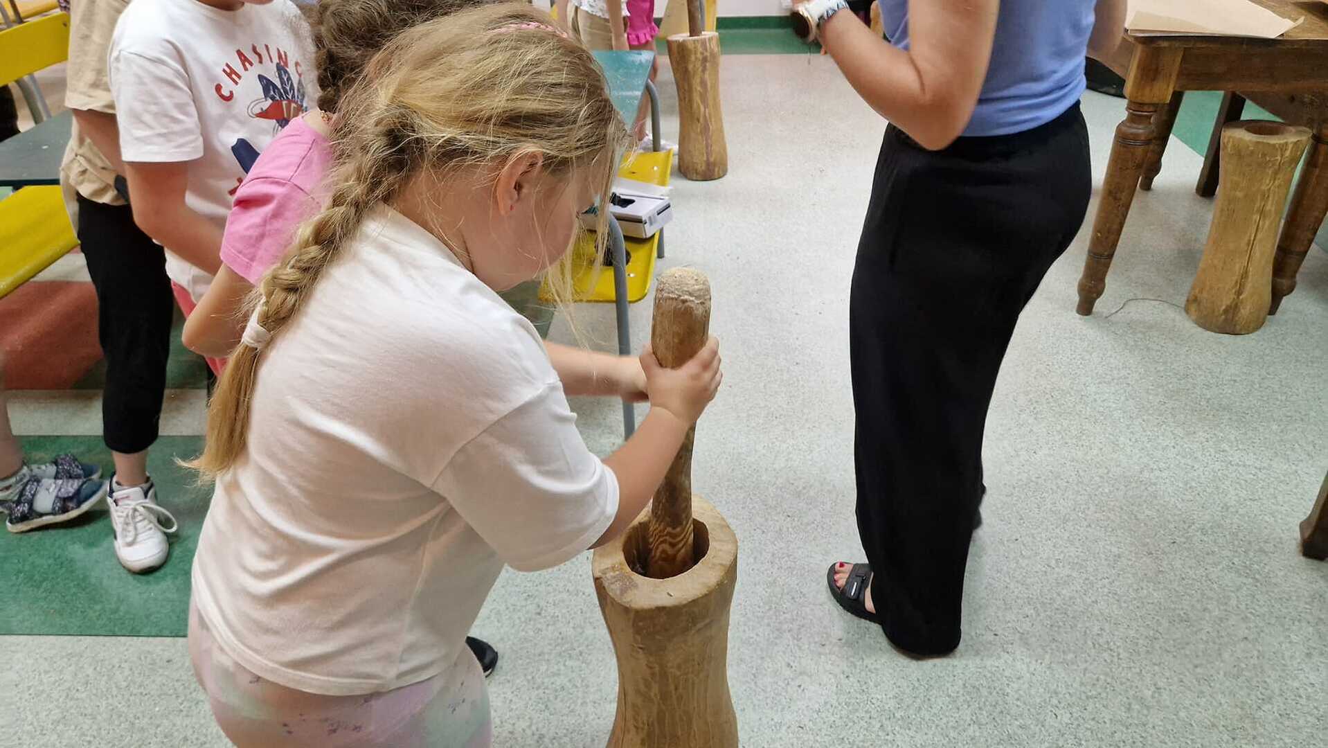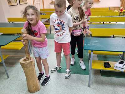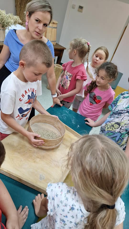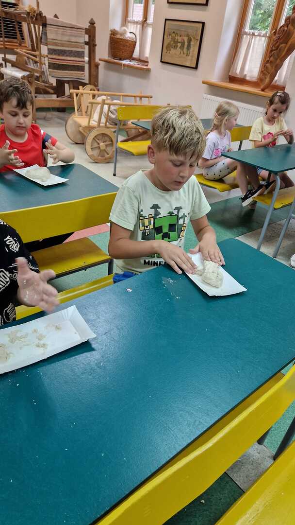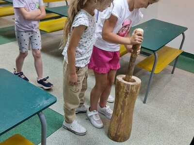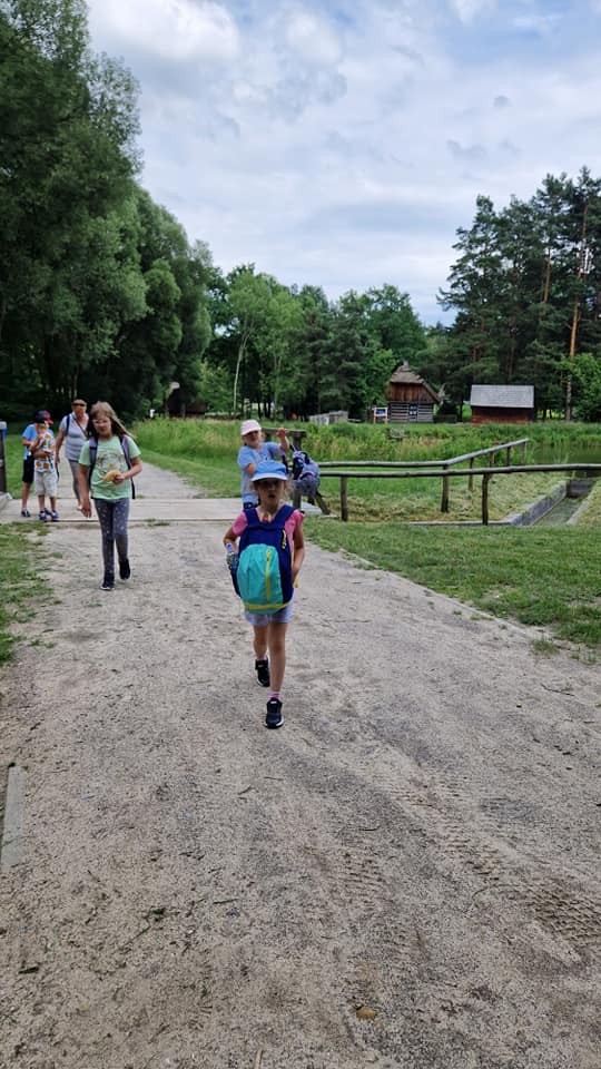 Warsztaty pieczenia chleba rozpoczęły się od krótkiego wprowadzenia na temat historii chleba oraz tradycji piekarniczych. Następnie uczestnicy mieli okazję przygotować swoje własne bułeczki. Dzieci dowiedziały się również, jak powstaje mąka i samodzielnie ją robiły. Było to niesamowite doświadczenie. Na koniec każdy otrzymał pyszne, ciepłe, pachnące pieczywo. Następnym punktem było zwiedzanie skansenu z przewodnikiem. Uczniowie z zainteresowaniem oglądali dawne budynki, słuchali informacji o życiu w dawnych czasach. To był aktywny, pełen atrakcji dzień.