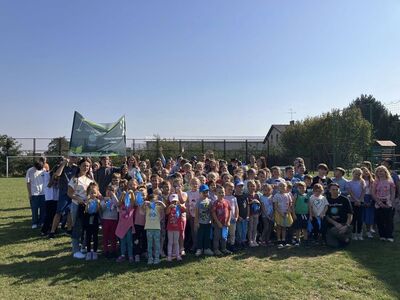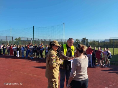 Uczniowie, nauczyciele i pracownicy szkoły zachowując środki bezpieczeństwa sprawnie opuścili budynek szkoły.