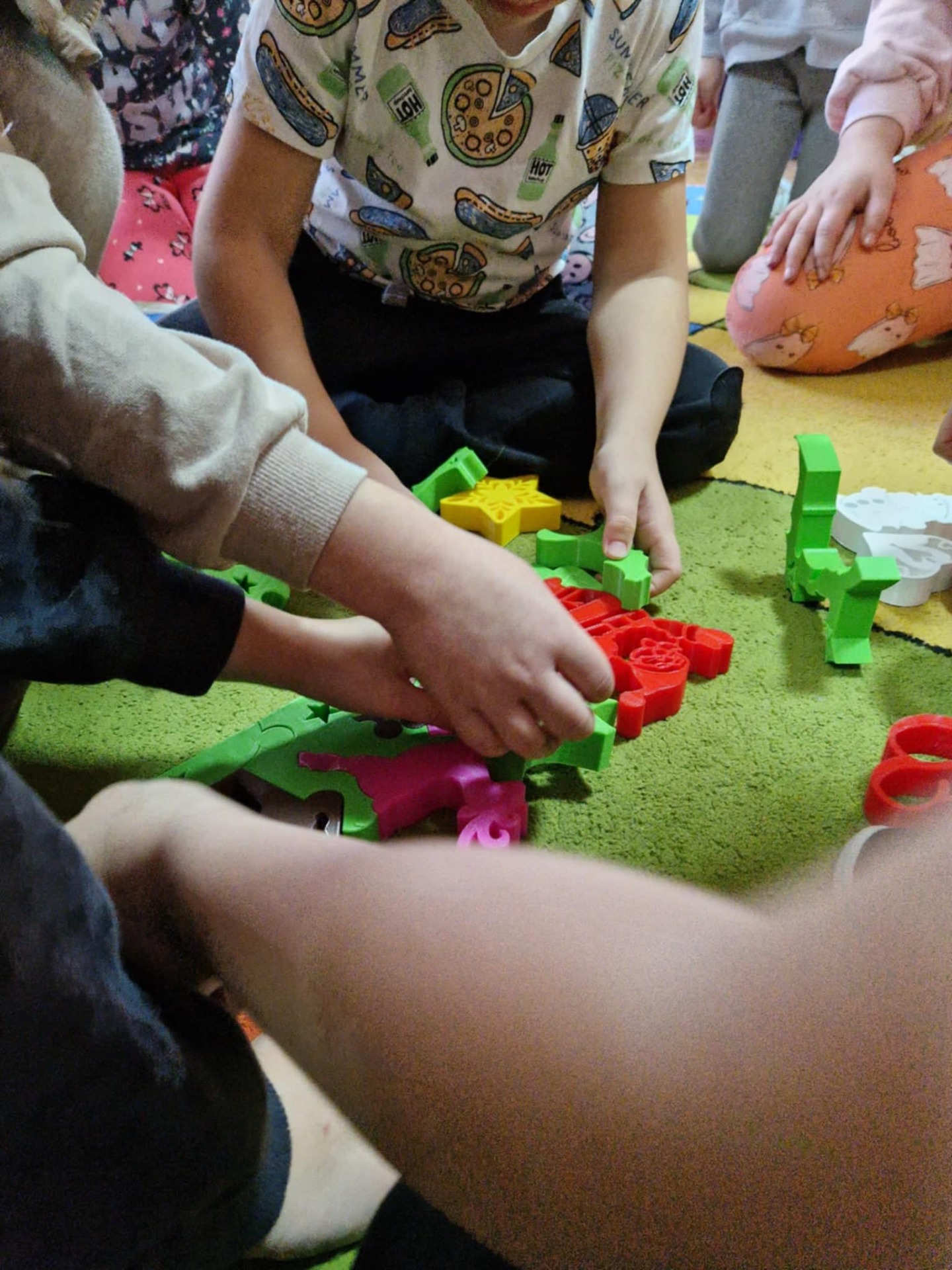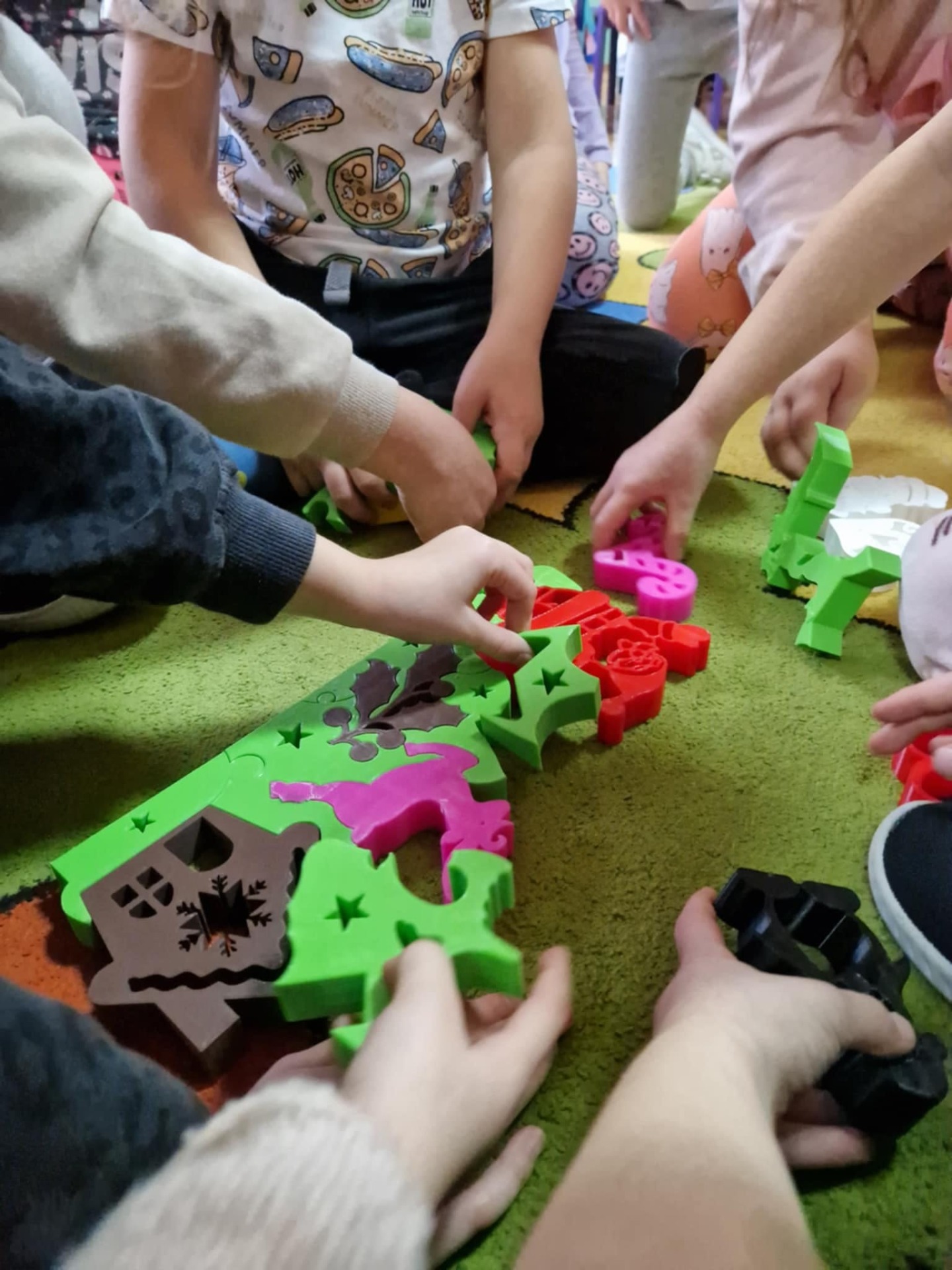 Wspólna praca nad układaniem choinki była nie tylko świetną zabawą, ale również doskonałą okazją do rozwijania umiejętności manualnych, współpracy i kreatywności. Dzieci z entuzjazmem dobierały poszczególne fragmenty, starając się dopasować je w odpowiednich miejscach, co wprowadziło je w świąteczny nastrój.