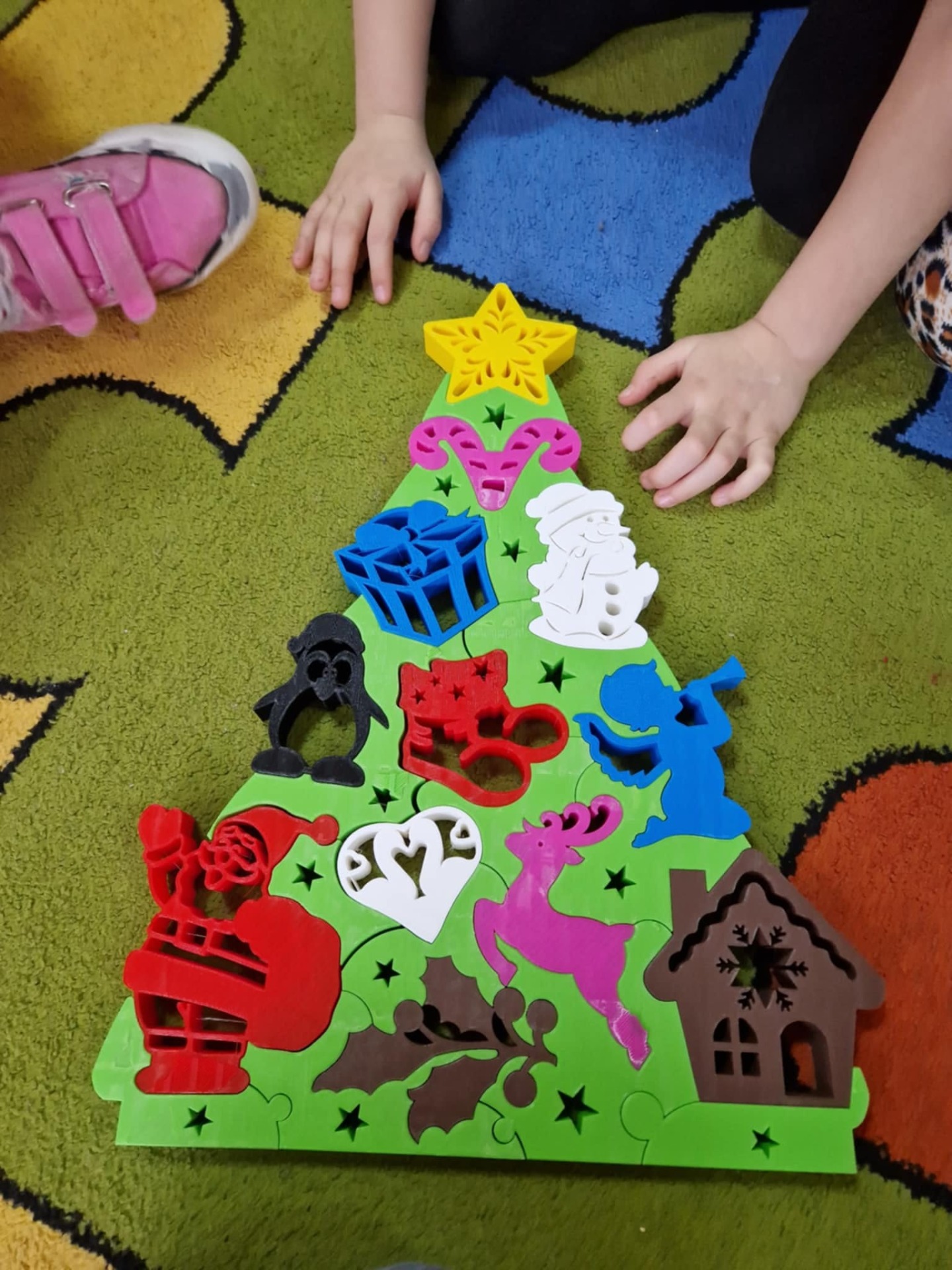 Efekt końcowy był imponujący – kolorowa choinka z puzzli, która wprowadziła radość i magię świąt do naszej przedszkolnej przestrzeni. To doświadczenie pokazało, jak nowoczesne technologie, takie jak druk 3D, mogą być inspirującym narzędziem w edukacji i zabawie.