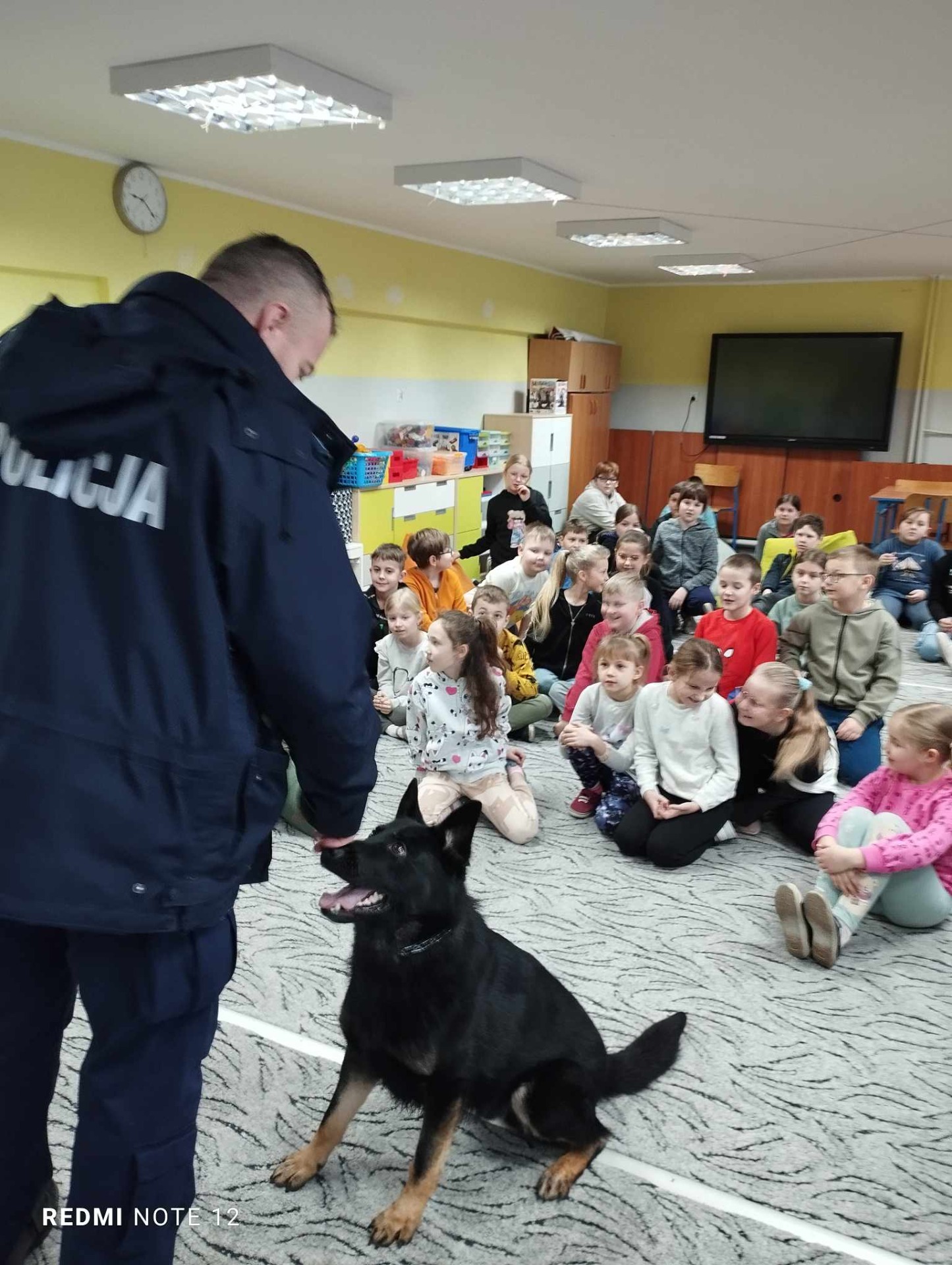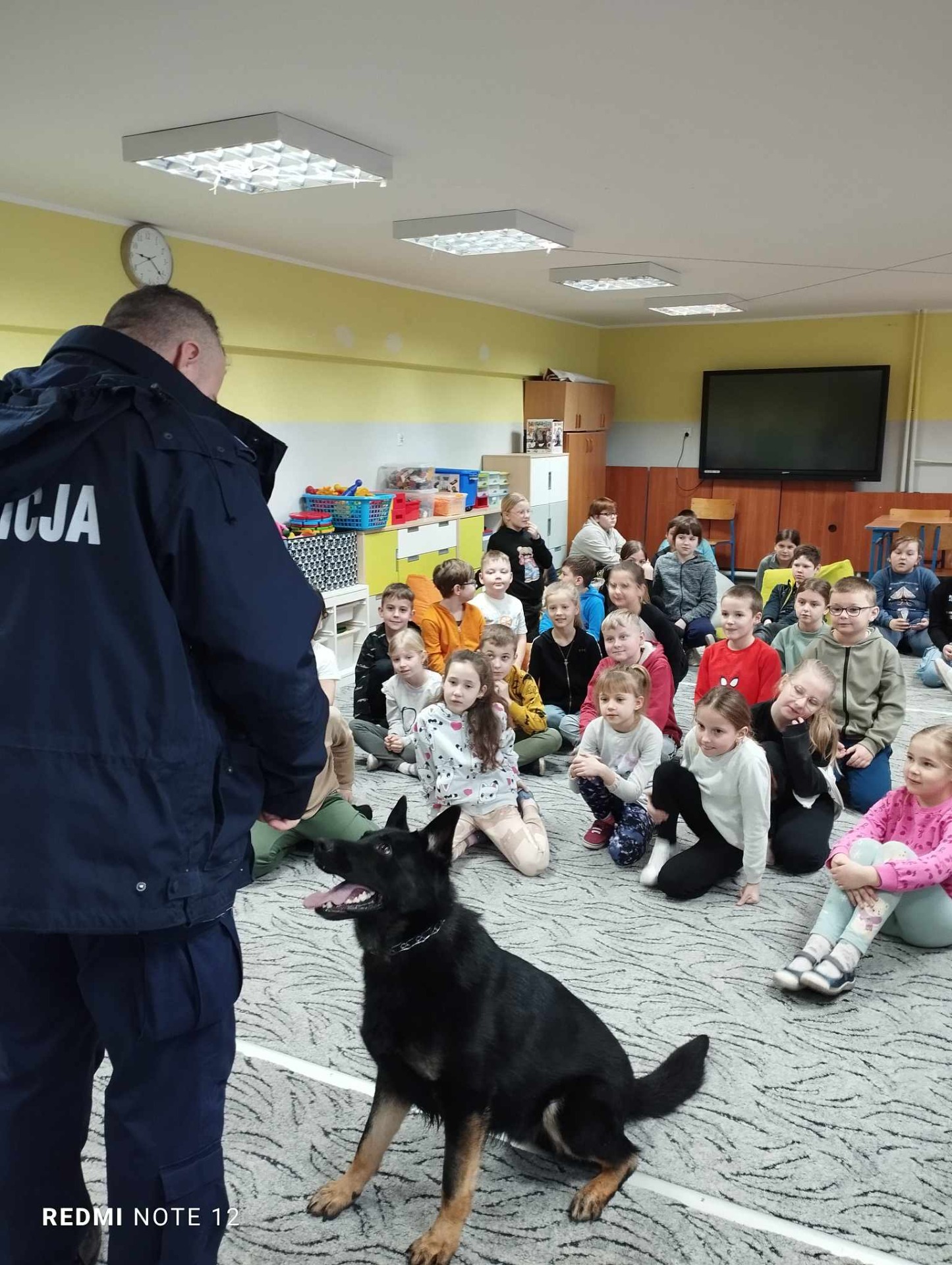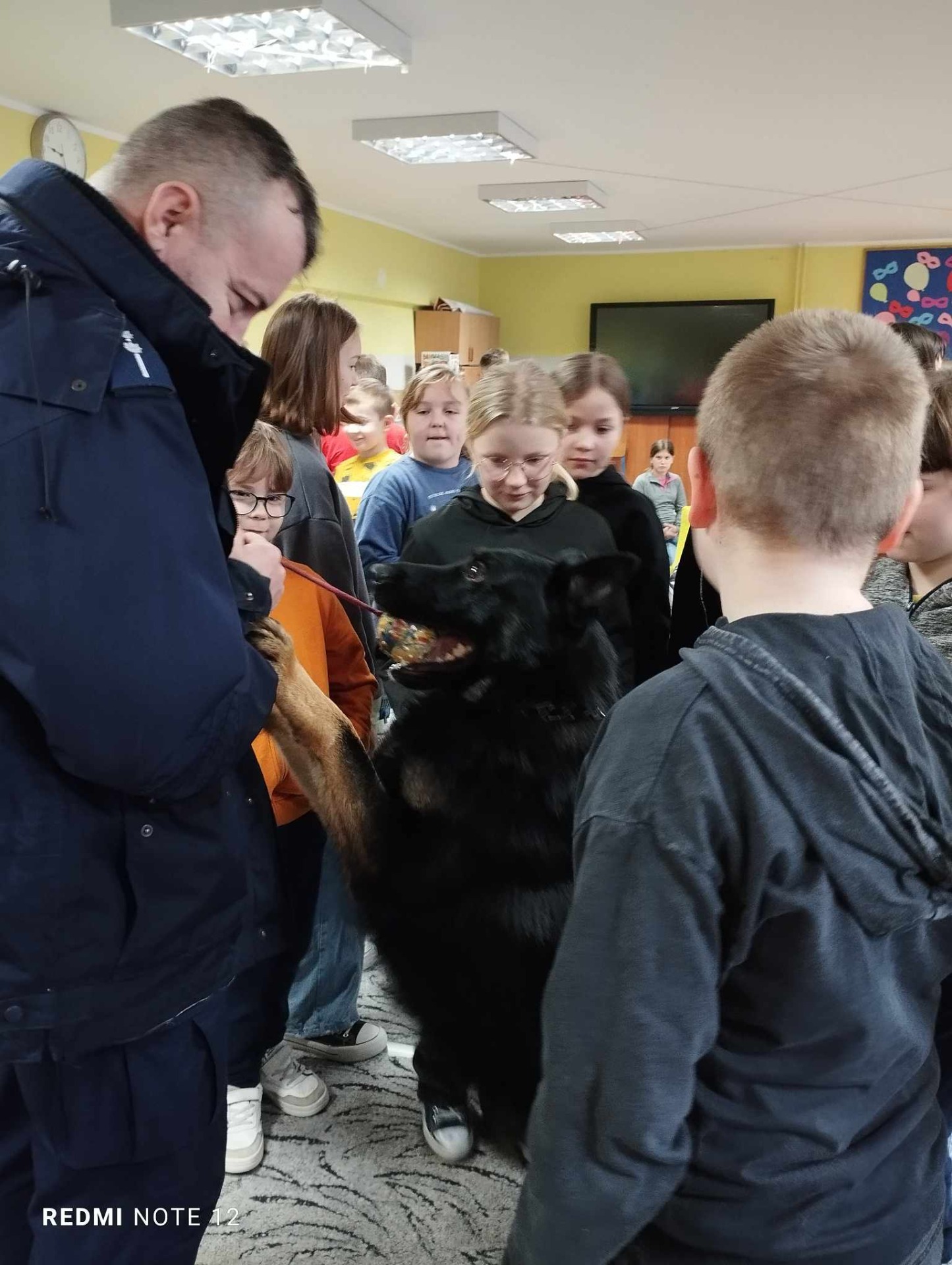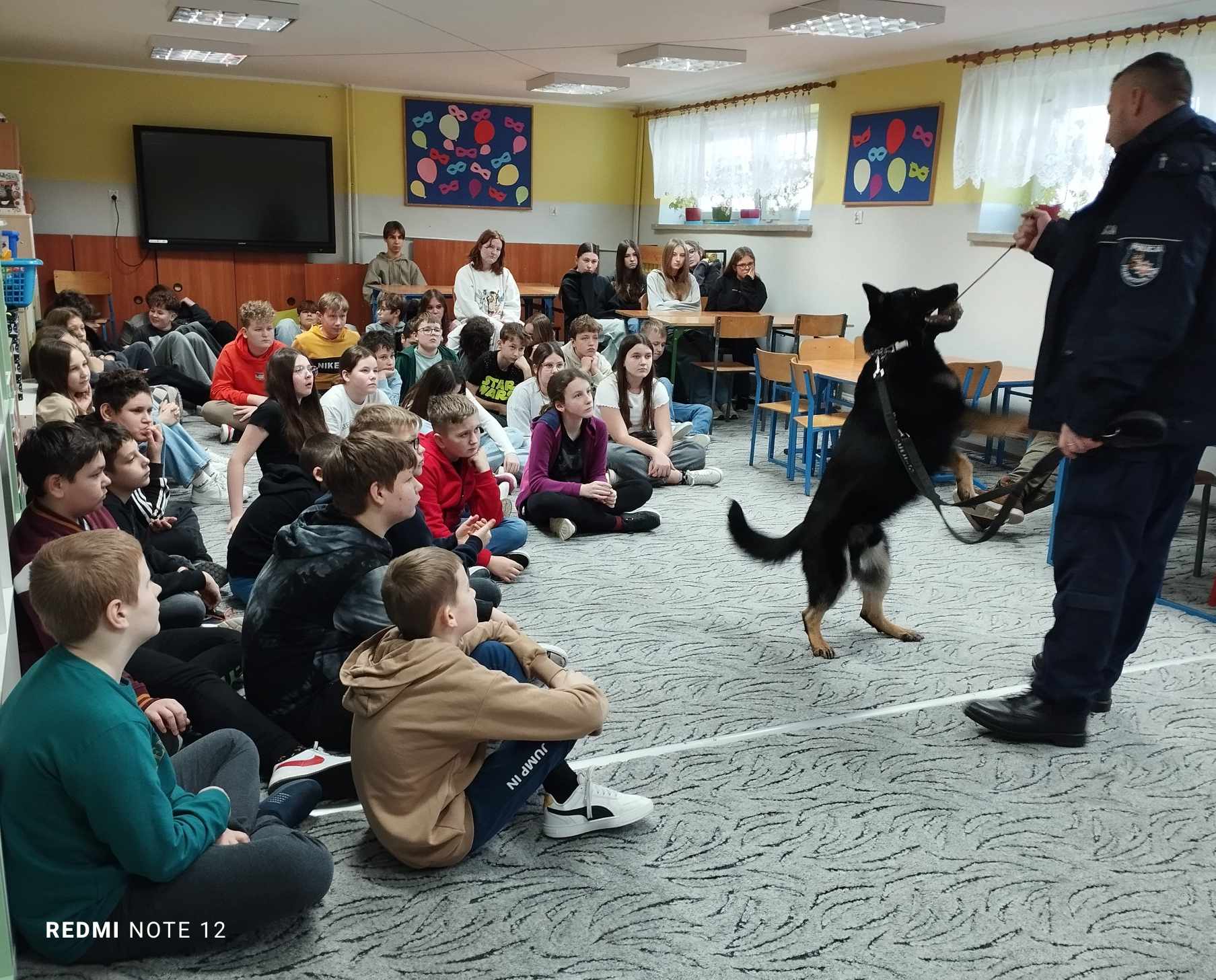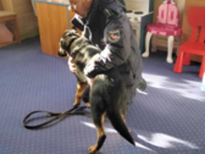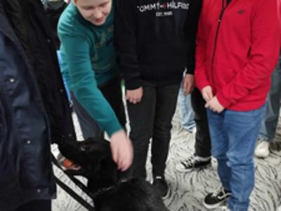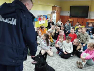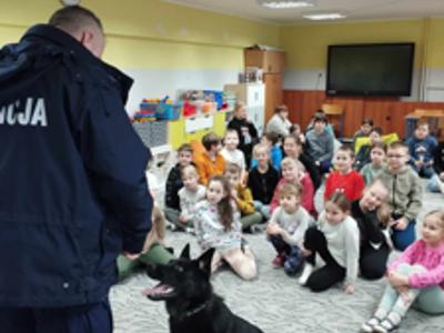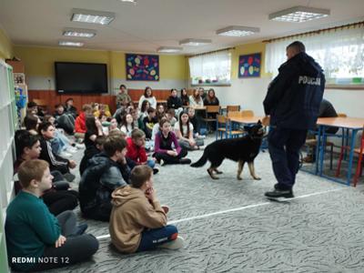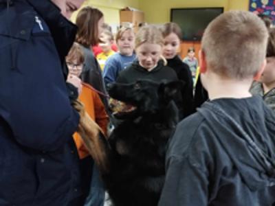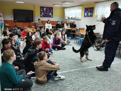 Przewodnik policyjny opowiedział o znaczeniu psa w Policji oraz pokazał naszym uczniom wspaniale umiejętności ,,Rewersa".