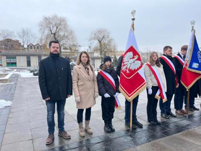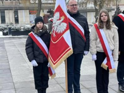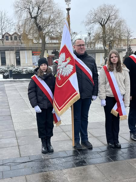 Dyrektor szkoły Agata Kępka wraz z delegacją w składzie: Maja Jaworek, Gabriela Głowacka, Pan Arkadiusz Kępka oraz Przewodniczący Rady Rodziców Pan Paweł Binkiewicz brali udział w obchodach pod pomnikiem na Placu Wolności w Grójcu.