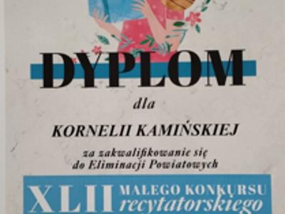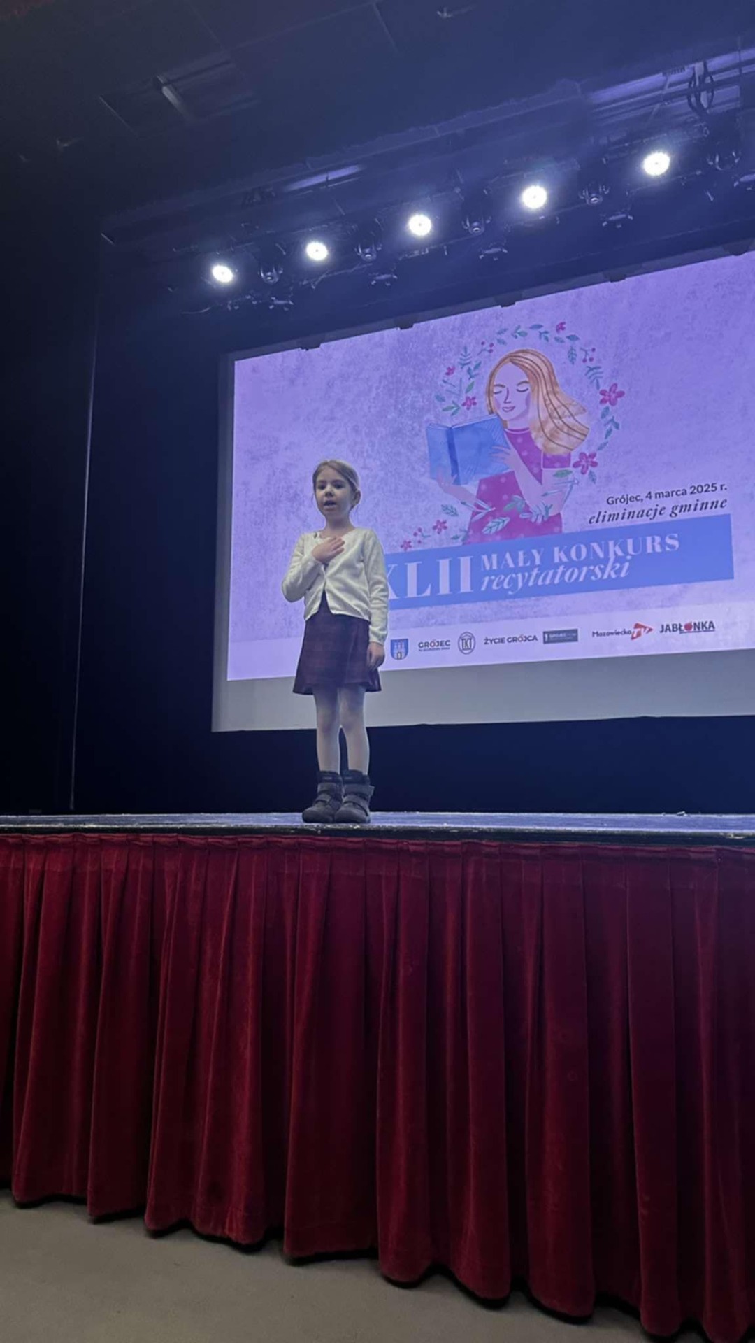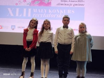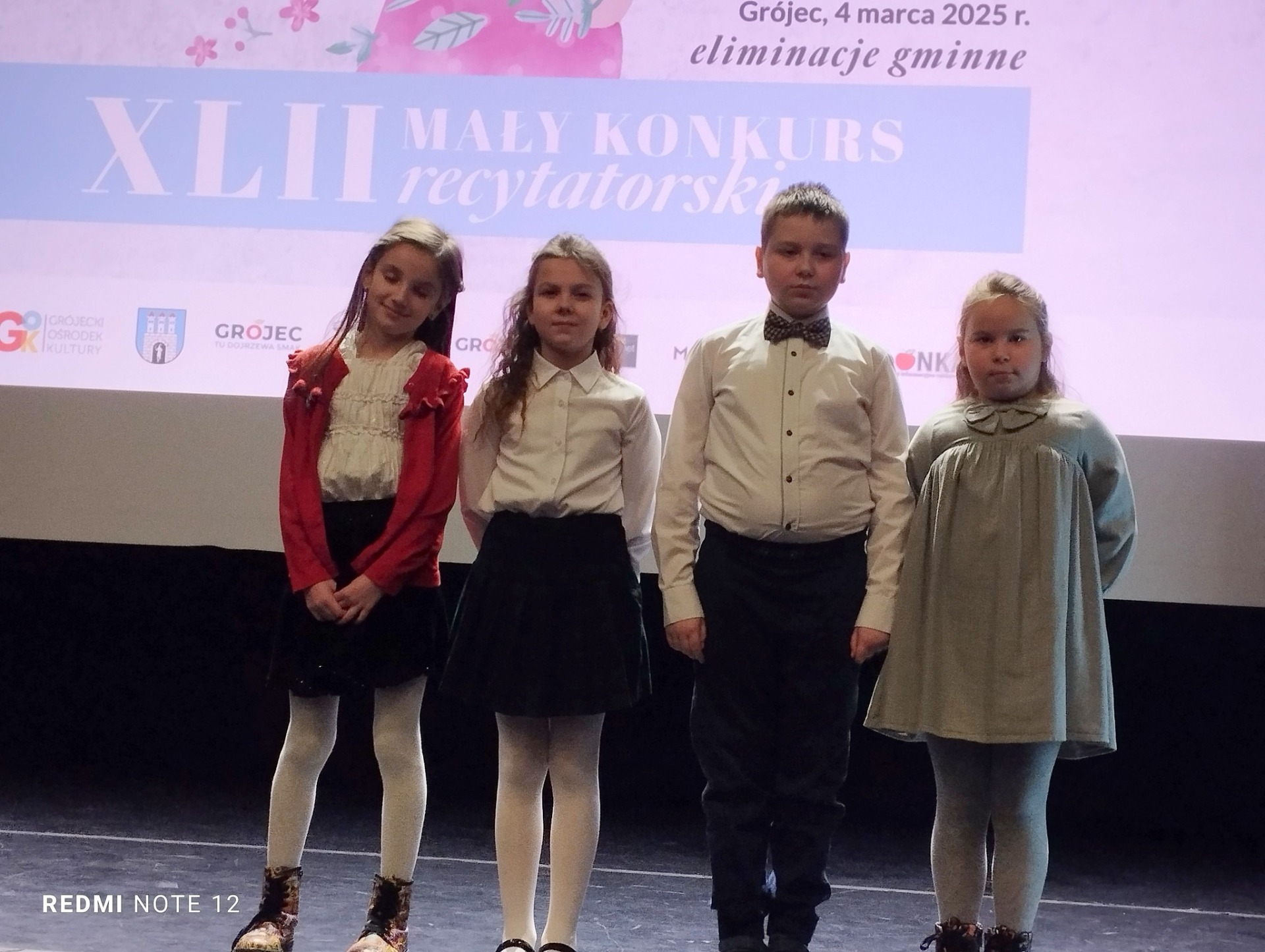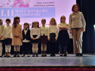 Dziś w Grójecki Ośrodek Kultury odbyły się eliminacje do XLII Małego Konkursu Recytatorskiego. W pierwszej kategorii naszą szkołę reprezentowały uczennice klasy 0: Amelia Adamczyk, Amelia Binkiewicz, Marcelina Maj, Michalina Maciak. W drugiej kategorii talentem recytatorskim wykazali się Lena Parol- kl 2, Hanna Szymańczak - kl 2, Kornelia Kamińska- kl. 3 oraz Wojciech Kacperski- kl. 4.