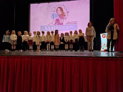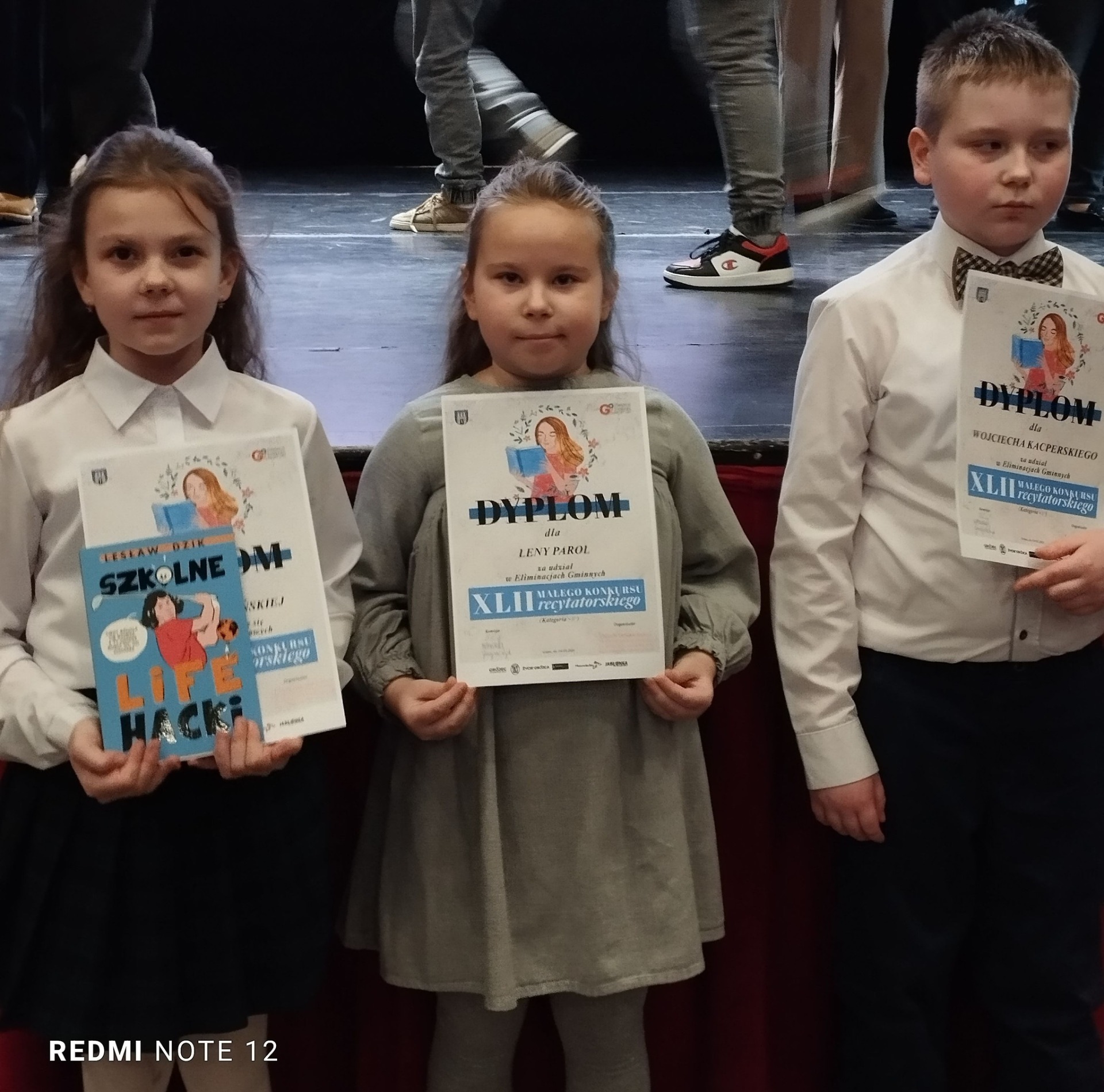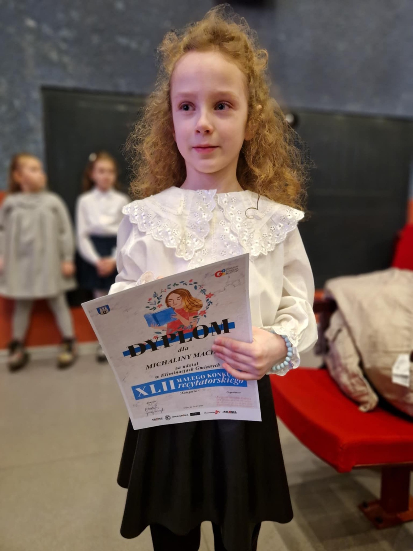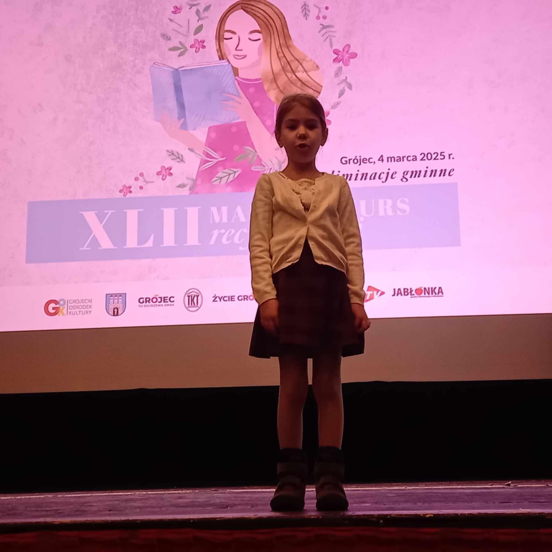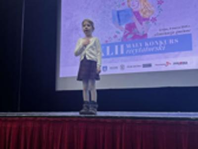 Amelia Binkiewicz zaprezentowała wiersz pt. "Mistrz" L.J.Kern, Michalina Maciak "Krasnoludki" E. Szelburg- Zarębiny, Marcelina Maj "Samochwała" J. Brzechwy, Amelia Adamczyk " Kłamczucha" J. Brzechwy. Lena Parol " Dziurki w serze" W. Chotomskiej, Kornelia Kamińska "Doświadczenie" M.Strzałkowskiej, Hanna Szymańczak " Na straganie" J. Brzechwy, Wojciech Kacperski " Spóźniony słowik" J. Tuwima. Wszyscy nasi przedstawiciele zaprezentowali recytację na bardzo wysokim poziomie. Zaowocowało to awansem aż dwóch naszych uczennic: Amelii Adamczyk oraz Kornelii Kamińskiej do drugiego etapu konkursu