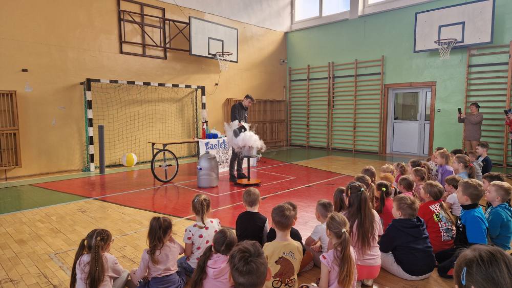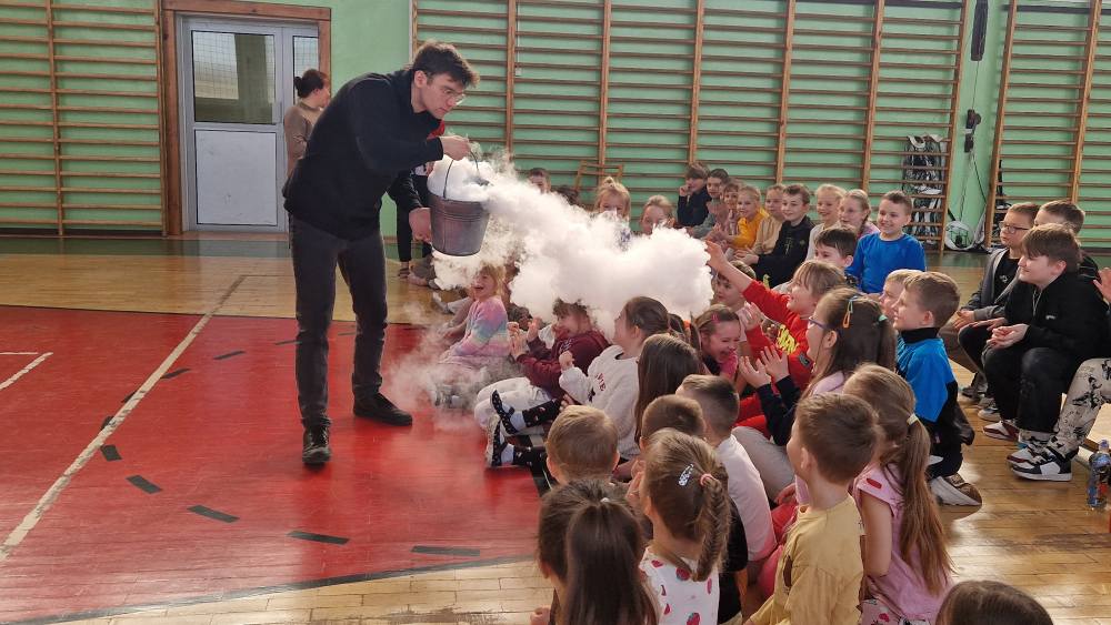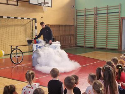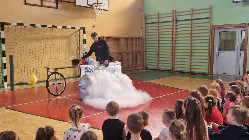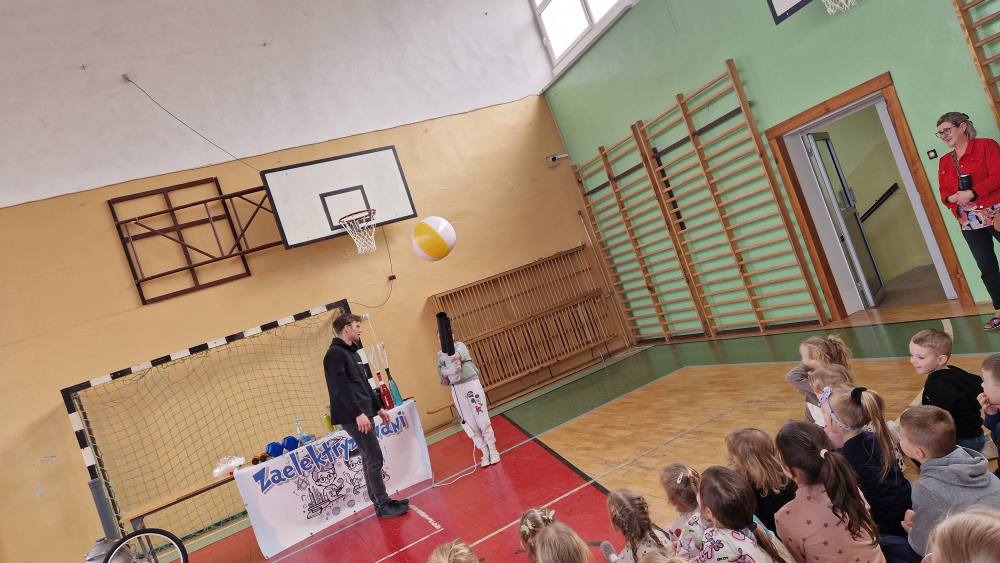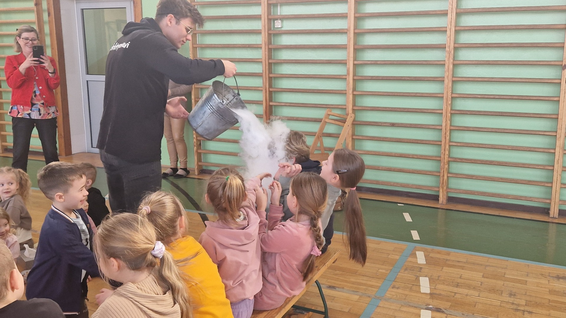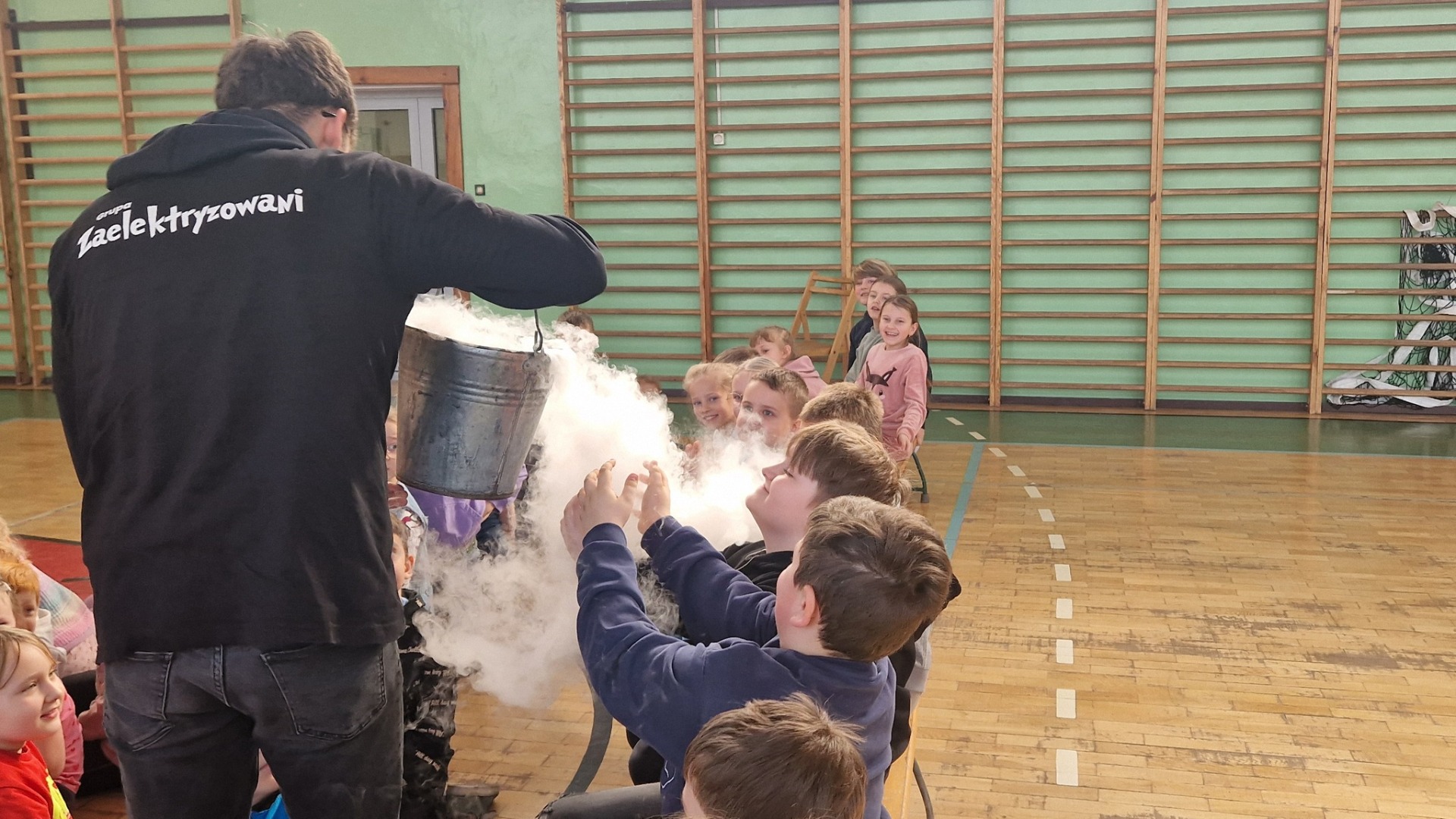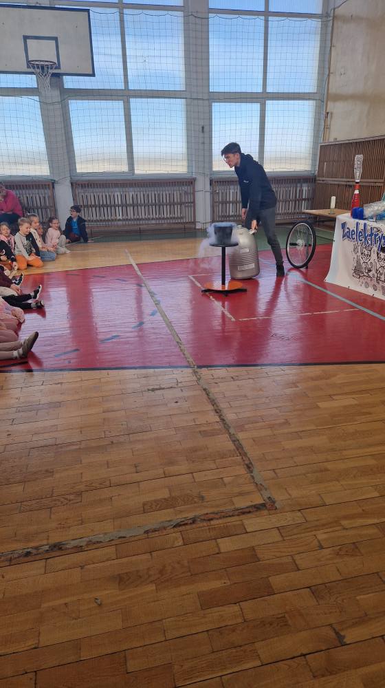 Dziś nasza sala gimnastyczna zamieniła się w laboratorium fizyczno – chemiczne, dzięki prowadzącemu z grupy „Zaelektryzowani”, który w bardzo ciekawy sposób przybliżył uczniom wiedzę z zakresu fizyki i chemii. W czasie tej niecodziennej lekcji nasz gość zaprezentował widowiskowe eksperymenty i doświadczenia związane z naukami przyrodniczymi. Dotyczyły one m.in. mechaniki płynów, grawitacji, właściwości butanu czy ciekłego azotu,siły odśrodkowej, efektu żyroskopowego. Dzieci aktywnie brały udział w pokazie. Mogły bezpośrednio zaobserwować zjawisko lewitującej piłki, nadmuchiwanie rękawa foliowego czy „palącej się” podłogi w szkole