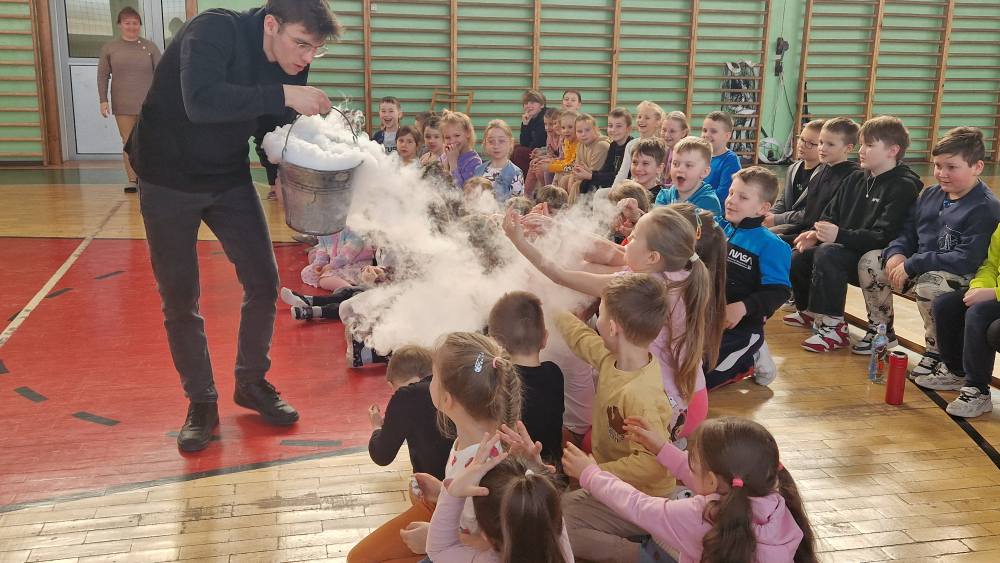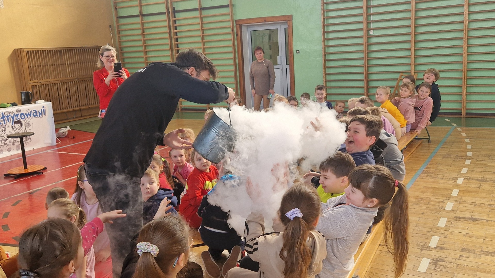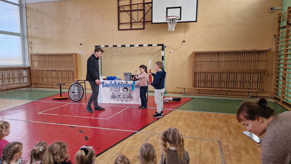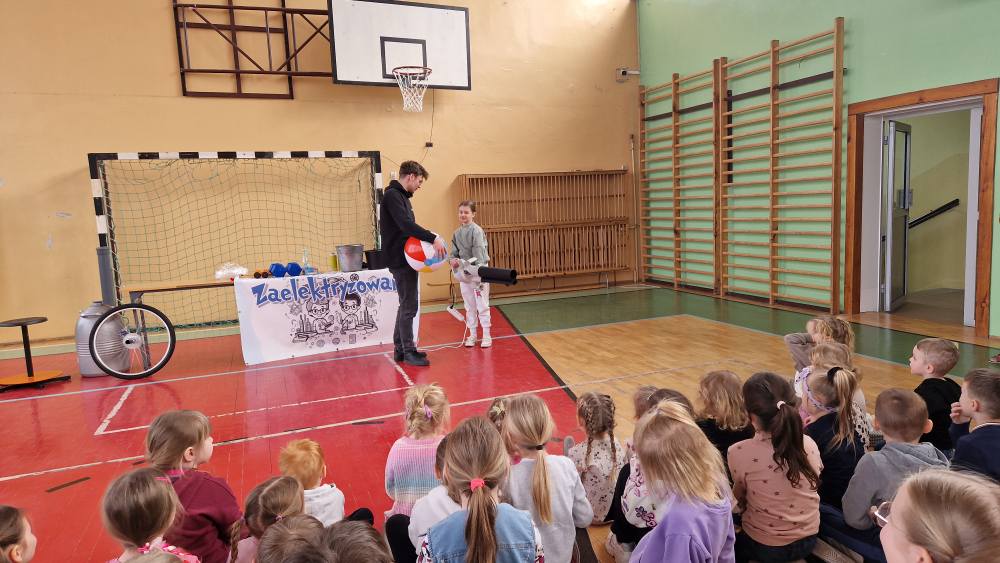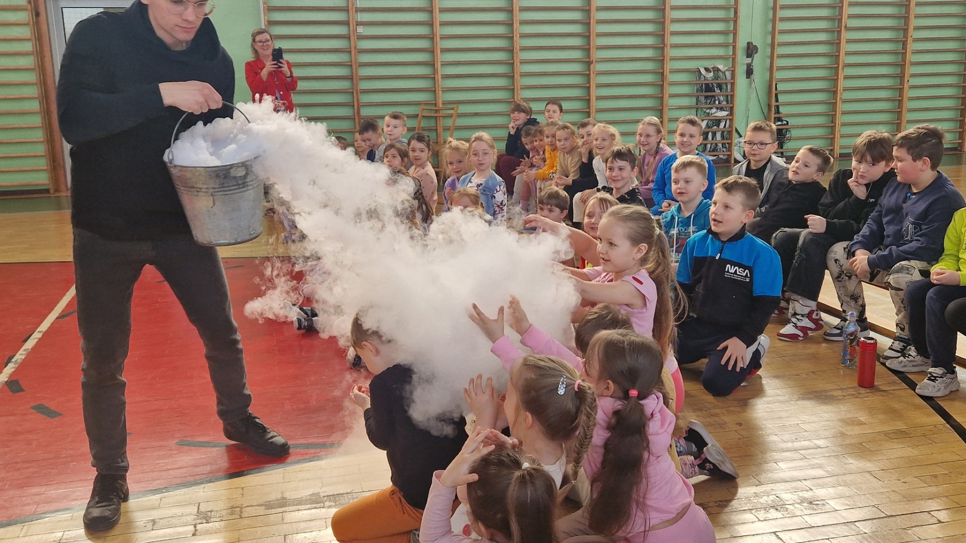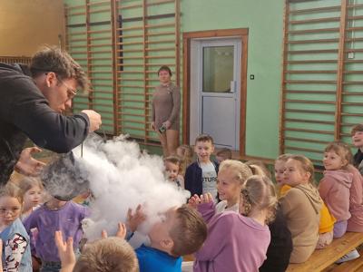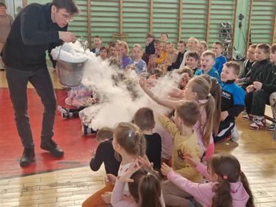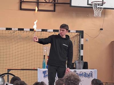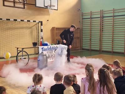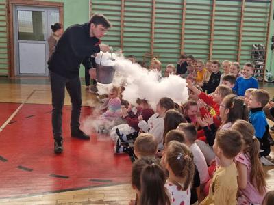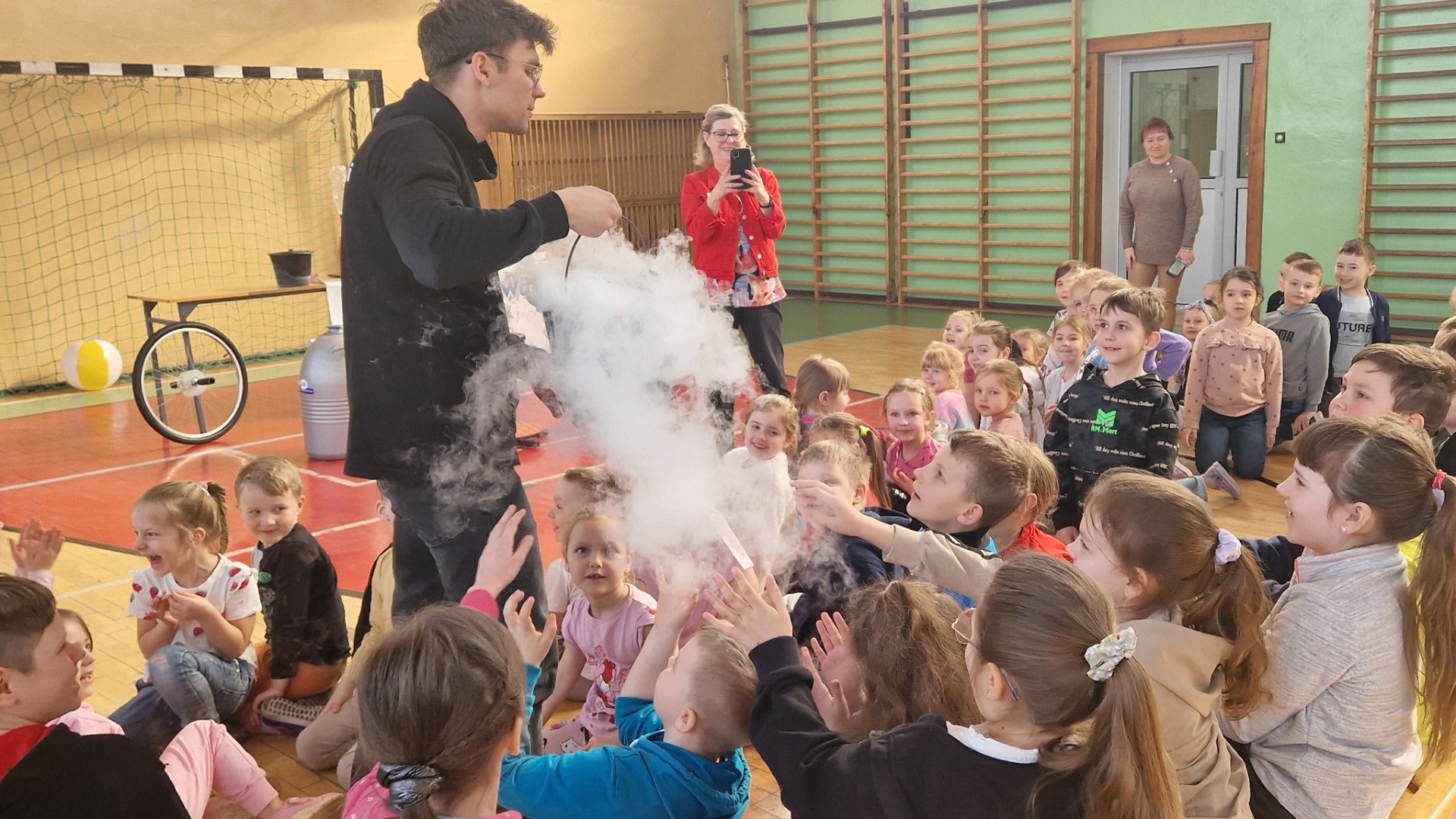 Dziś nasza sala gimnastyczna zamieniła się w laboratorium fizyczno – chemiczne, dzięki prowadzącemu z grupy „Zaelektryzowani”, który w bardzo ciekawy sposób przybliżył uczniom wiedzę z zakresu fizyki i chemii. W czasie tej niecodziennej lekcji nasz gość zaprezentował widowiskowe eksperymenty i doświadczenia związane z naukami przyrodniczymi. Dotyczyły one m.in. mechaniki płynów, grawitacji, właściwości butanu czy ciekłego azotu,siły odśrodkowej, efektu żyroskopowego. Dzieci aktywnie brały udział w pokazie. Mogły bezpośrednio zaobserwować zjawisko lewitującej piłki, nadmuchiwanie rękawa foliowego czy „palącej się” podłogi w szkole