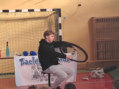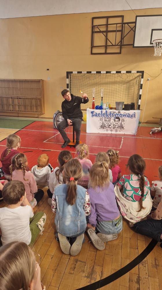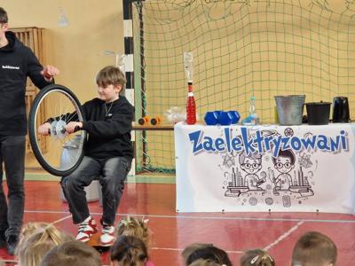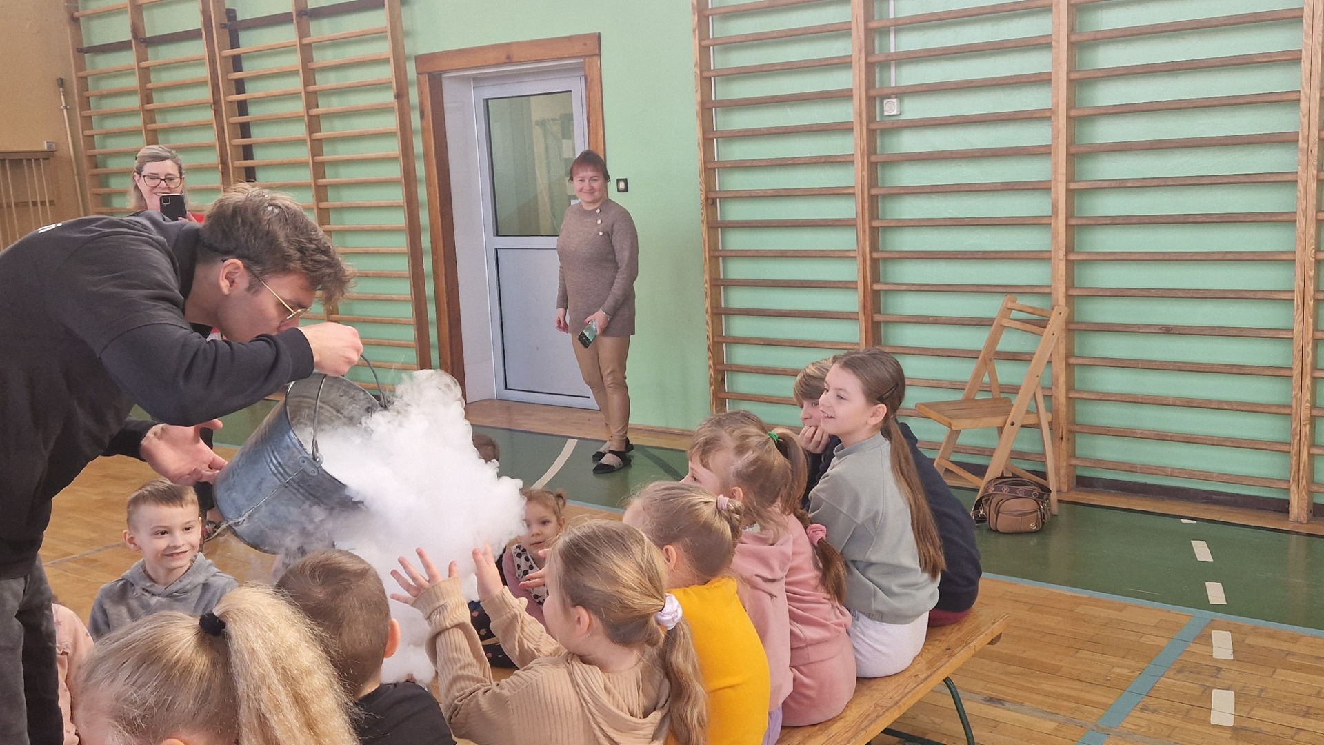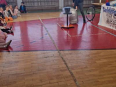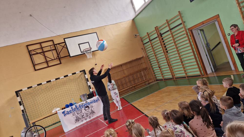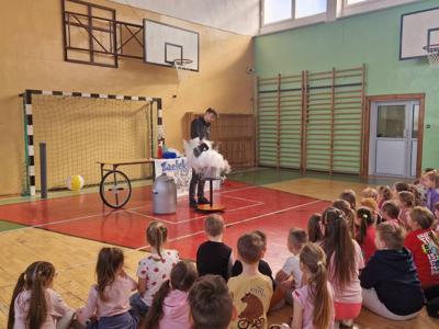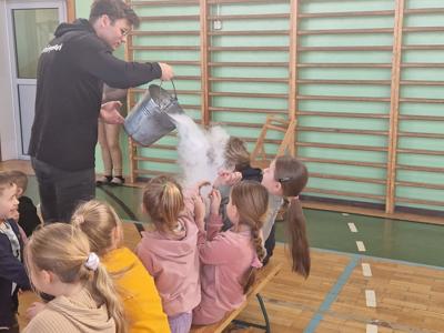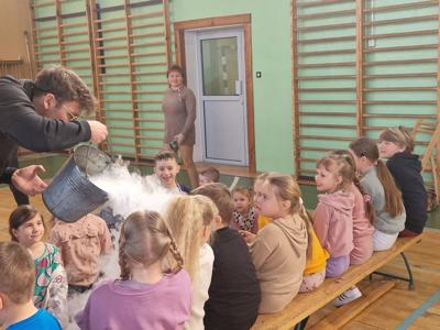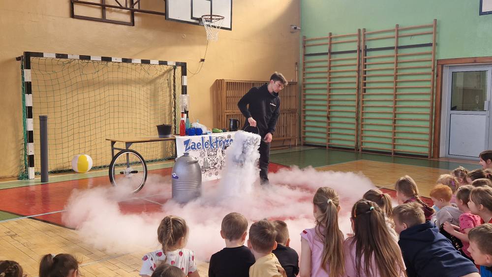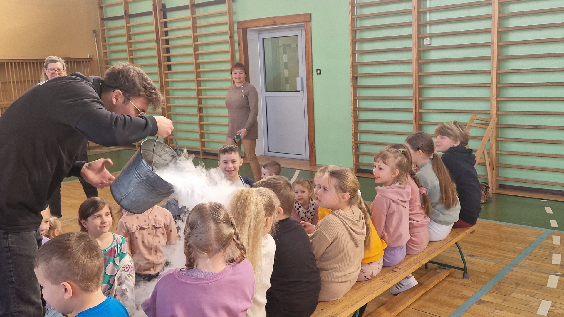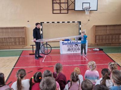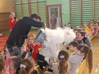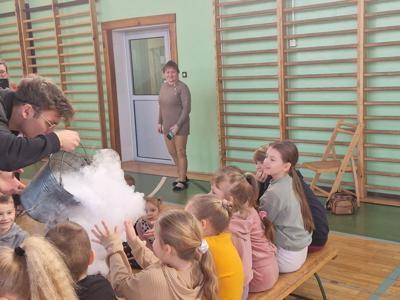 Dziś nasza sala gimnastyczna zamieniła się w laboratorium fizyczno – chemiczne, dzięki prowadzącemu z grupy „Zaelektryzowani”, który w bardzo ciekawy sposób przybliżył uczniom wiedzę z zakresu fizyki i chemii. W czasie tej niecodziennej lekcji nasz gość zaprezentował widowiskowe eksperymenty i doświadczenia związane z naukami przyrodniczymi. Dotyczyły one m.in. mechaniki płynów, grawitacji, właściwości butanu czy ciekłego azotu,siły odśrodkowej, efektu żyroskopowego. Dzieci aktywnie brały udział w pokazie. Mogły bezpośrednio zaobserwować zjawisko lewitującej piłki, nadmuchiwanie rękawa foliowego czy „palącej się” podłogi w szkole