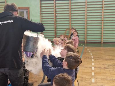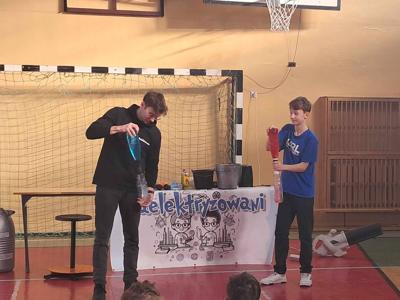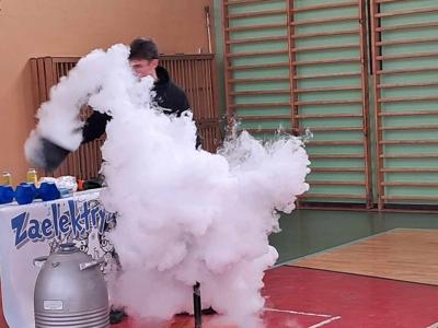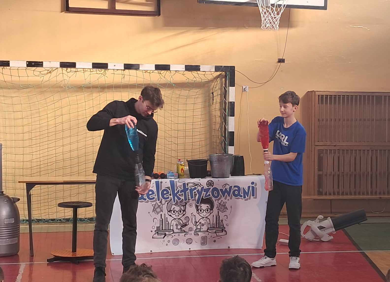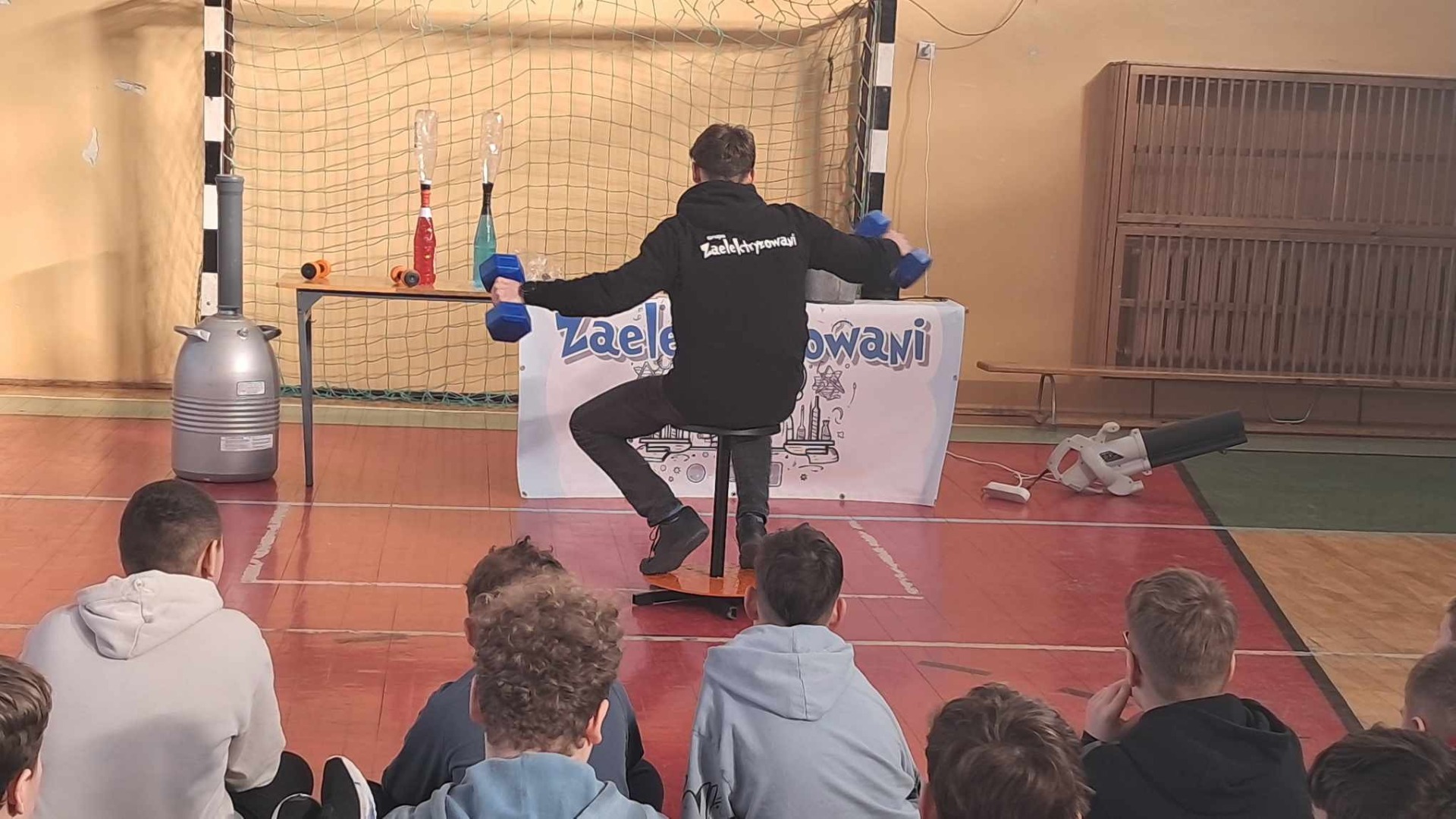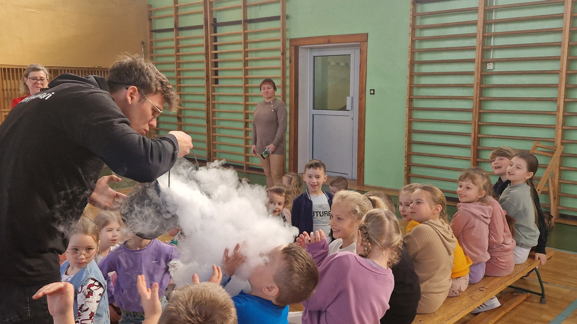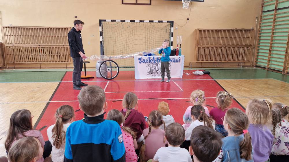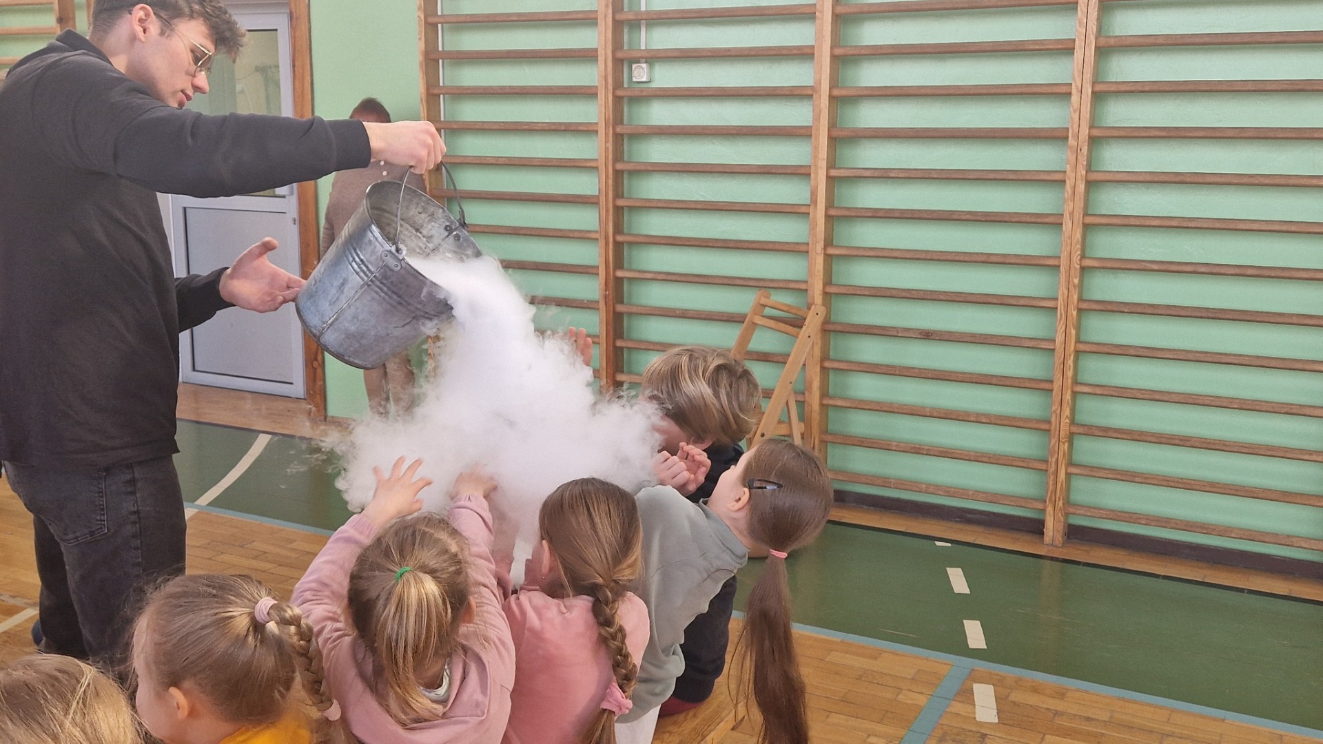 Dziś nasza sala gimnastyczna zamieniła się w laboratorium fizyczno – chemiczne, dzięki prowadzącemu z grupy „Zaelektryzowani”, który w bardzo ciekawy sposób przybliżył uczniom wiedzę z zakresu fizyki i chemii. W czasie tej niecodziennej lekcji nasz gość zaprezentował widowiskowe eksperymenty i doświadczenia związane z naukami przyrodniczymi. Dotyczyły one m.in. mechaniki płynów, grawitacji, właściwości butanu czy ciekłego azotu,siły odśrodkowej, efektu żyroskopowego. Dzieci aktywnie brały udział w pokazie. Mogły bezpośrednio zaobserwować zjawisko lewitującej piłki, nadmuchiwanie rękawa foliowego czy „palącej się” podłogi w szkole
