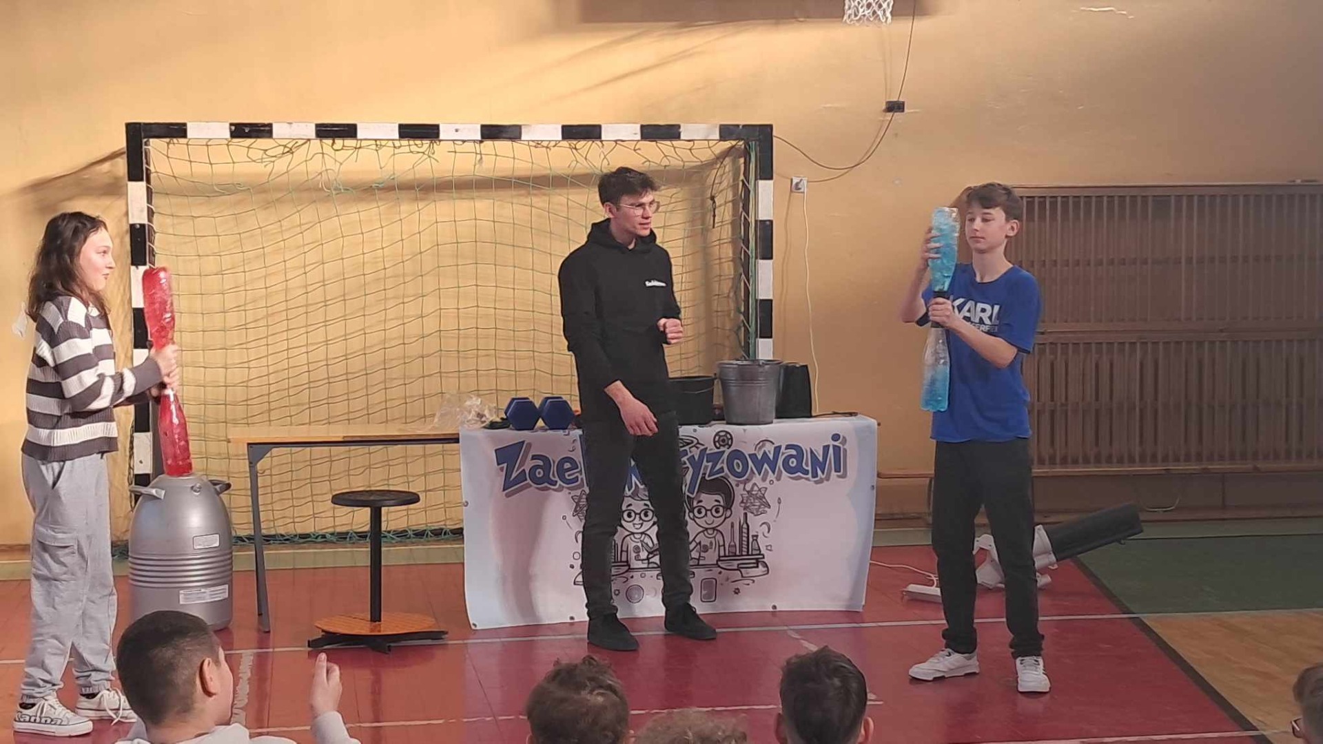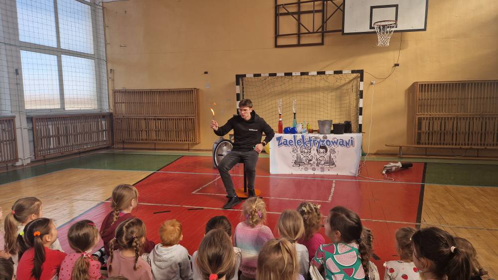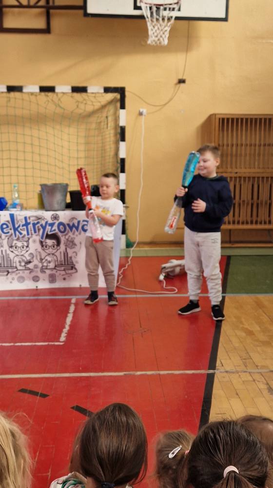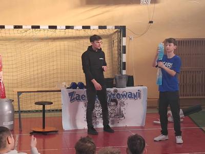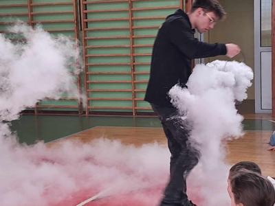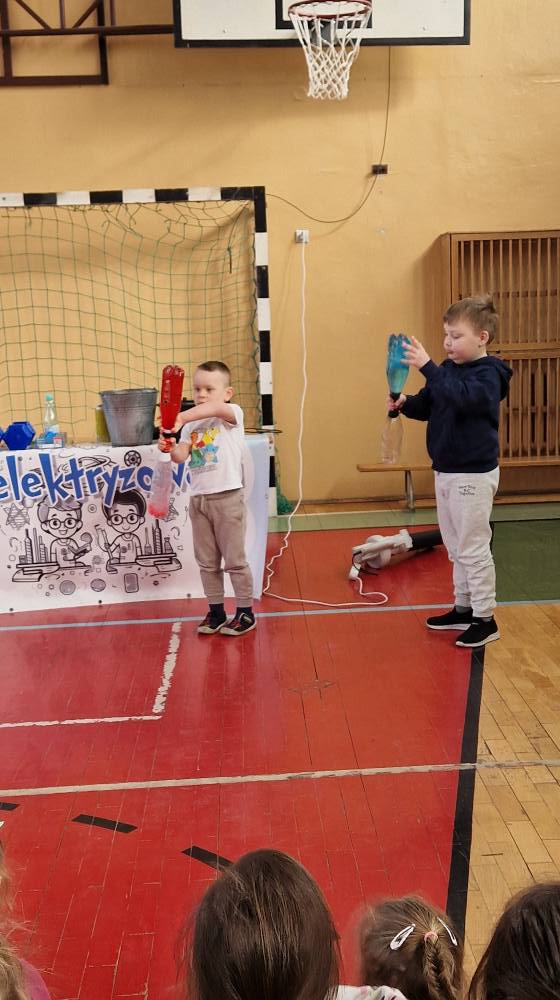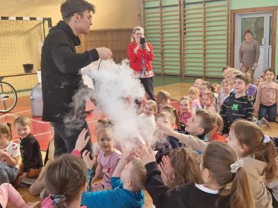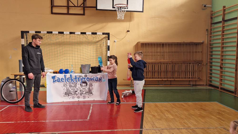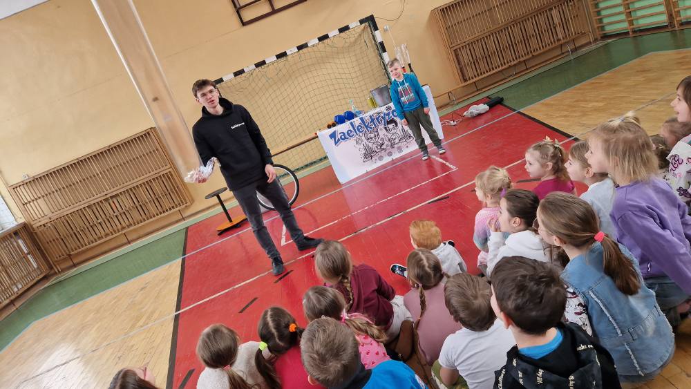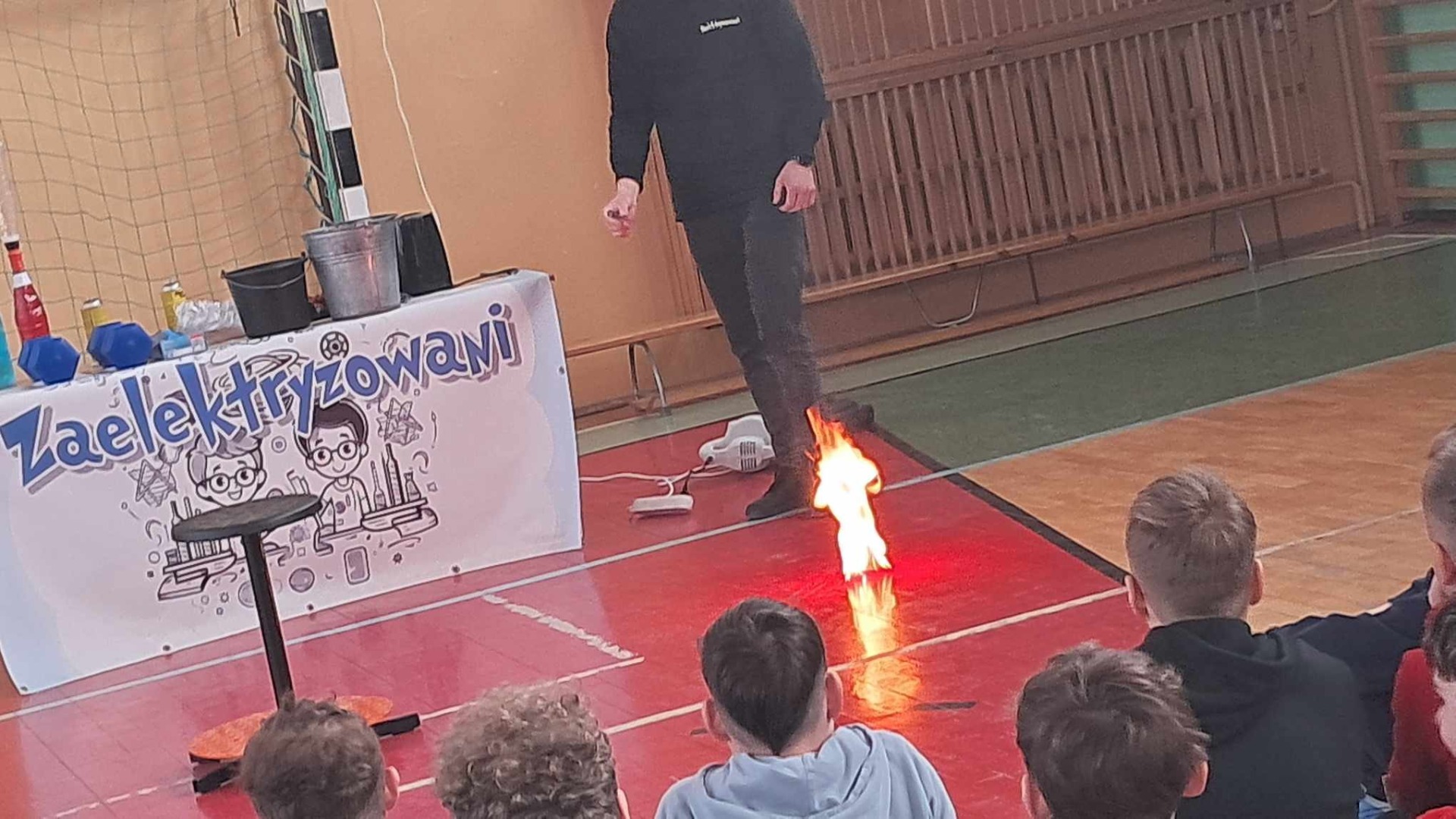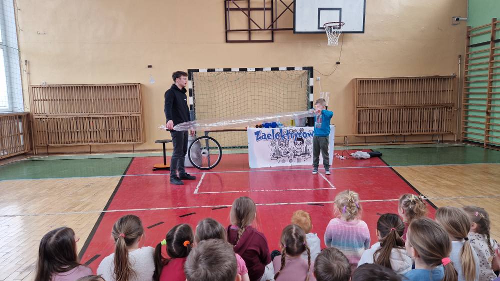 Dziś nasza sala gimnastyczna zamieniła się w laboratorium fizyczno – chemiczne, dzięki prowadzącemu z grupy „Zaelektryzowani”, który w bardzo ciekawy sposób przybliżył uczniom wiedzę z zakresu fizyki i chemii. W czasie tej niecodziennej lekcji nasz gość zaprezentował widowiskowe eksperymenty i doświadczenia związane z naukami przyrodniczymi. Dotyczyły one m.in. mechaniki płynów, grawitacji, właściwości butanu czy ciekłego azotu,siły odśrodkowej, efektu żyroskopowego. Dzieci aktywnie brały udział w pokazie. Mogły bezpośrednio zaobserwować zjawisko lewitującej piłki, nadmuchiwanie rękawa foliowego czy „palącej się” podłogi w szkole
