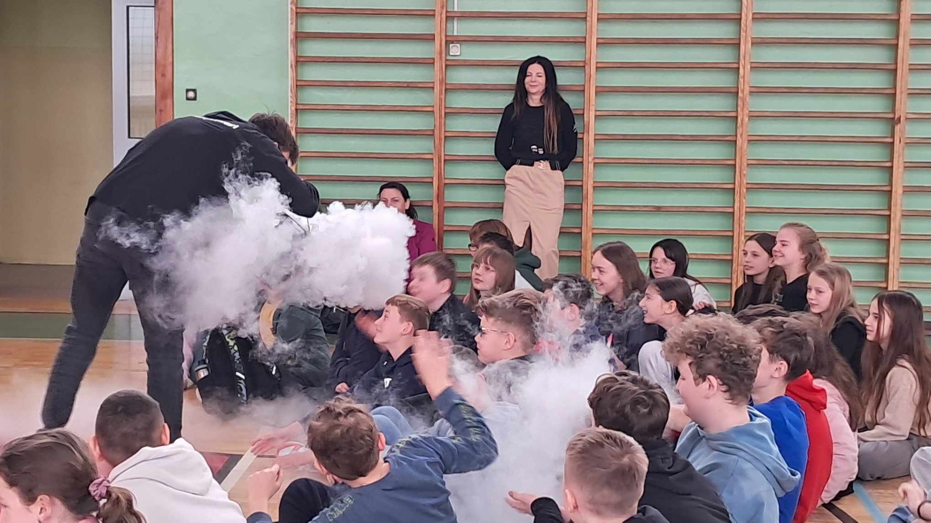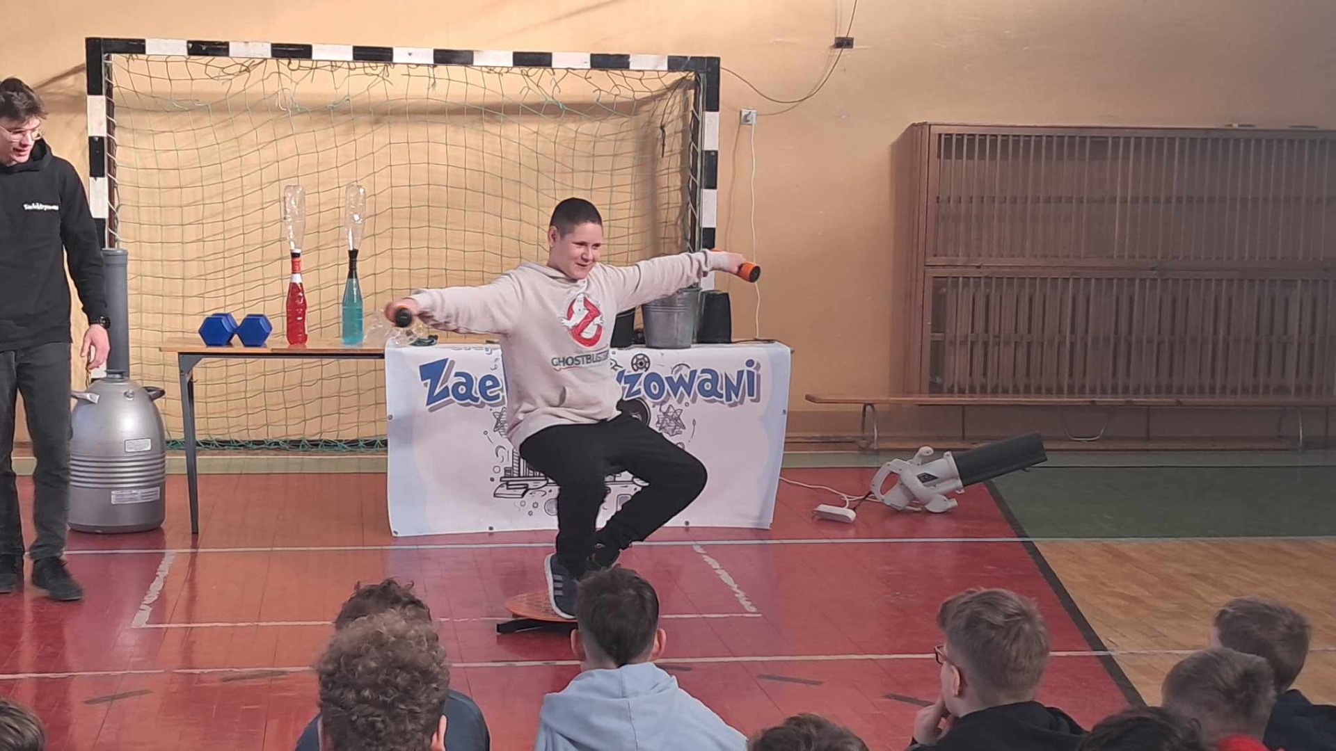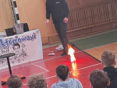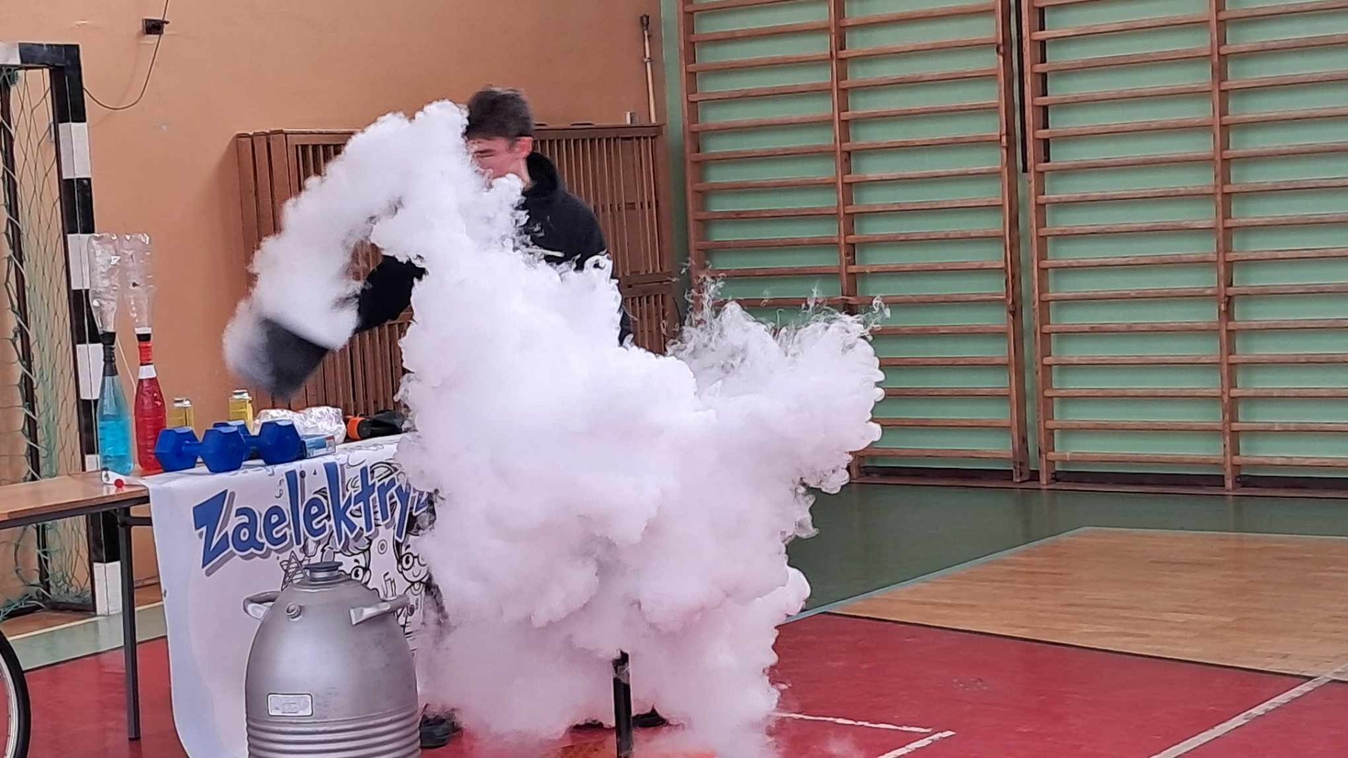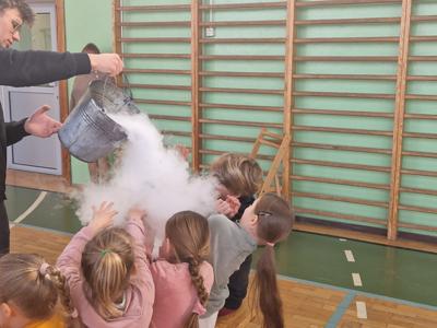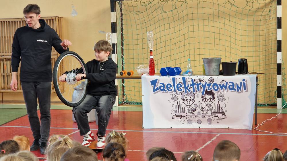 Dziś nasza sala gimnastyczna zamieniła się w laboratorium fizyczno – chemiczne, dzięki prowadzącemu z grupy „Zaelektryzowani”, który w bardzo ciekawy sposób przybliżył uczniom wiedzę z zakresu fizyki i chemii. W czasie tej niecodziennej lekcji nasz gość zaprezentował widowiskowe eksperymenty i doświadczenia związane z naukami przyrodniczymi. Dotyczyły one m.in. mechaniki płynów, grawitacji, właściwości butanu czy ciekłego azotu,siły odśrodkowej, efektu żyroskopowego. Dzieci aktywnie brały udział w pokazie. Mogły bezpośrednio zaobserwować zjawisko lewitującej piłki, nadmuchiwanie rękawa foliowego czy „palącej się” podłogi w szkole