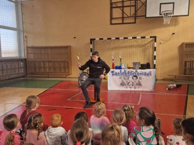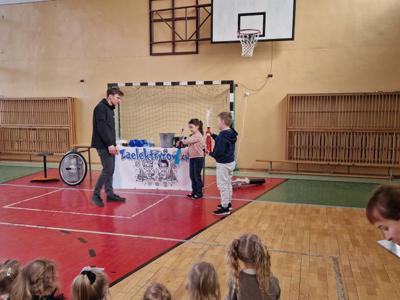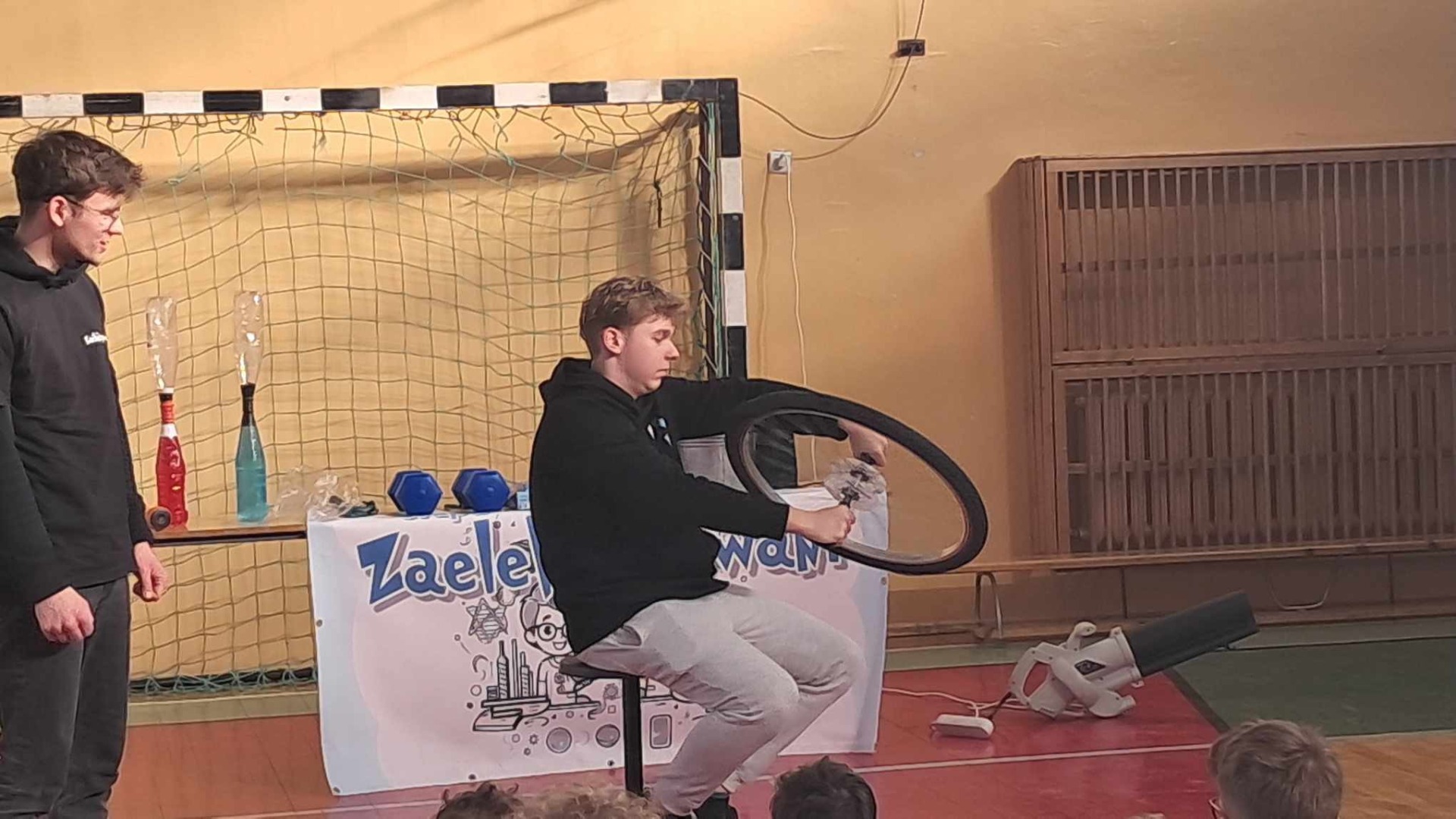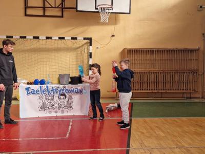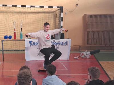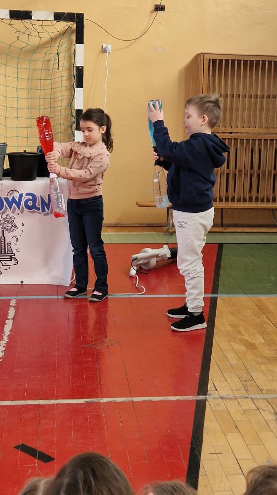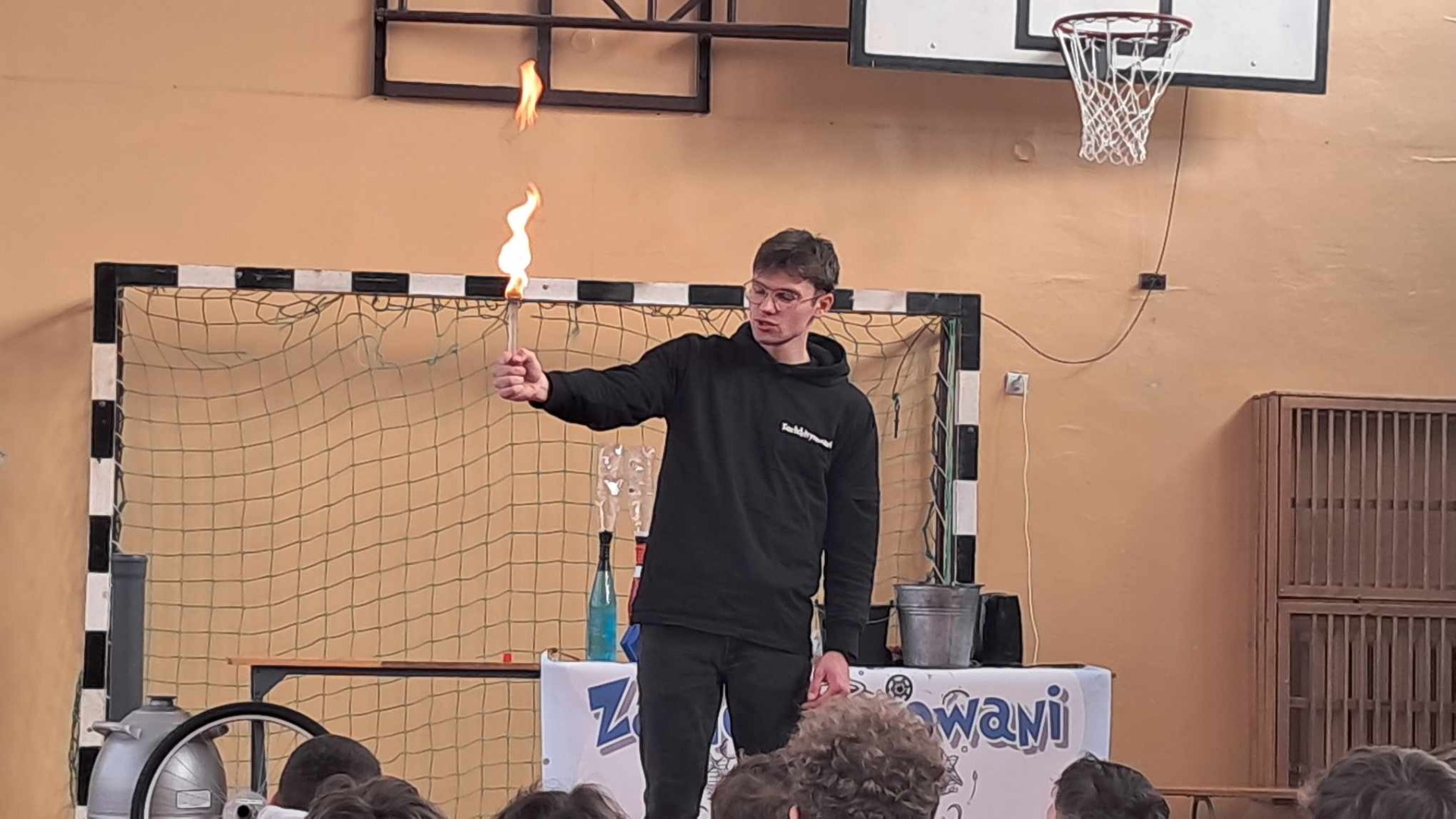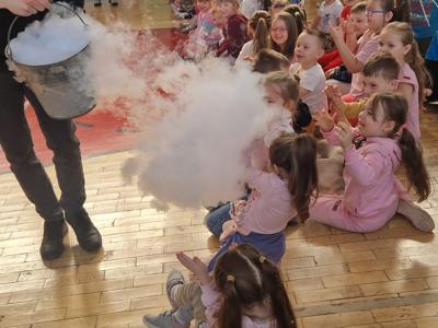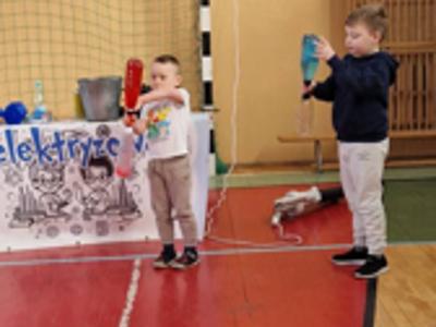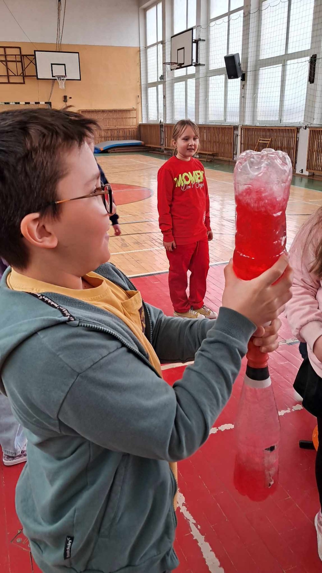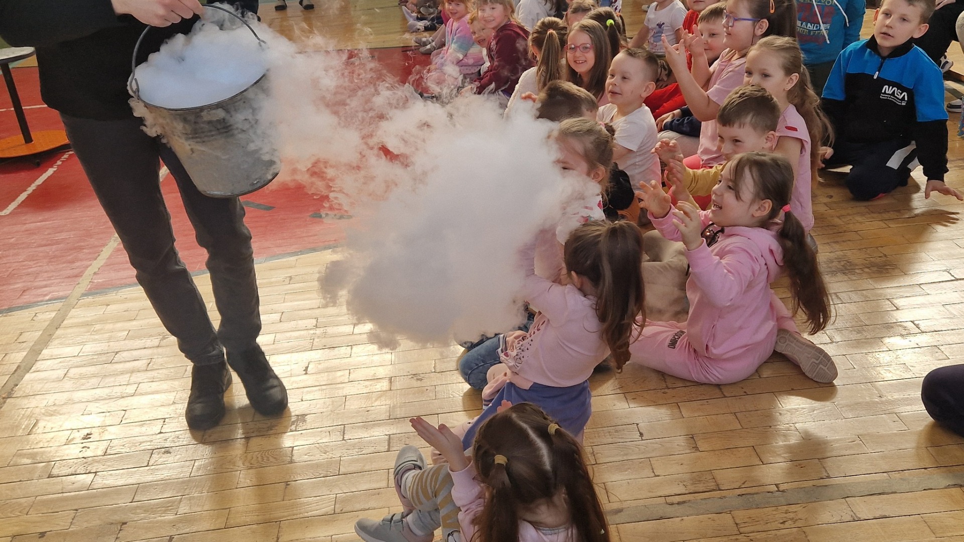 Dziś nasza sala gimnastyczna zamieniła się w laboratorium fizyczno – chemiczne, dzięki prowadzącemu z grupy „Zaelektryzowani”, który w bardzo ciekawy sposób przybliżył uczniom wiedzę z zakresu fizyki i chemii. W czasie tej niecodziennej lekcji nasz gość zaprezentował widowiskowe eksperymenty i doświadczenia związane z naukami przyrodniczymi. Dotyczyły one m.in. mechaniki płynów, grawitacji, właściwości butanu czy ciekłego azotu,siły odśrodkowej, efektu żyroskopowego. Dzieci aktywnie brały udział w pokazie. Mogły bezpośrednio zaobserwować zjawisko lewitującej piłki, nadmuchiwanie rękawa foliowego czy „palącej się” podłogi w szkole