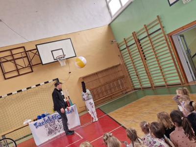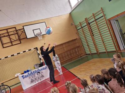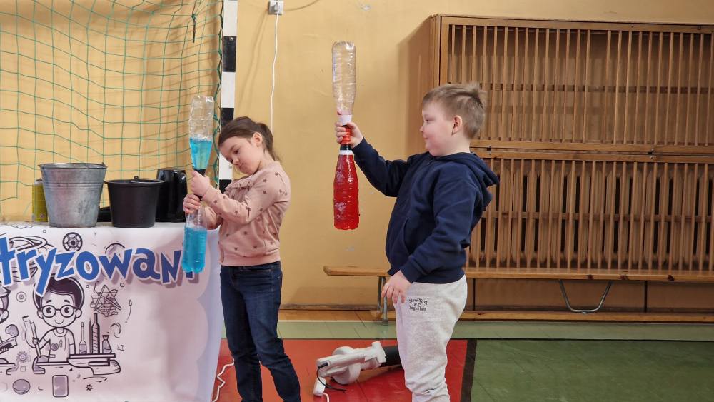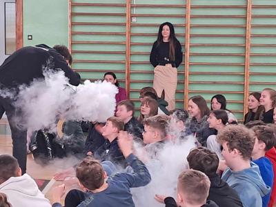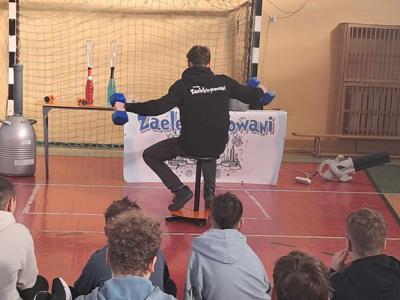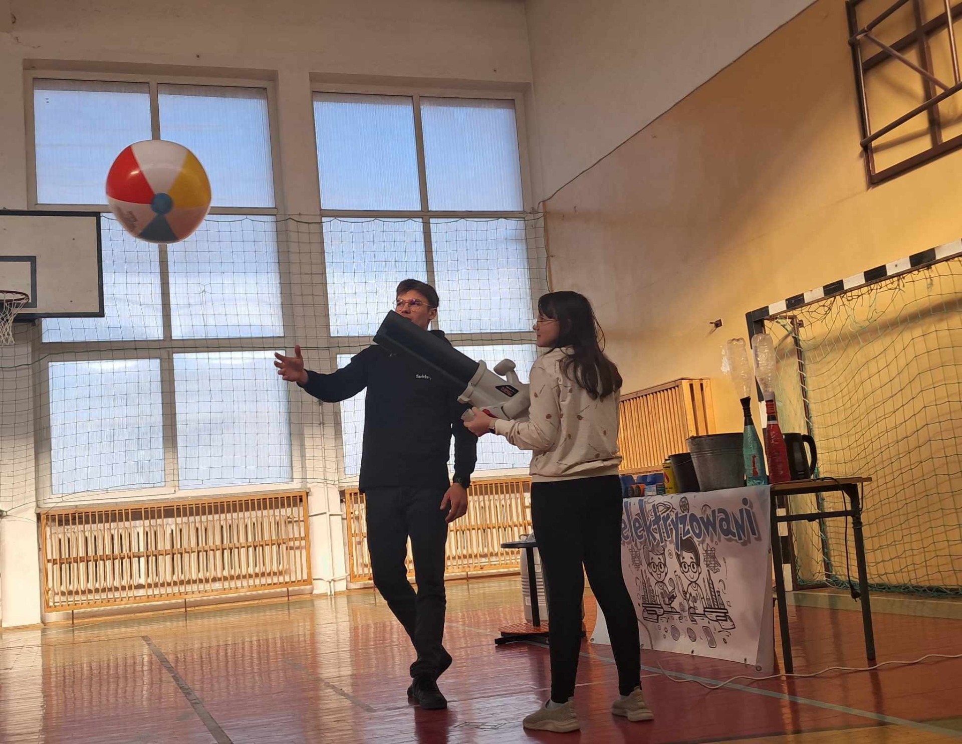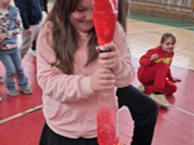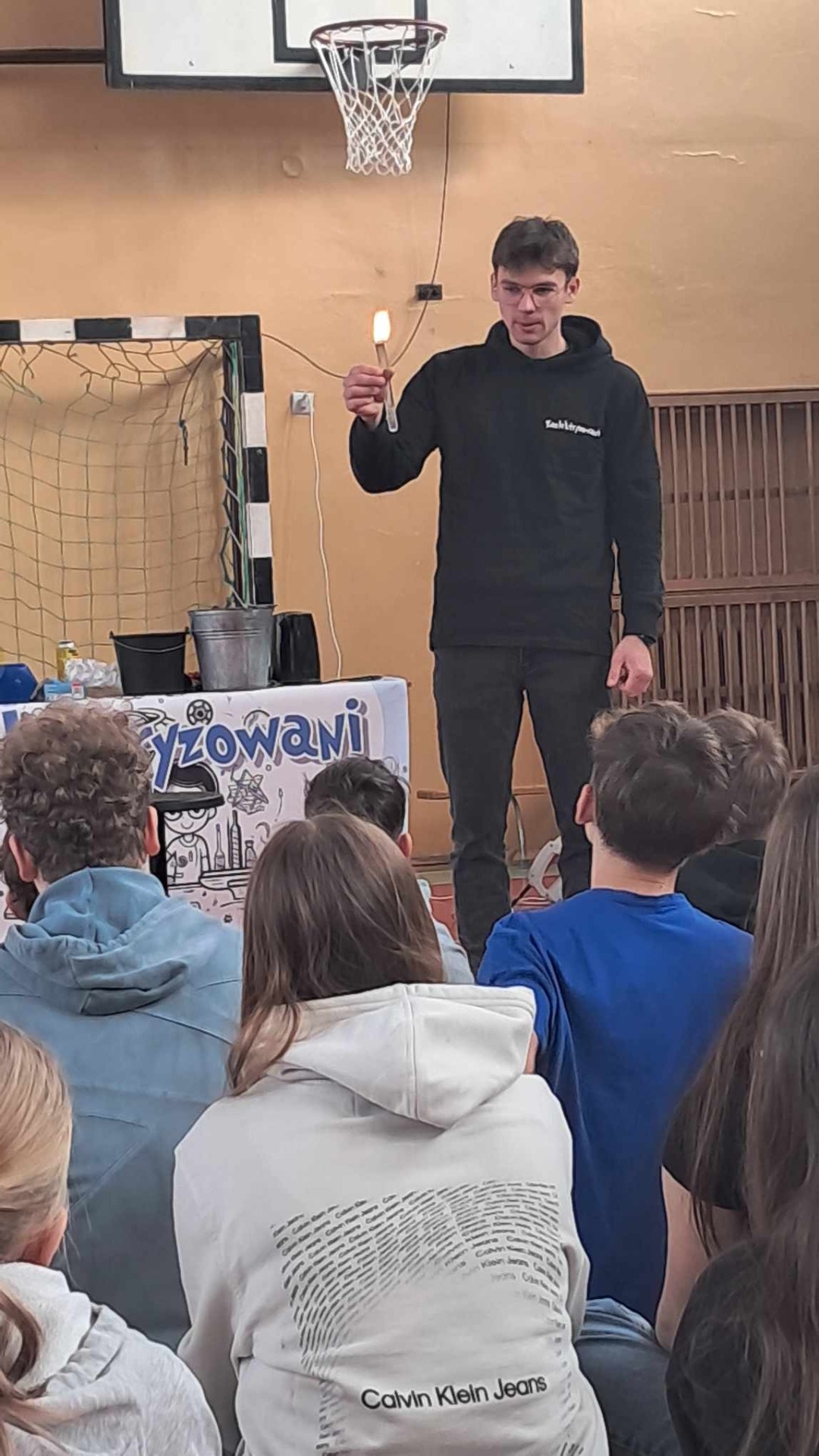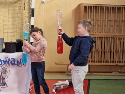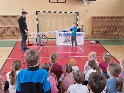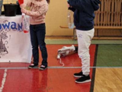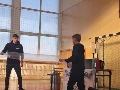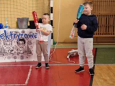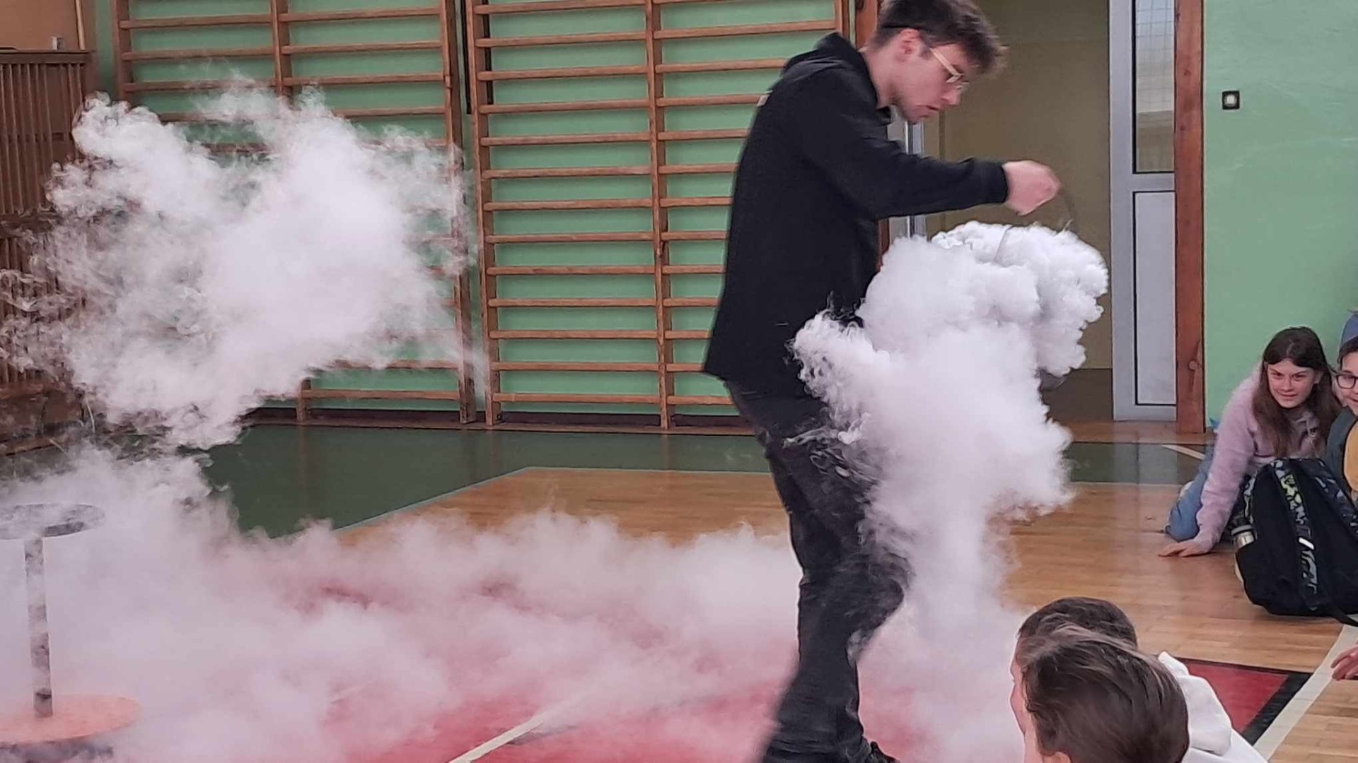 Dziś nasza sala gimnastyczna zamieniła się w laboratorium fizyczno – chemiczne, dzięki prowadzącemu z grupy „Zaelektryzowani”, który w bardzo ciekawy sposób przybliżył uczniom wiedzę z zakresu fizyki i chemii. W czasie tej niecodziennej lekcji nasz gość zaprezentował widowiskowe eksperymenty i doświadczenia związane z naukami przyrodniczymi. Dotyczyły one m.in. mechaniki płynów, grawitacji, właściwości butanu czy ciekłego azotu,siły odśrodkowej, efektu żyroskopowego. Dzieci aktywnie brały udział w pokazie. Mogły bezpośrednio zaobserwować zjawisko lewitującej piłki, nadmuchiwanie rękawa foliowego czy „palącej się” podłogi w szkole