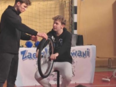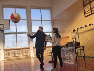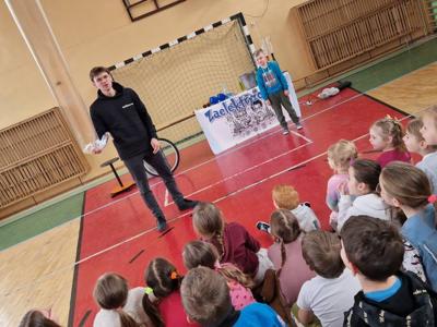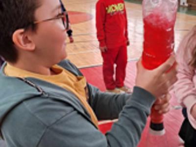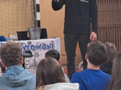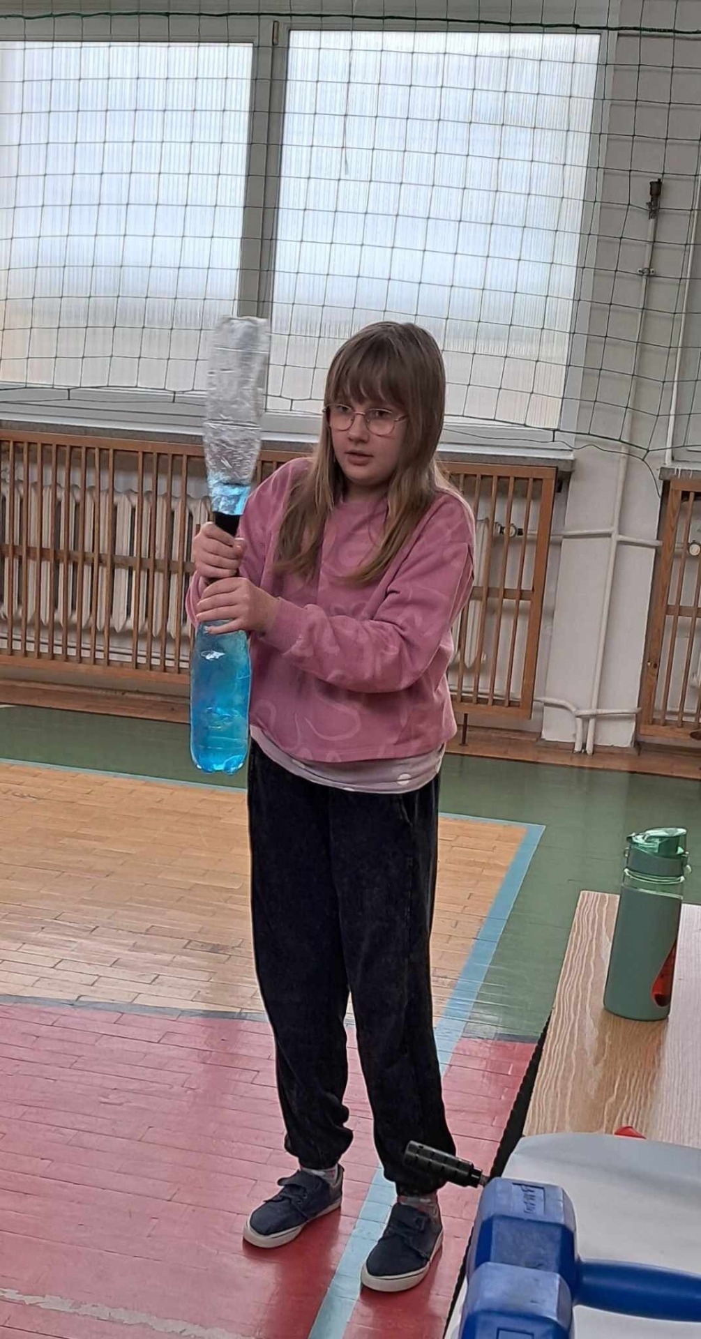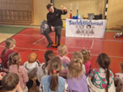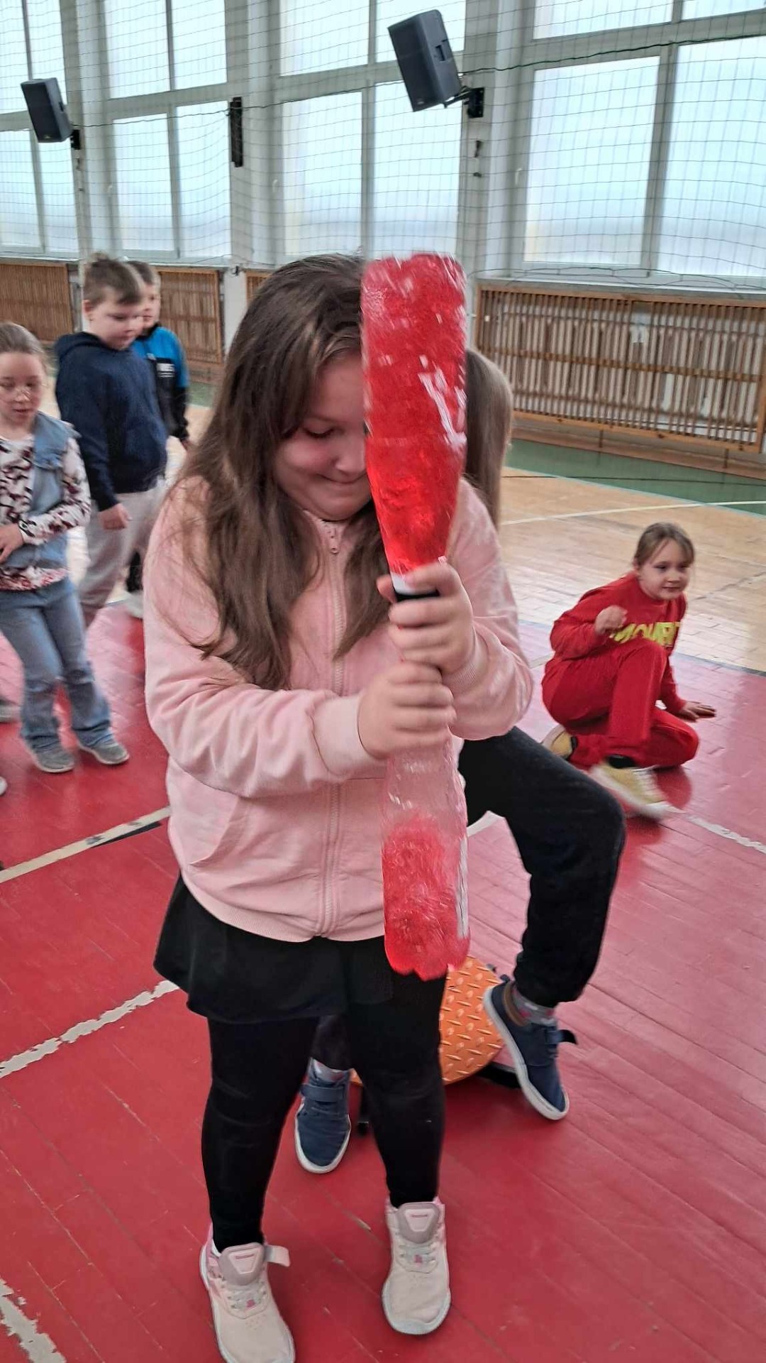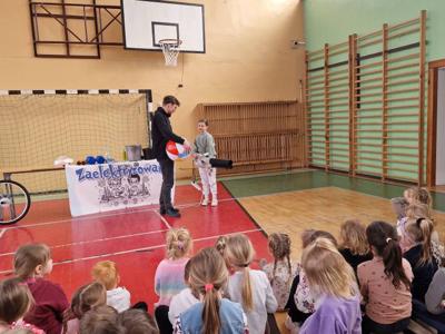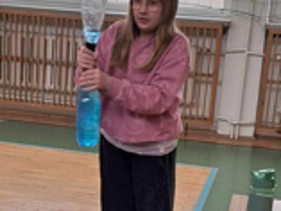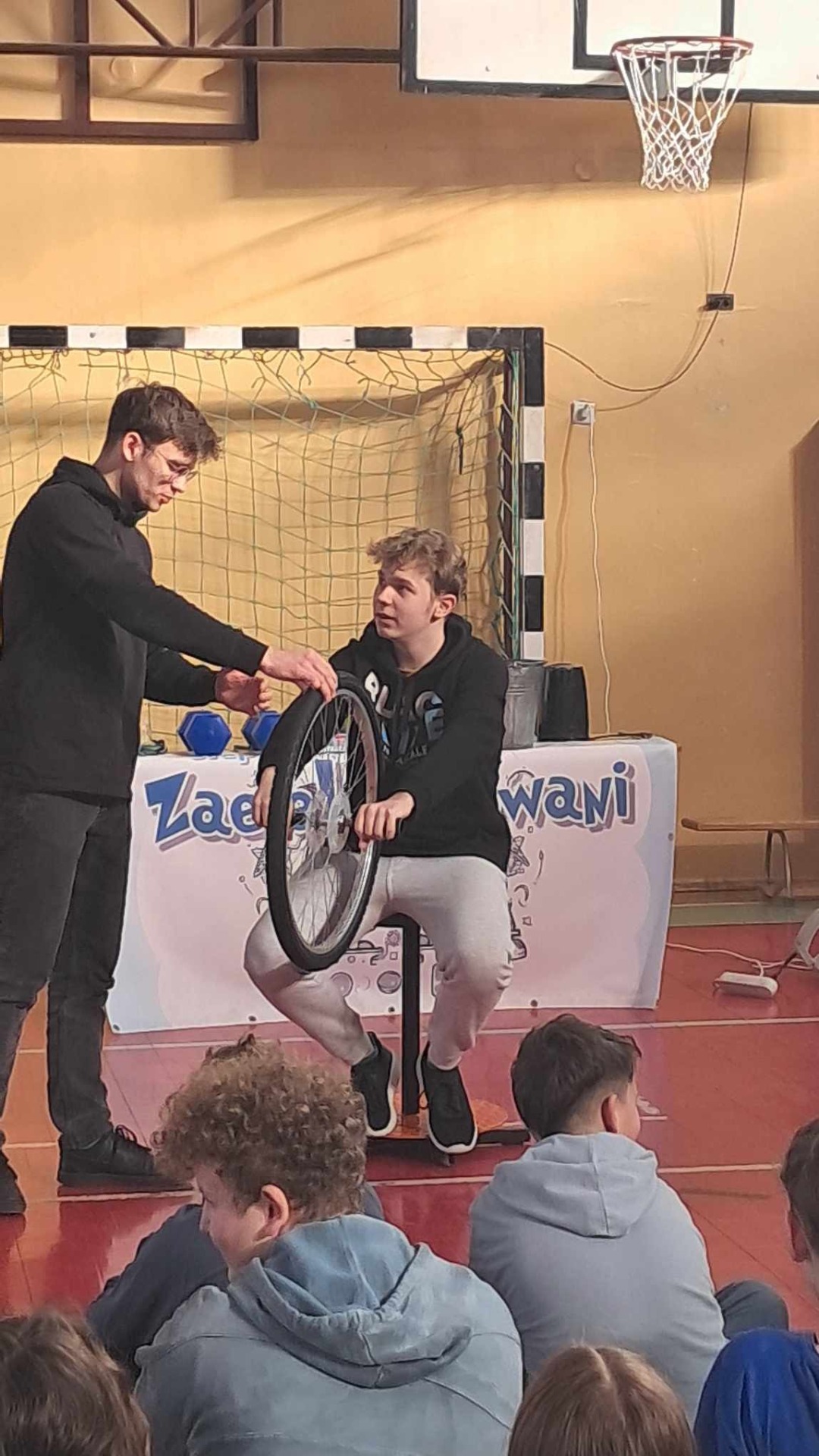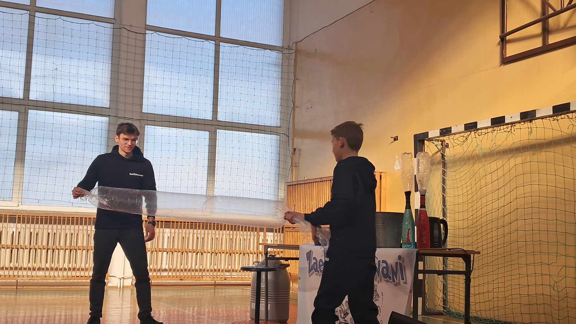 Dziś nasza sala gimnastyczna zamieniła się w laboratorium fizyczno – chemiczne, dzięki prowadzącemu z grupy „Zaelektryzowani”, który w bardzo ciekawy sposób przybliżył uczniom wiedzę z zakresu fizyki i chemii. W czasie tej niecodziennej lekcji nasz gość zaprezentował widowiskowe eksperymenty i doświadczenia związane z naukami przyrodniczymi. Dotyczyły one m.in. mechaniki płynów, grawitacji, właściwości butanu czy ciekłego azotu,siły odśrodkowej, efektu żyroskopowego. Dzieci aktywnie brały udział w pokazie. Mogły bezpośrednio zaobserwować zjawisko lewitującej piłki, nadmuchiwanie rękawa foliowego czy „palącej się” podłogi w szkole