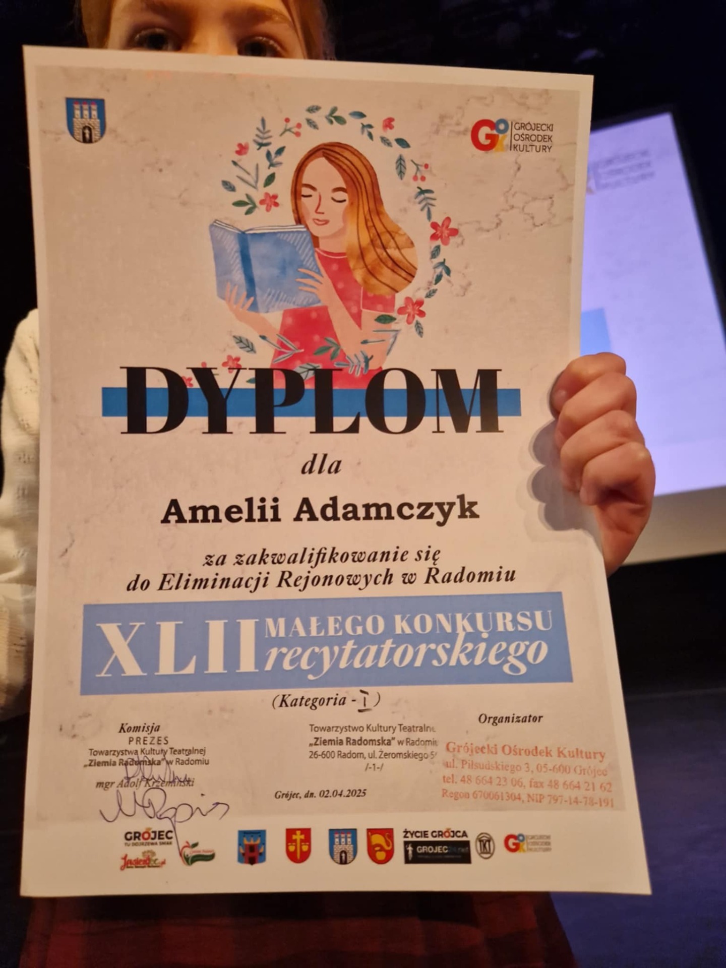 Pani Dyrektor Agata Kępka składa naszym uczennicom gratulacje oraz życzy Amelii Adamczyk powodzenia w Eliminacjach Rejonowych w Radomiu, które odbędą się 22 maja