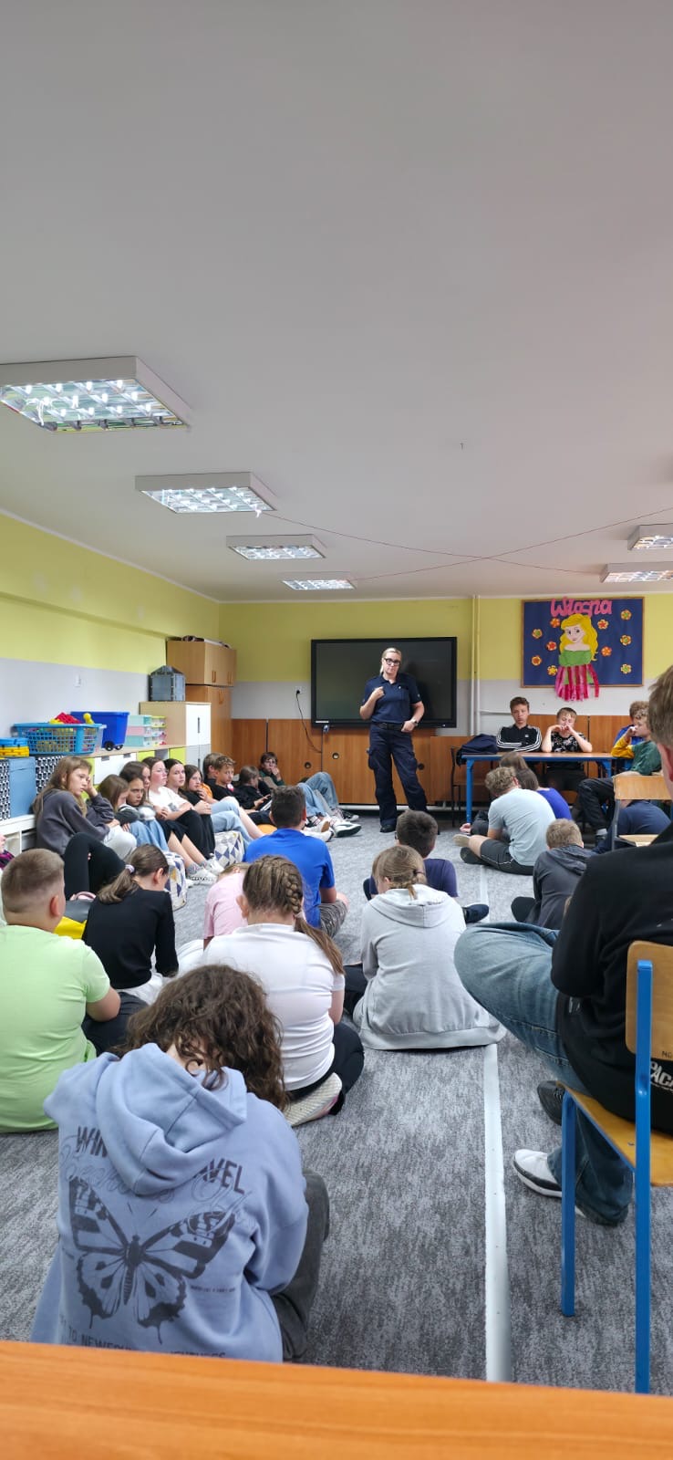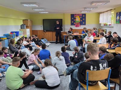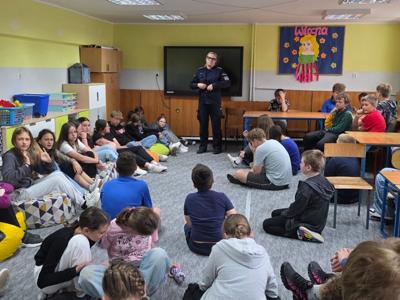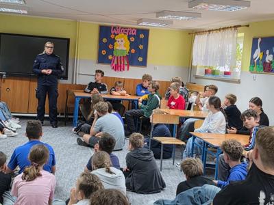 Spotkanie poprowadziła asp. sztab. Ewelina Kozdruj, która w sposób przystępny i dostosowany do wieku uczniów omówiła kluczowe zagadnienia związane z: