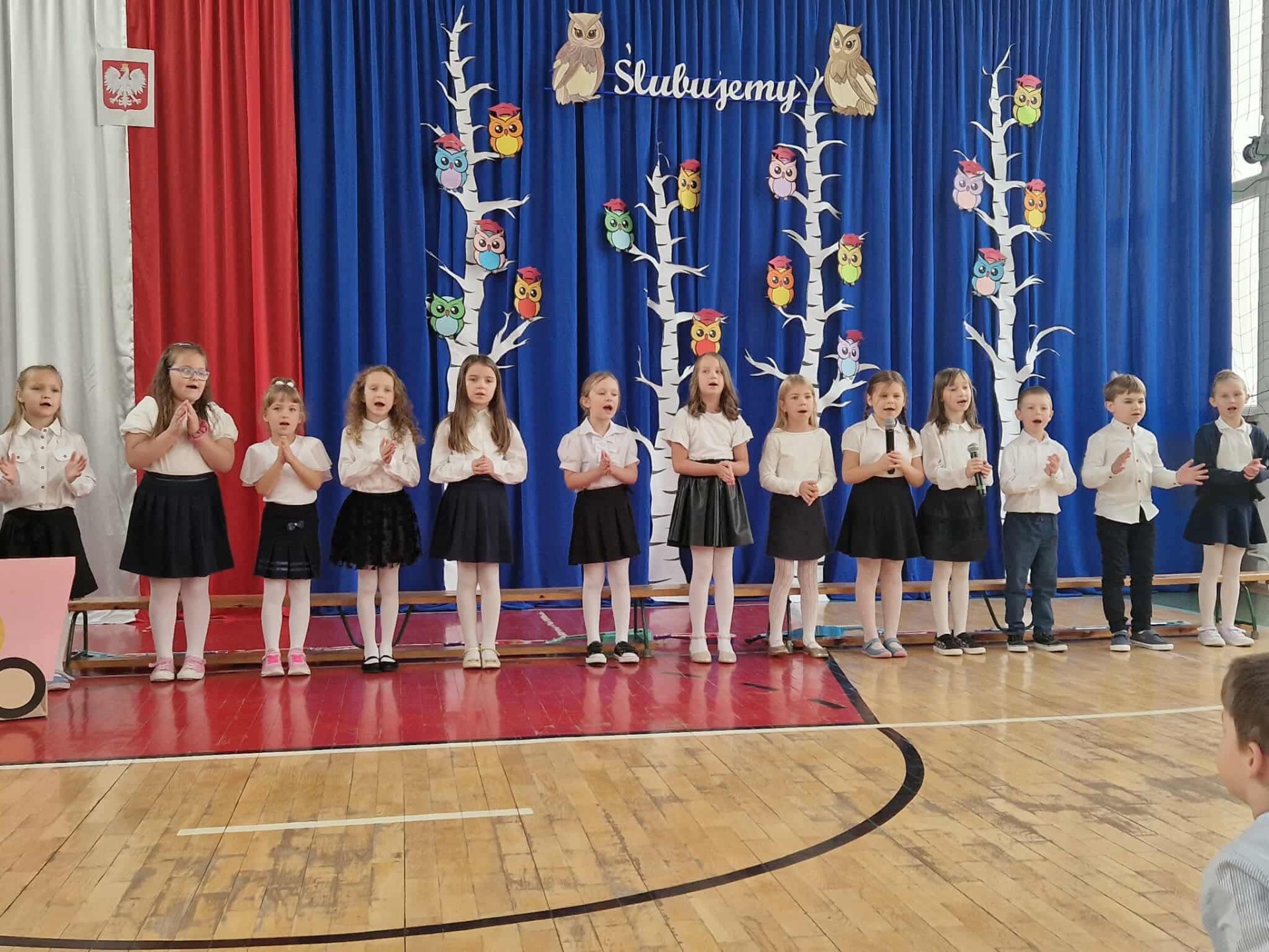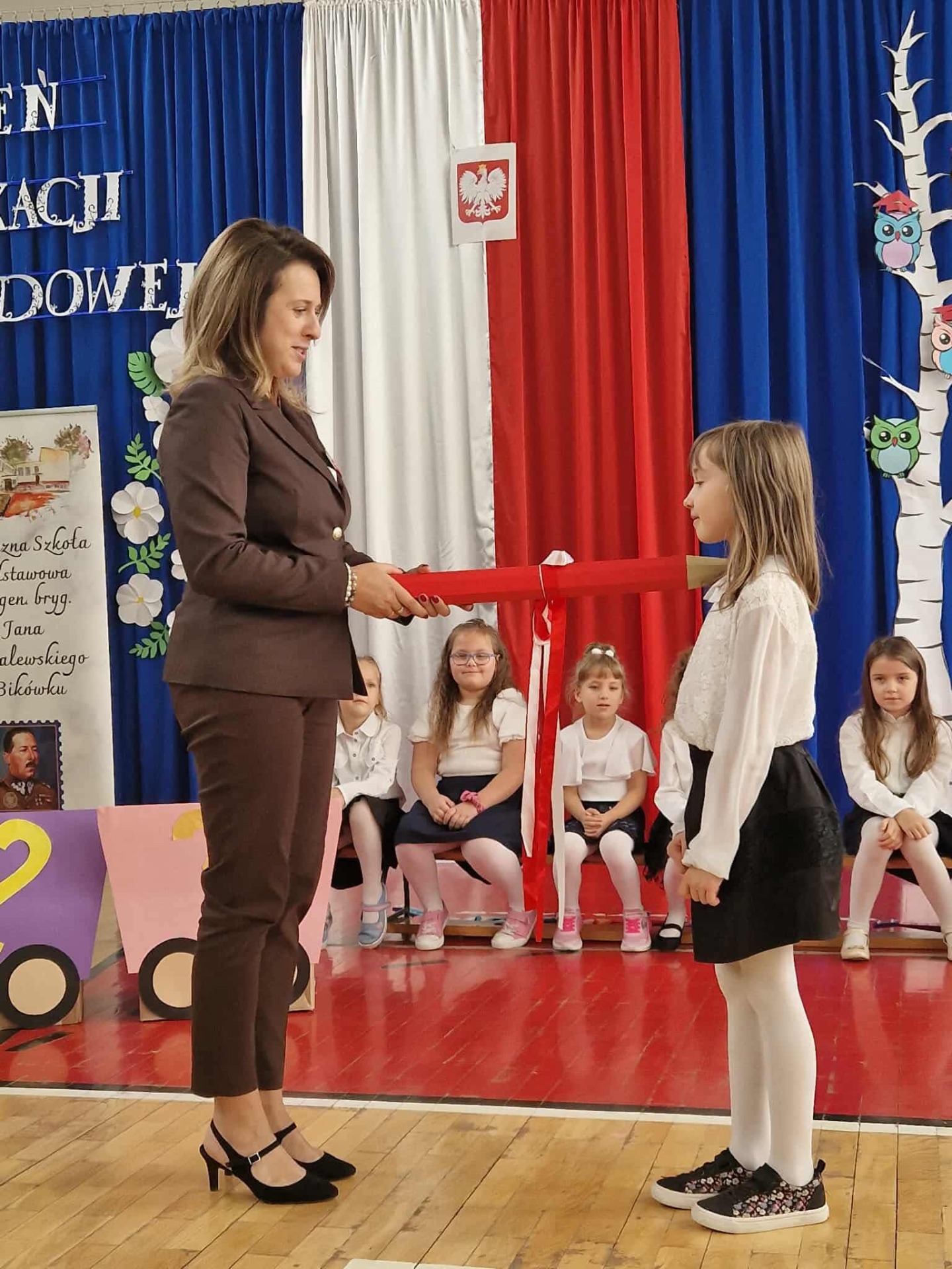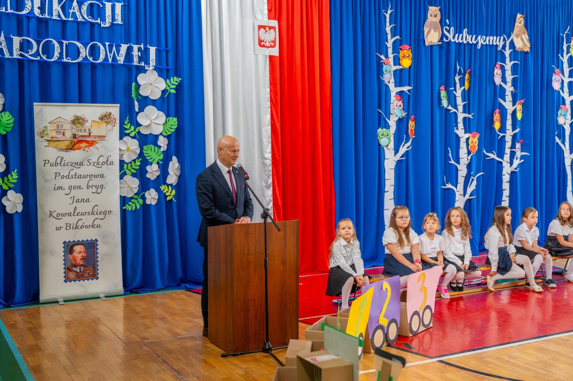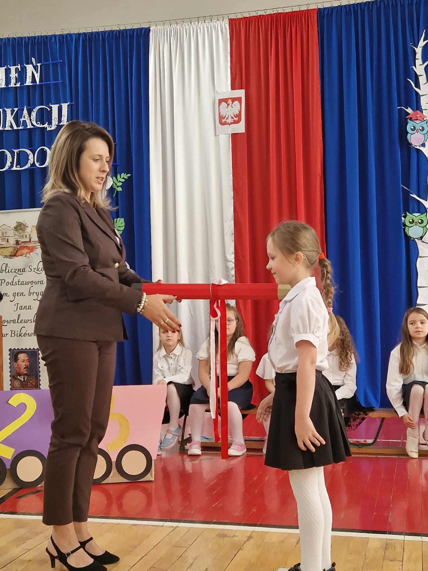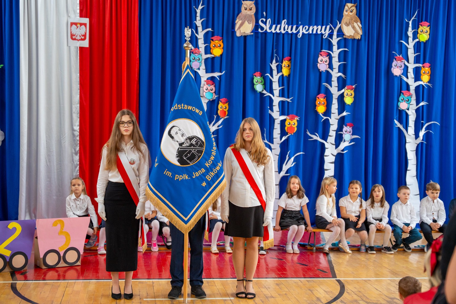 Pierwszoklasiści z dumą złożyli ślubowanie, obiecując być pilnymi uczniami i godnie reprezentować Publiczną Szkołę Podstawową im. gen. bryg. Jana Kowalewskiego w Bikówku. Następnie zostali pasowani przez Panią Dyrektor Agatę Kępkę na uczniów – to był dla nich prawdziwie wzruszający moment.