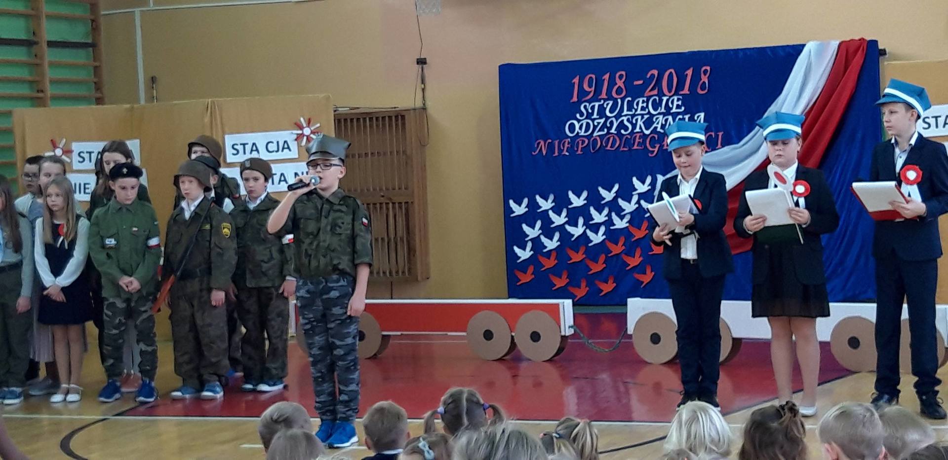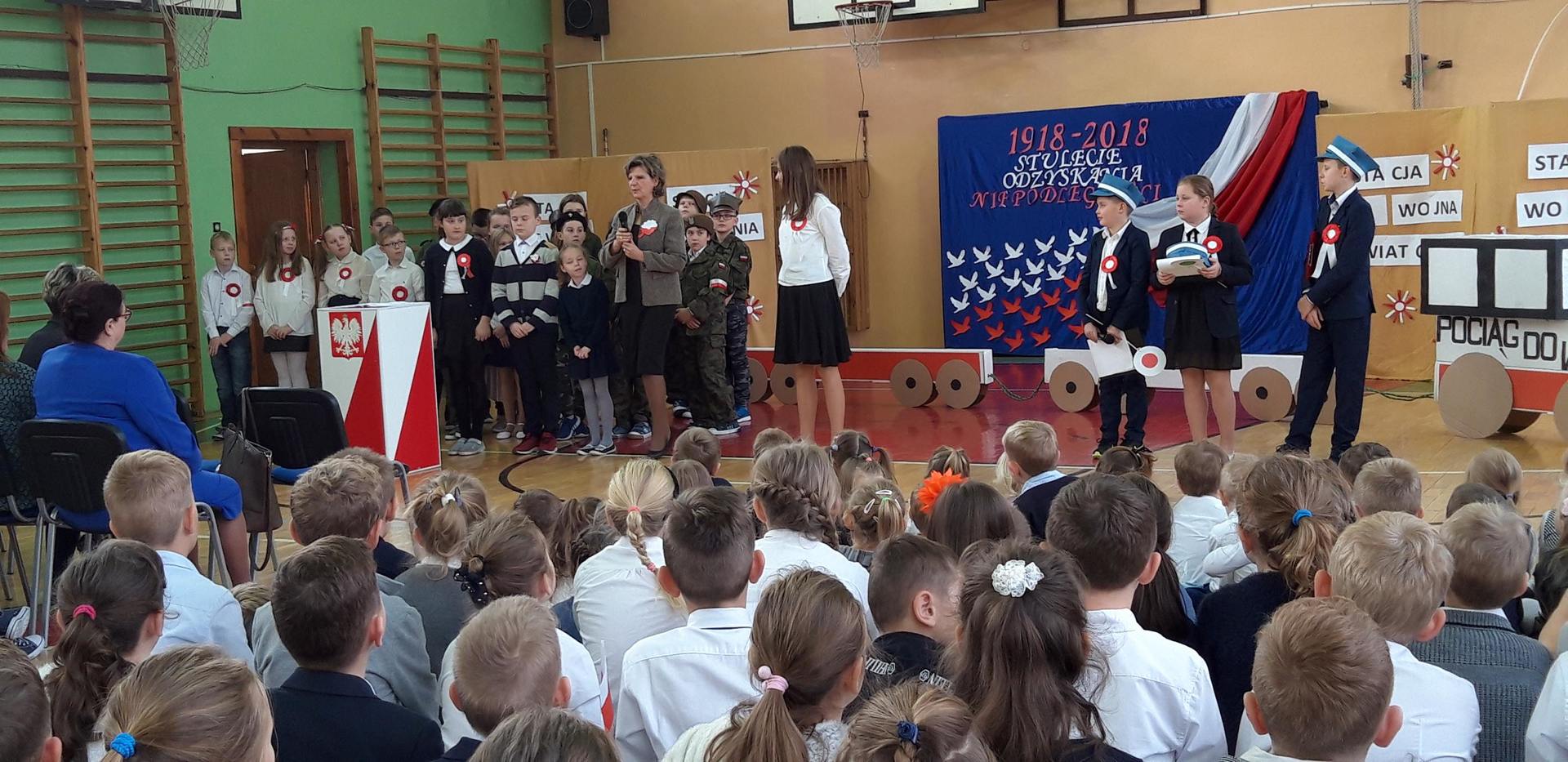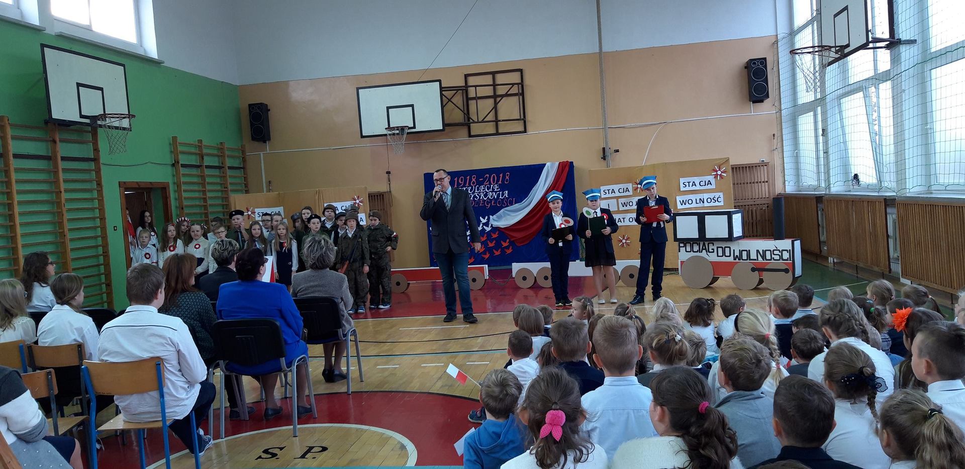 Dnia 13 listopada o godzinie 9.00 odświętnie ubrani zebraliśmy się w sali gimnastycznej, by uczcić 100 rocznicę Odzyskania Niepodległości.