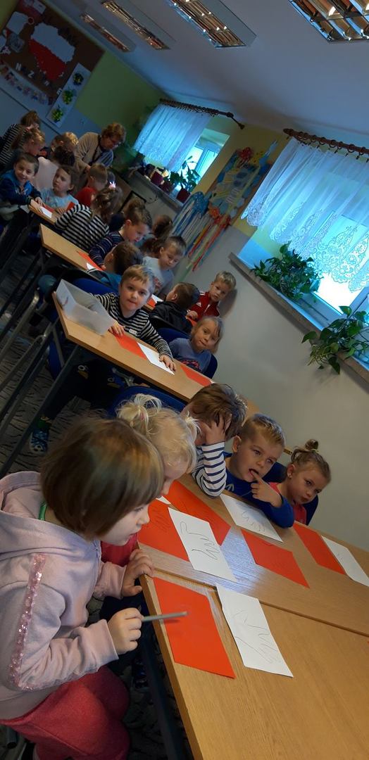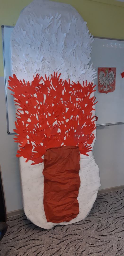 Dzieci doskonale potrafiły wymienić symbole, opowiedzieć o ich wyglądzie. Wspólnie zaśpiewaliśmy hymn narodowy. Następnie uczniowie wycięli rączki w barwach ojczystych, które pięknie prezentują się w formie drzewa na szkolnym korytarzu. Na koniec uczennice, przygotowujące się do konkursu recytatorskiego zaprezentowały wiersze patriotyczne.