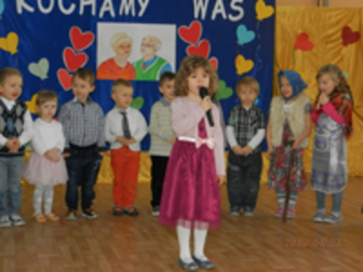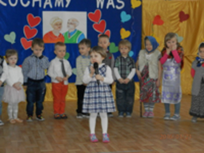 Licznie przybyli goście zgromadzili się na sali gimnastycznej i z niecierpliwością czekali na występ swoich wnucząt. Dzieci zostały powitane oklaskami, a na ich twarzach widać było radość i skupienie. Każdy miał swoją rolę, którą wspaniale zaprezentował. Były również inscenizacje, tańce i piosenki. Cały program został nagrodzony ogromnymi brawami. Następnie przedszkolaki wręczyły dziadkom własnoręcznie wykonane prezenty. Wszyscy z dumą patrzyli na wnuczęta, które włożyły wiele wysiłku w to, aby wyrazić swoją miłość i szacunek. Po części artystycznej babcie i dziadkowie zostali zaproszeni na słodki poczęstunek przygotowany przez rodziców. Wszystkim towarzyszyły radość, uśmiech i łzy wzruszenia. Mamy nadzieję, że ten dzień na długo pozostanie w pamięci dziadków i dzieci.