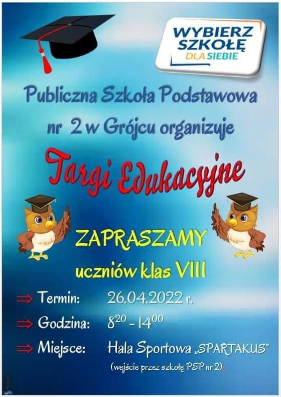 Publiczna Szkoła Podstawowa nr 2 w Grójcu zaprasza ósmoklasistów na TARGI EDUKACYJNE 📚 w związku z wyborem szkoły ponadpodstawowej! 🎓